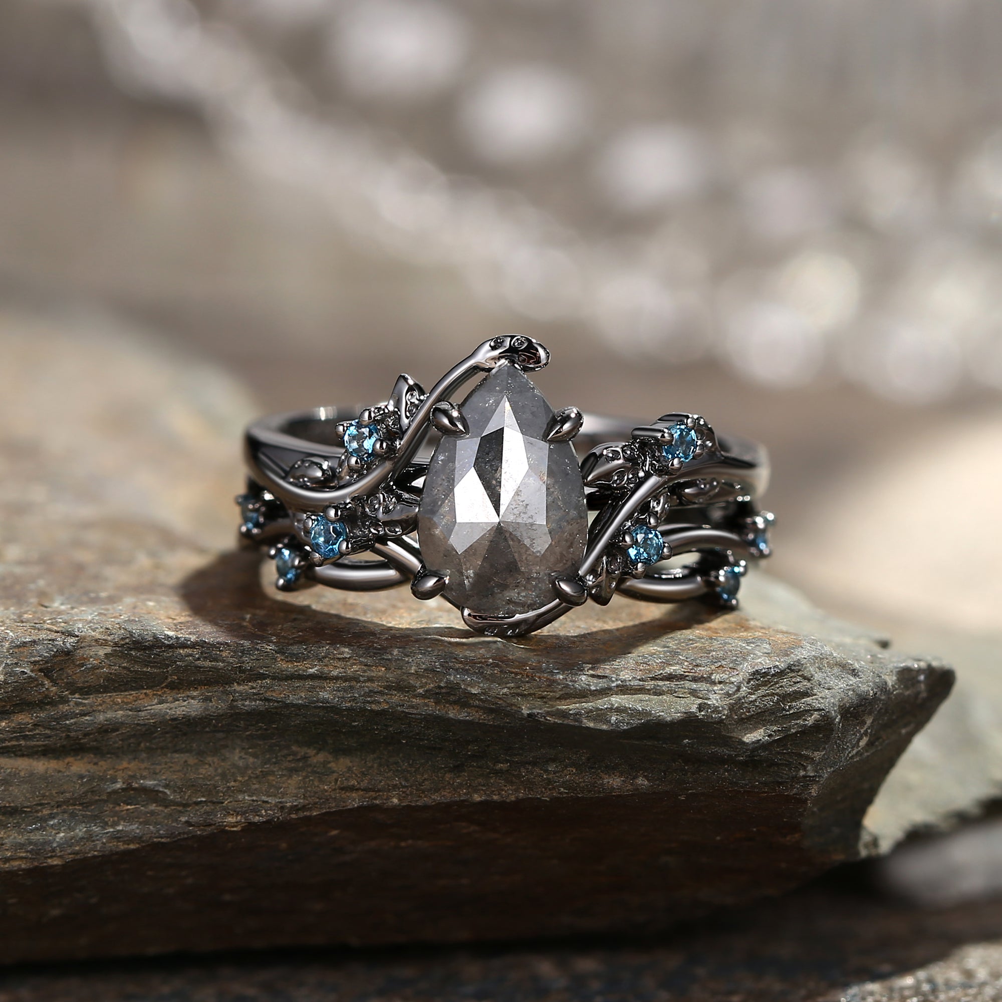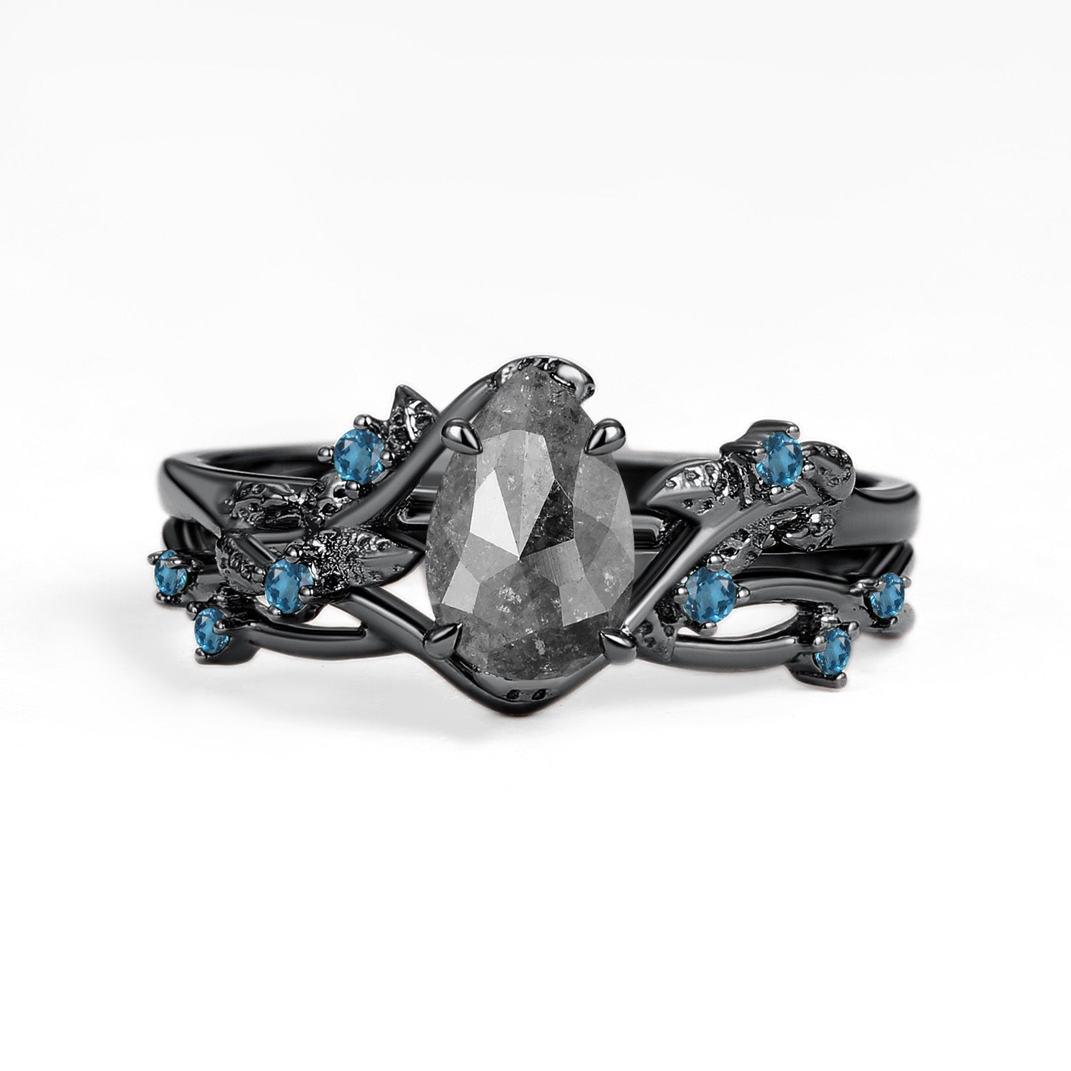 Felicegals Vintage Pear Shaped Salt and Pepper Diamond Leafy Ring Set 2pcs Vine Band Infinity Ring Bridal Set 2pc Gold Ring