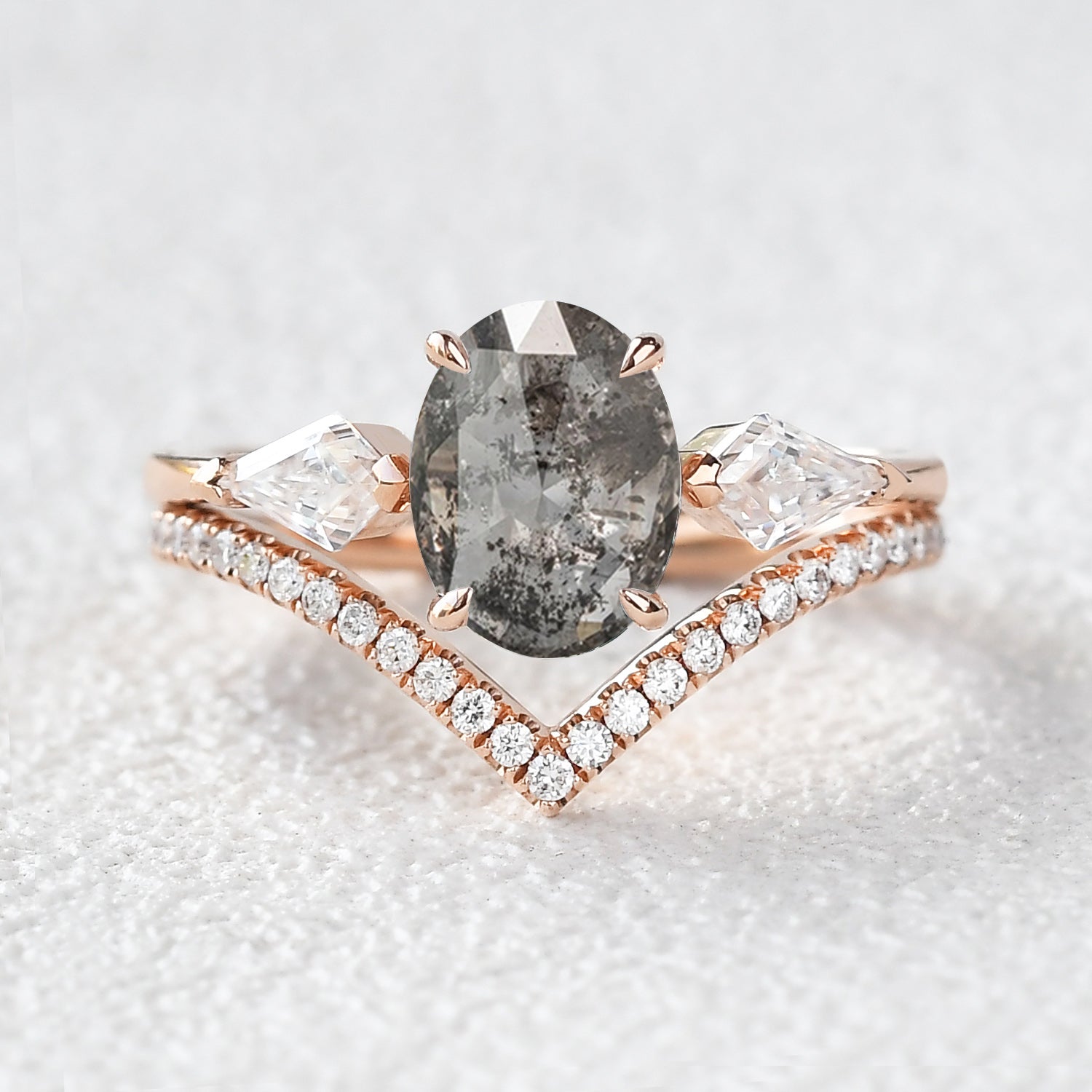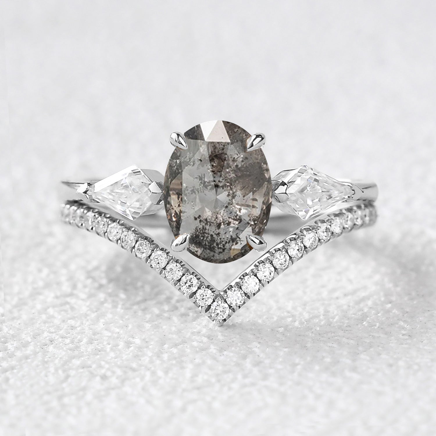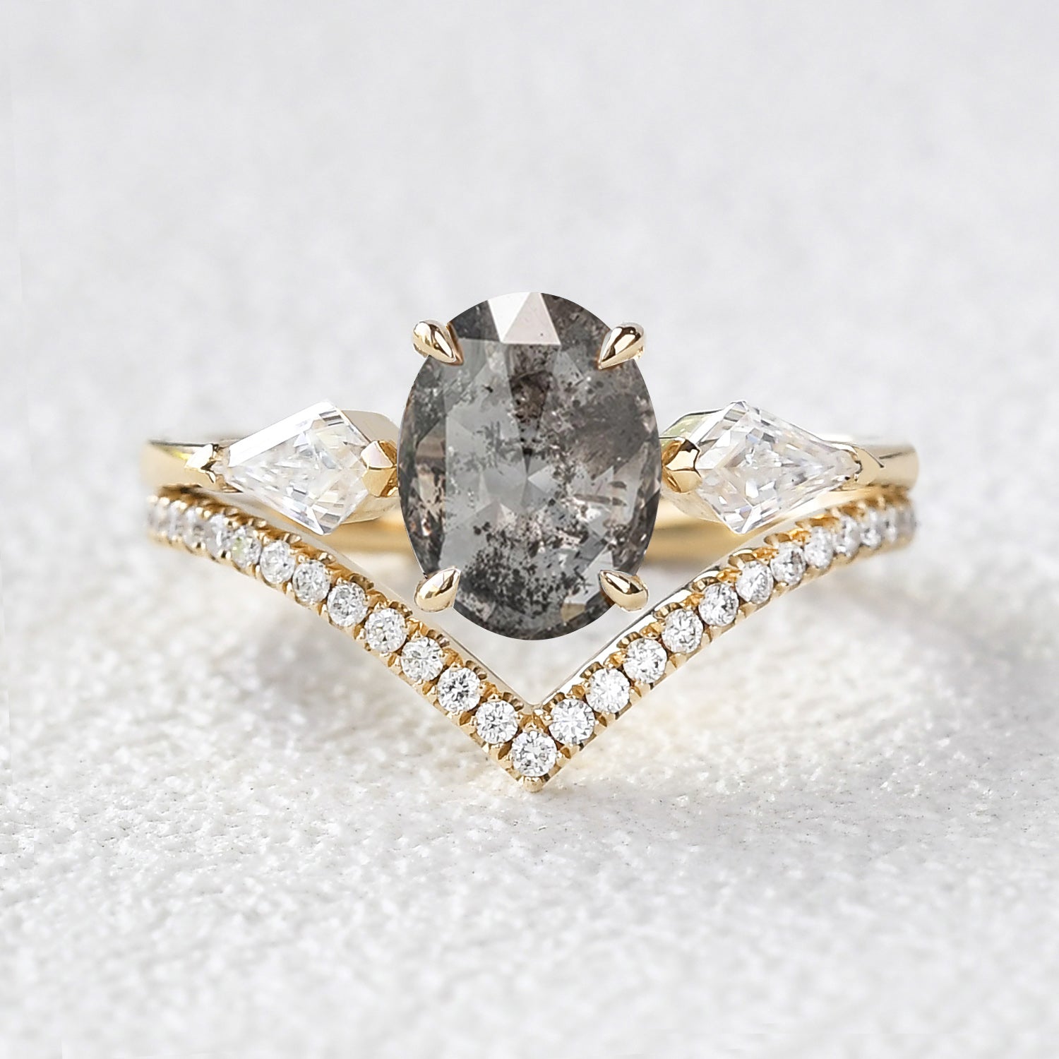 Oval Cut Salt and Pepper Diamonds Engagement Three Stone Ring Sets 2pcs