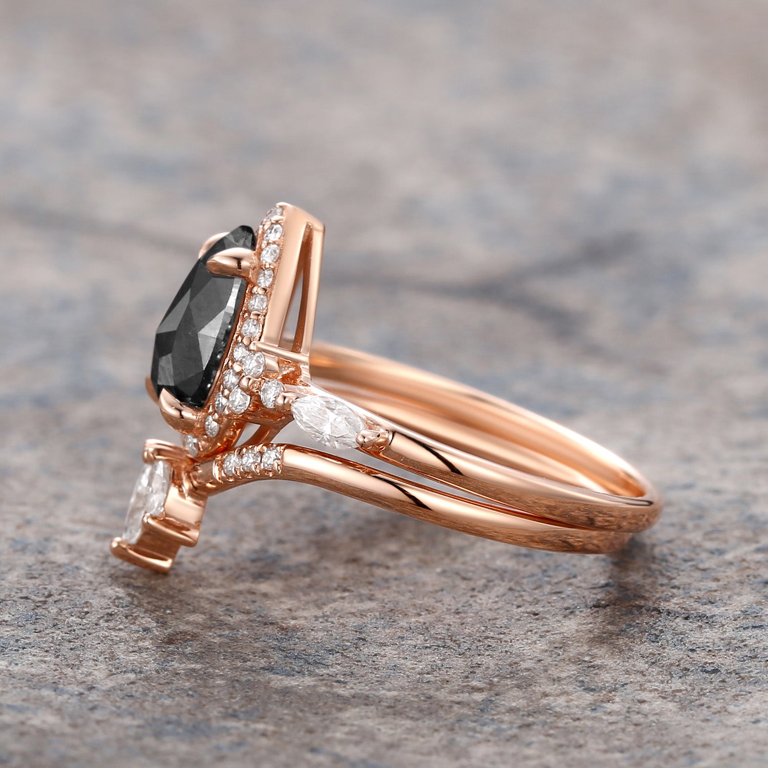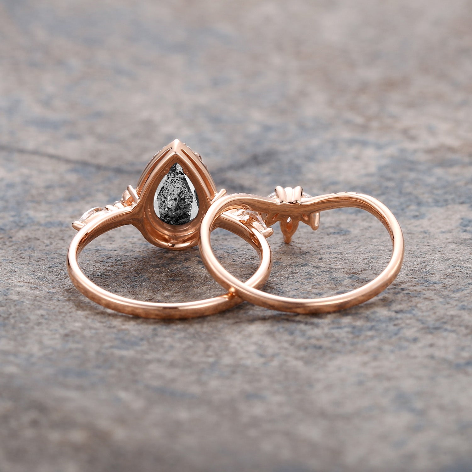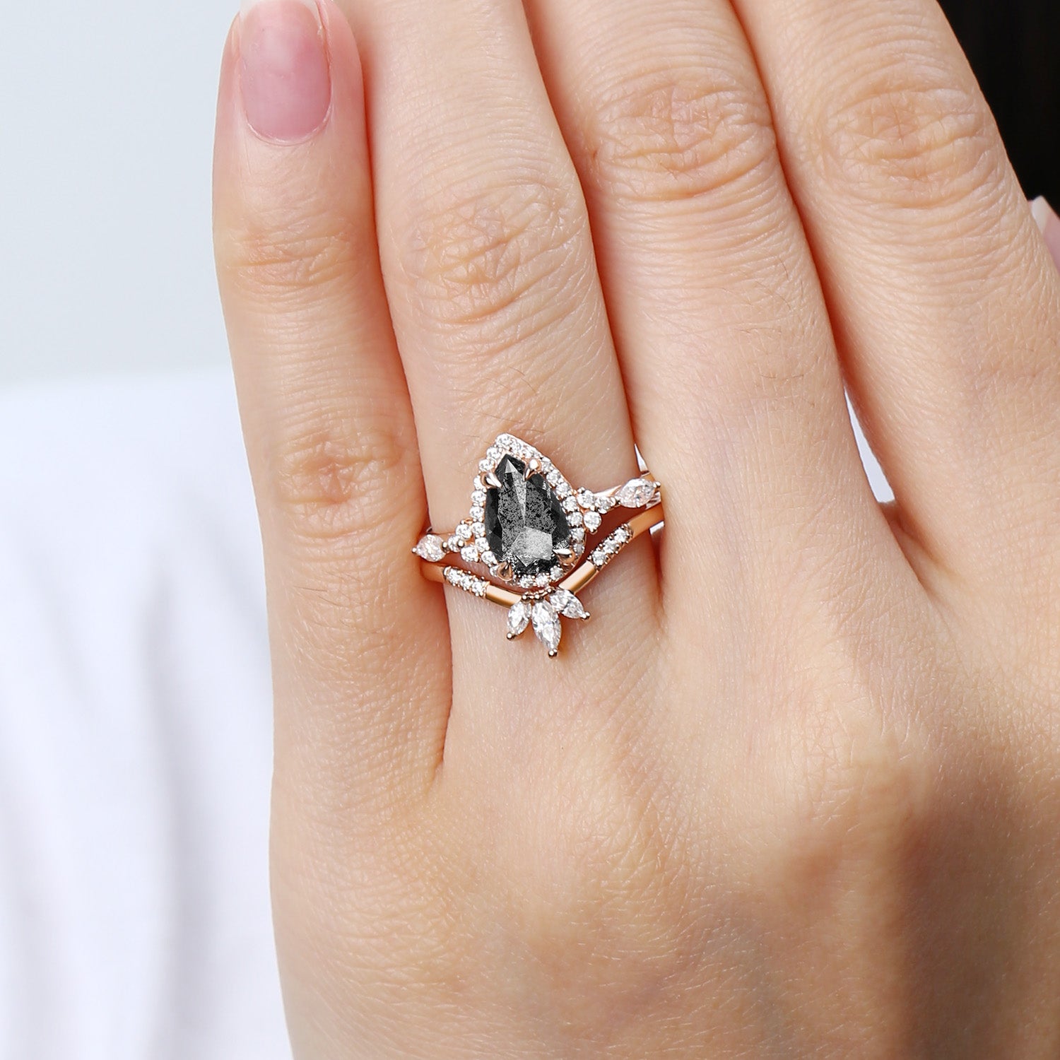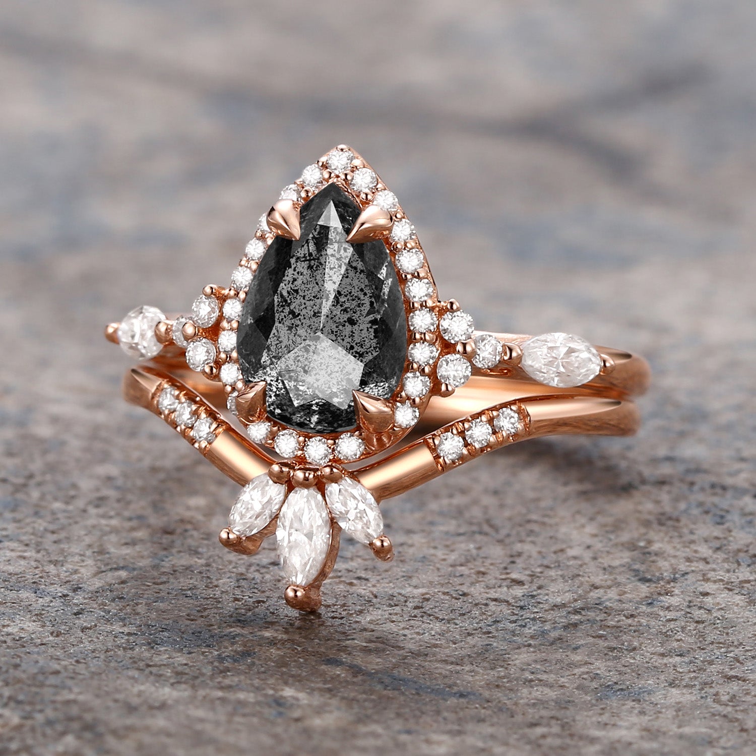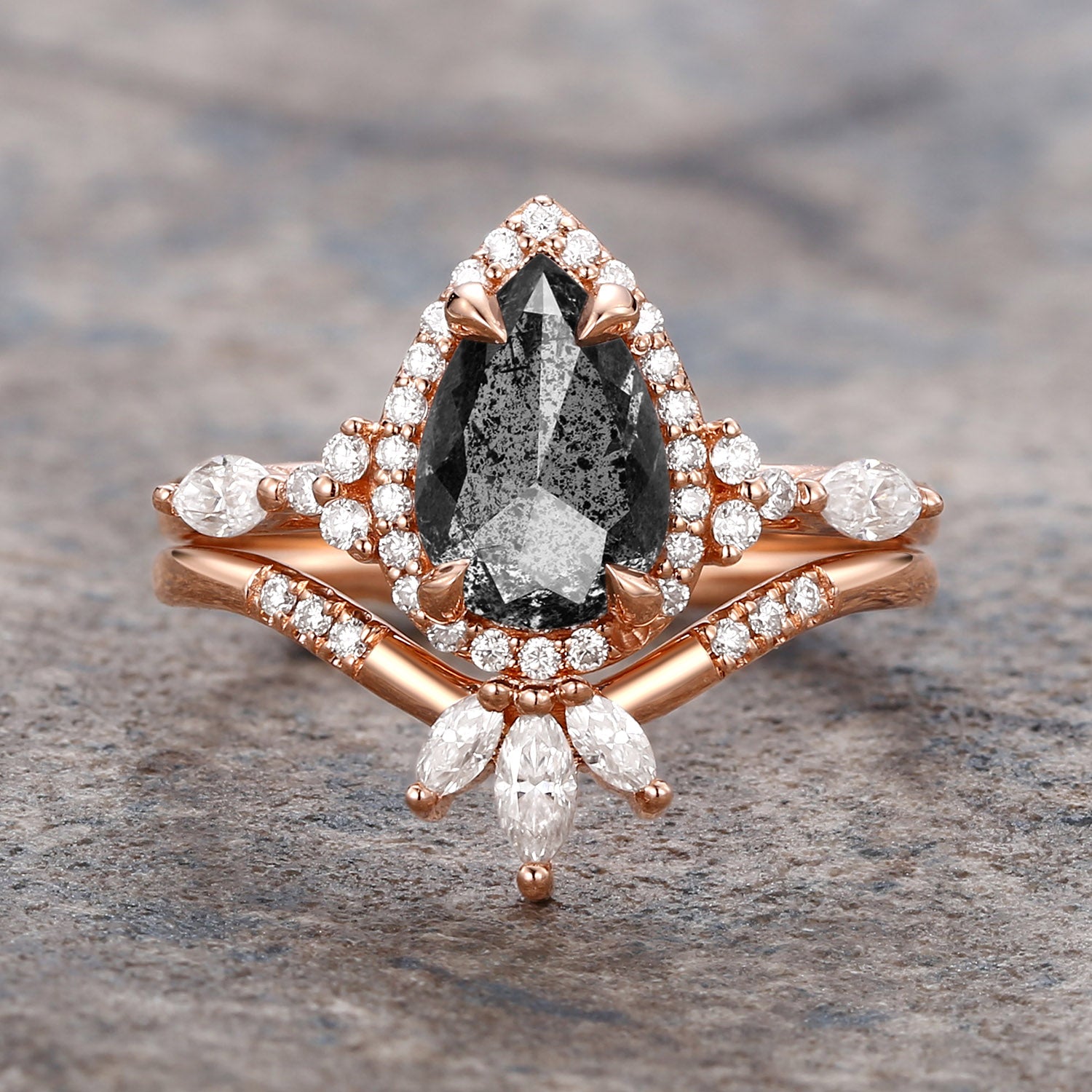 Pear Salt and Pepper Diamonds Halo Engagement Ring Sets 2pcs