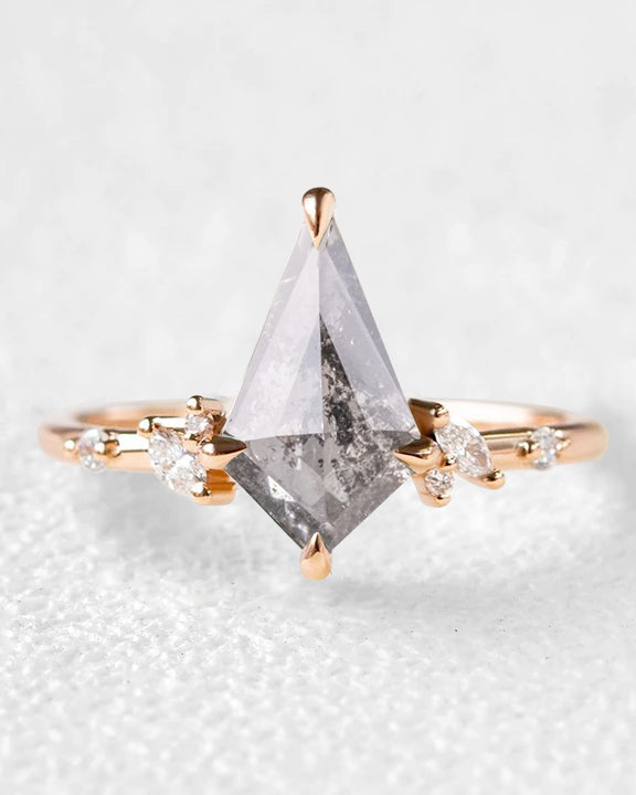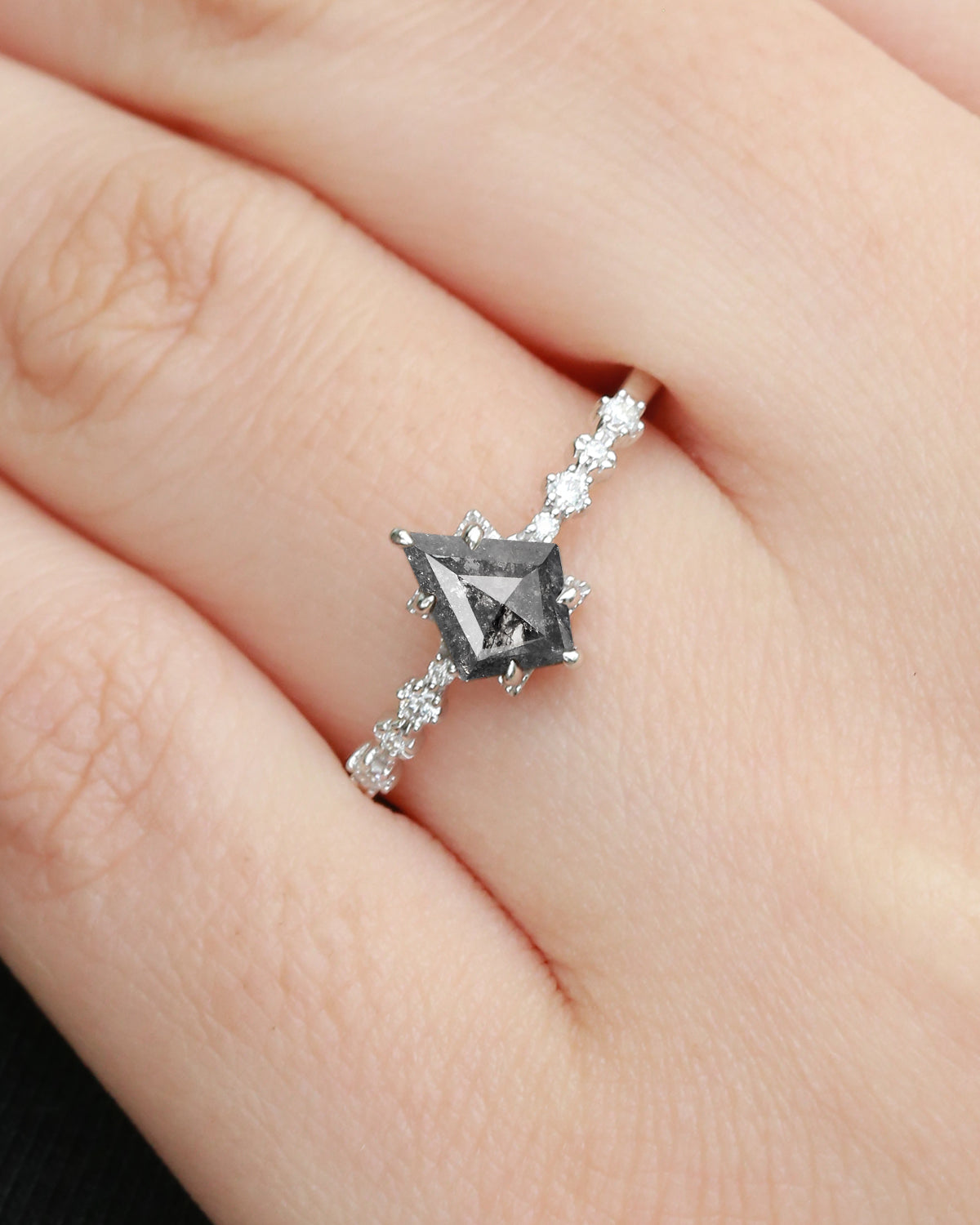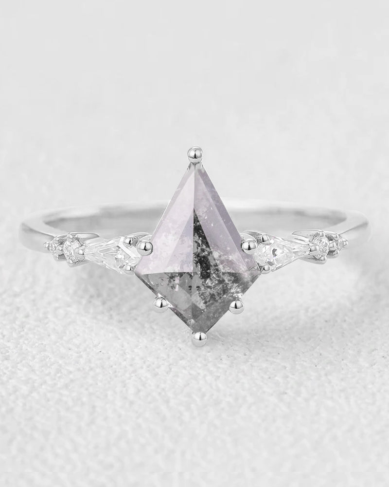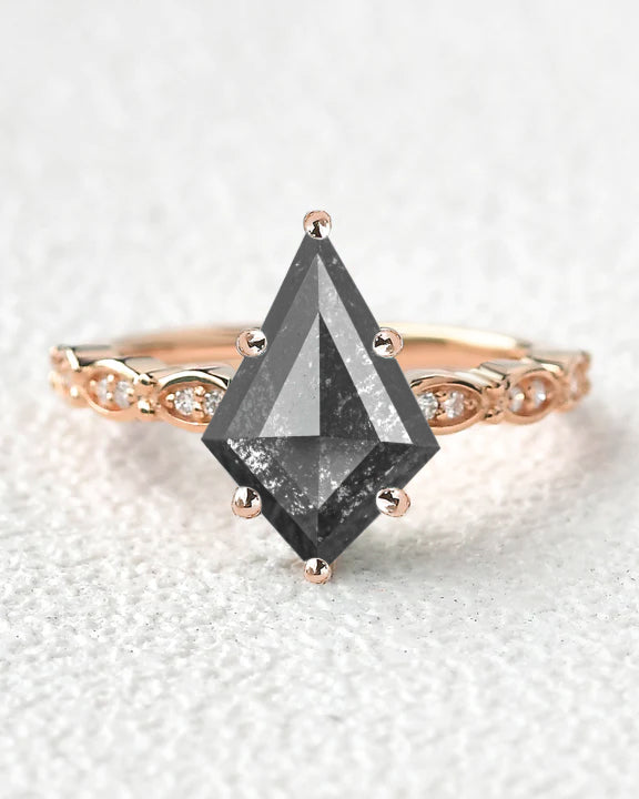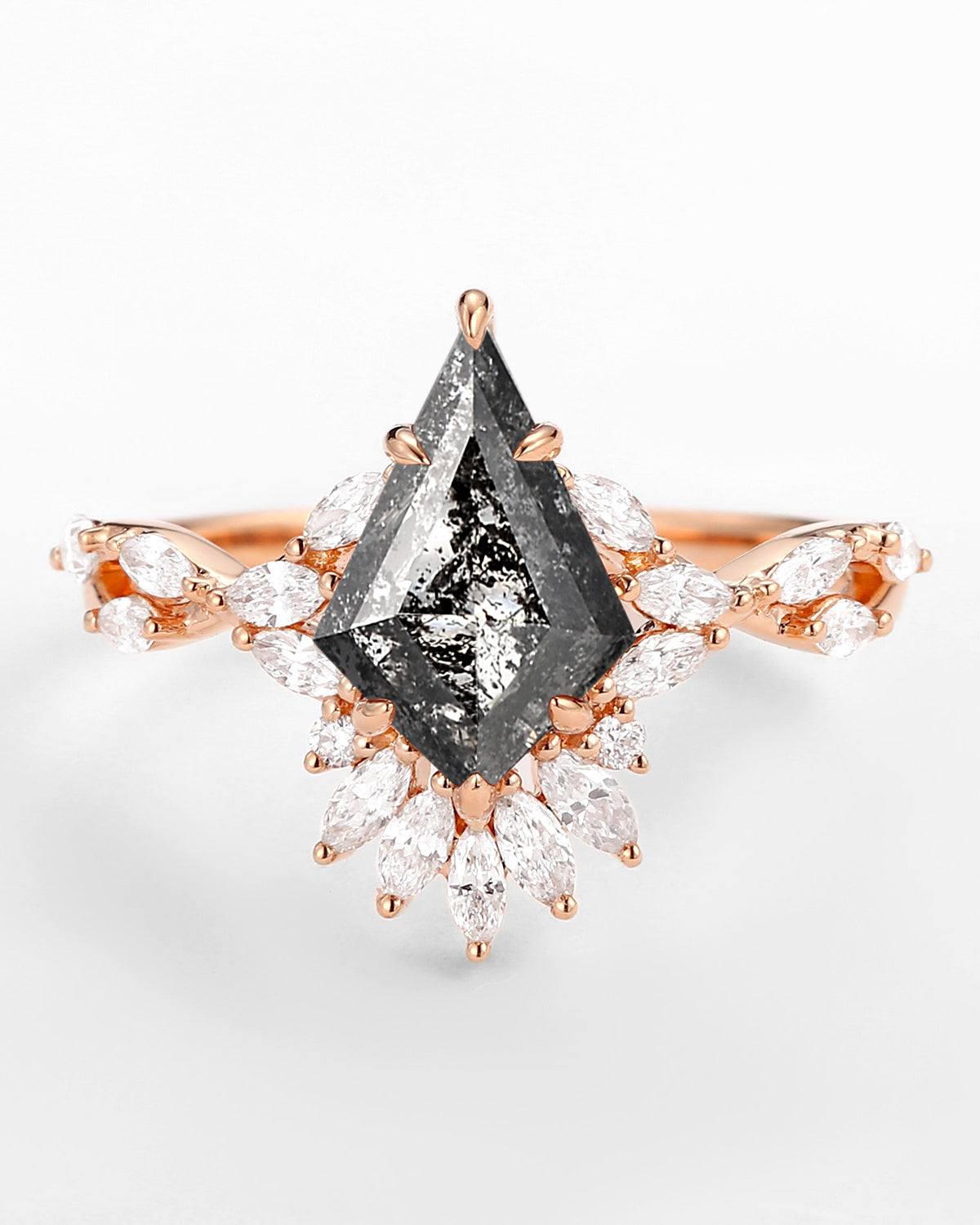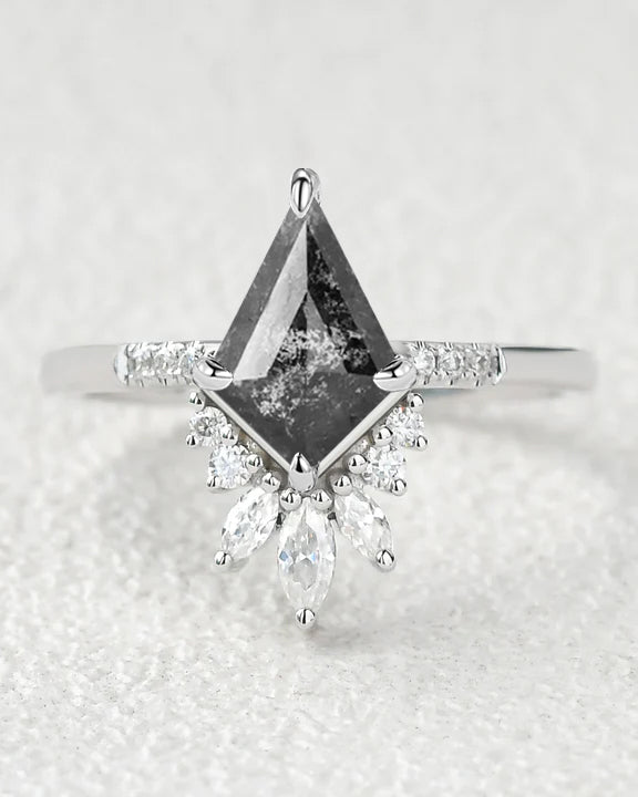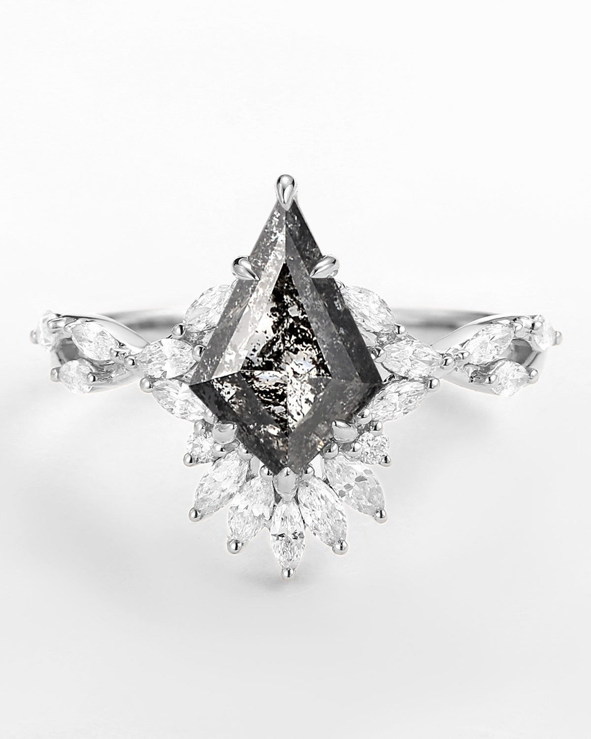 "Pepper" refers to black inclusions, while "salt" refers to white inclusions. Salt and Pepper Diamonds are typically earthy tones that go beyond pure black and white. The black inclusions inside diamonds are like the stars in the night sky. The exquisite, unique, and eclectic kite cut salt and pepper diamond engagement ring has both a vintage and modern feel. With these brilliant and special starry unique engagement rings from felicegals, you can capture the touching moments of your love and bravely pursue it.