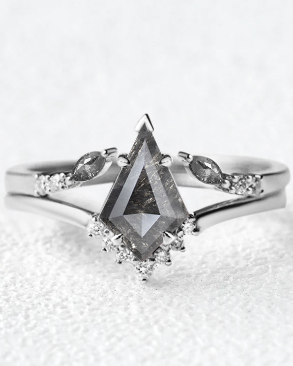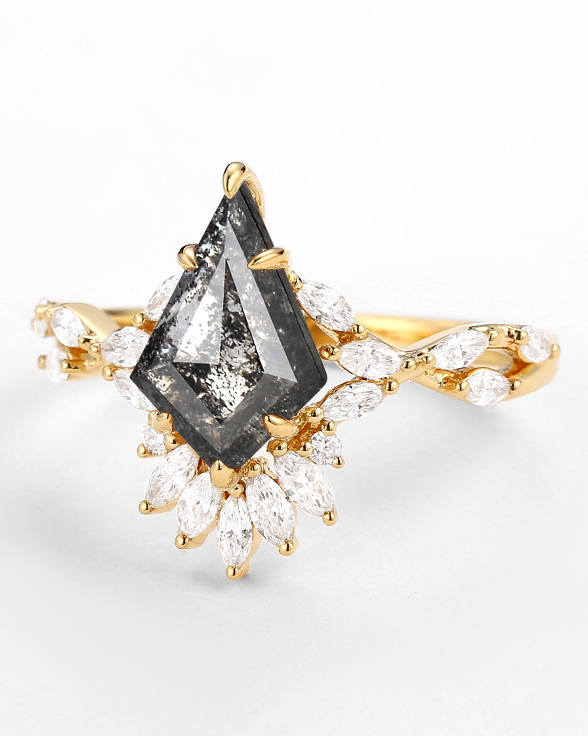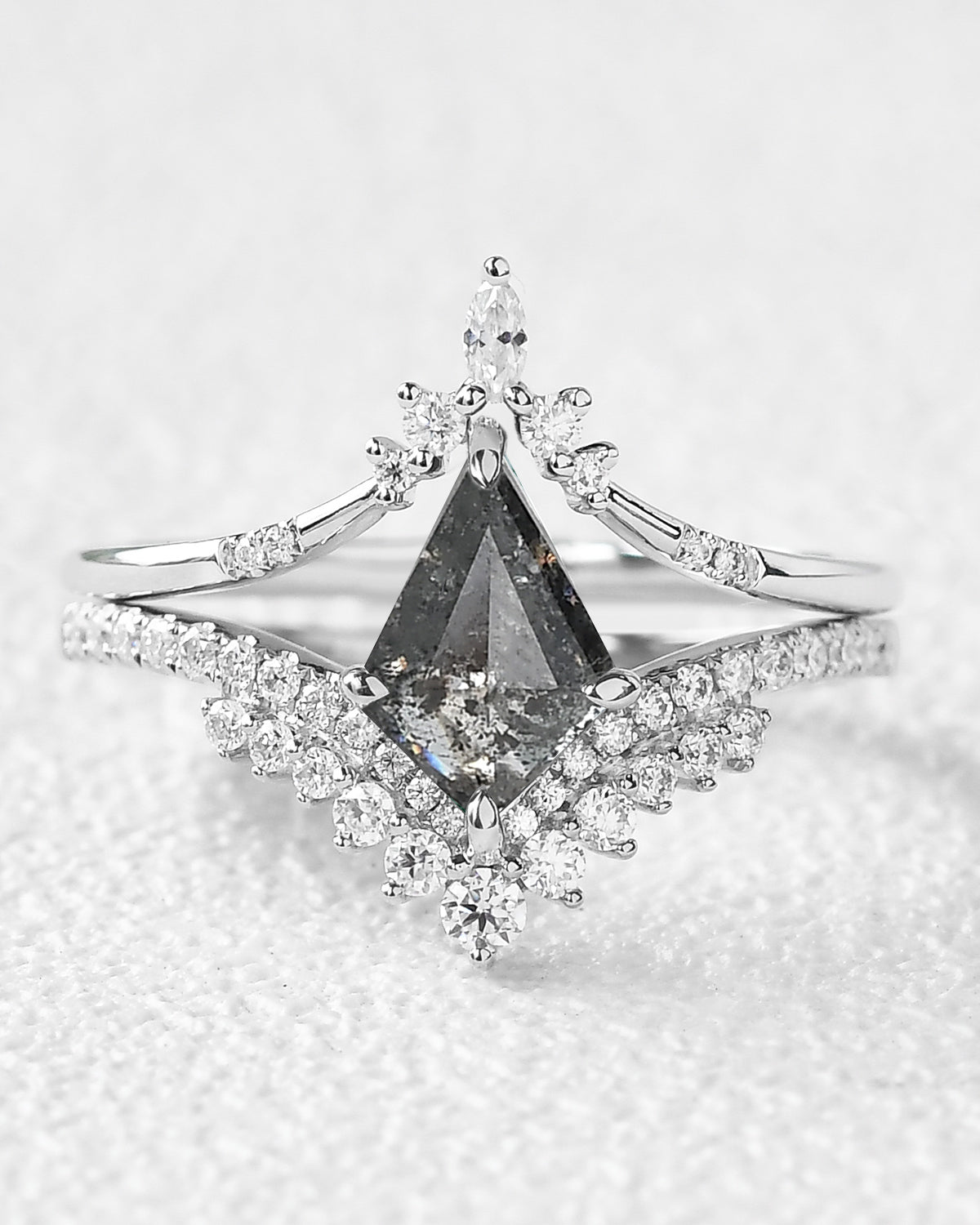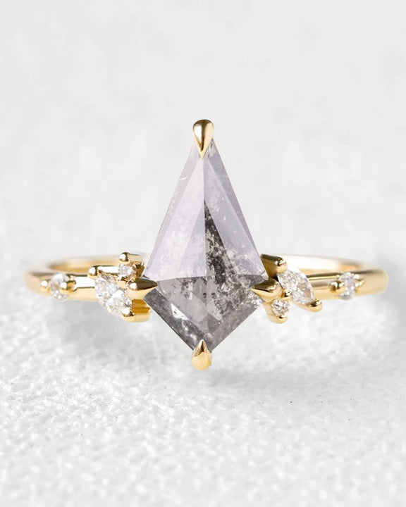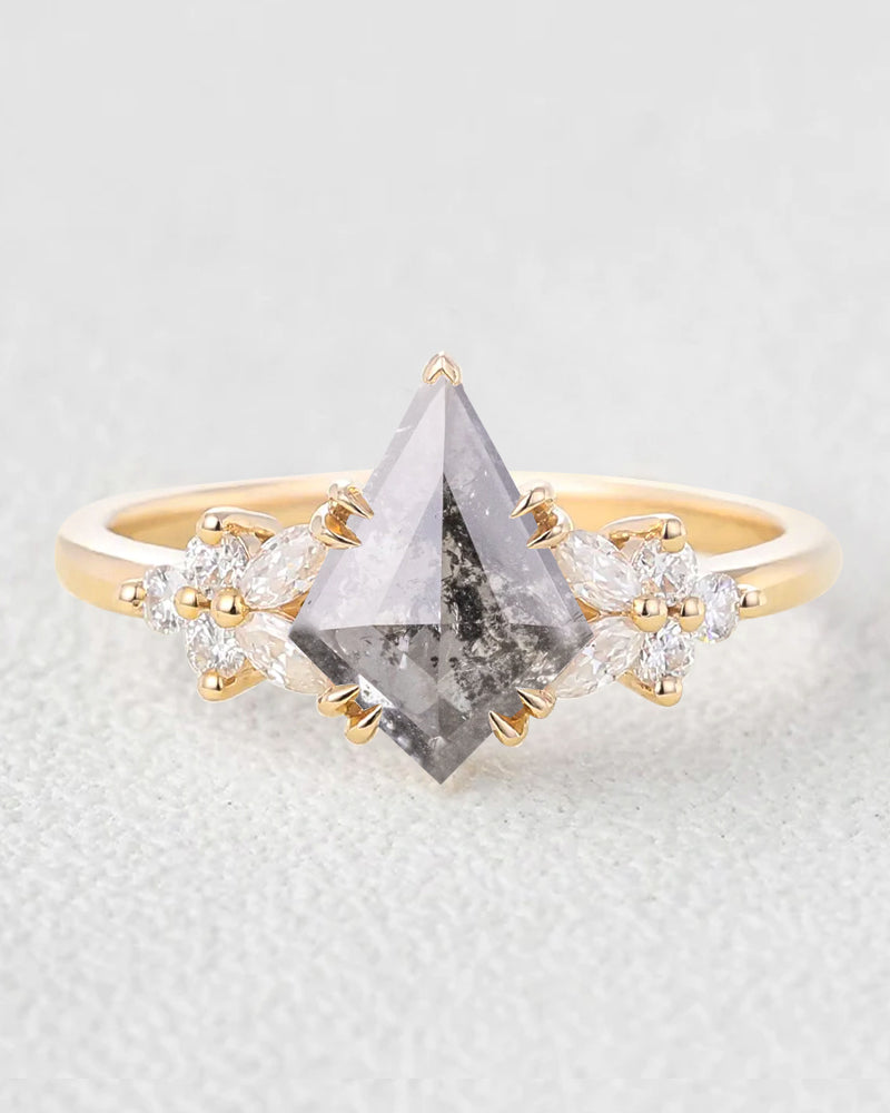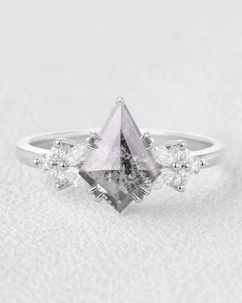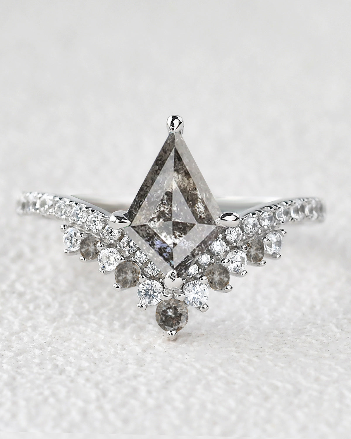 "Pepper" refers to black inclusions, while "salt" refers to white inclusions. Salt and Pepper Diamonds are typically earthy tones that go beyond pure black and white. The black inclusions inside diamonds are like the stars in the night sky. The exquisite, unique, and eclectic kite cut salt and pepper diamond engagement ring has both a vintage and modern feel. With these brilliant and special starry unique engagement rings from felicegals, you can capture the touching moments of your love and bravely pursue it.