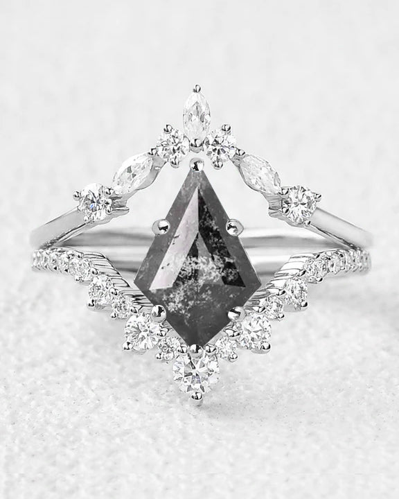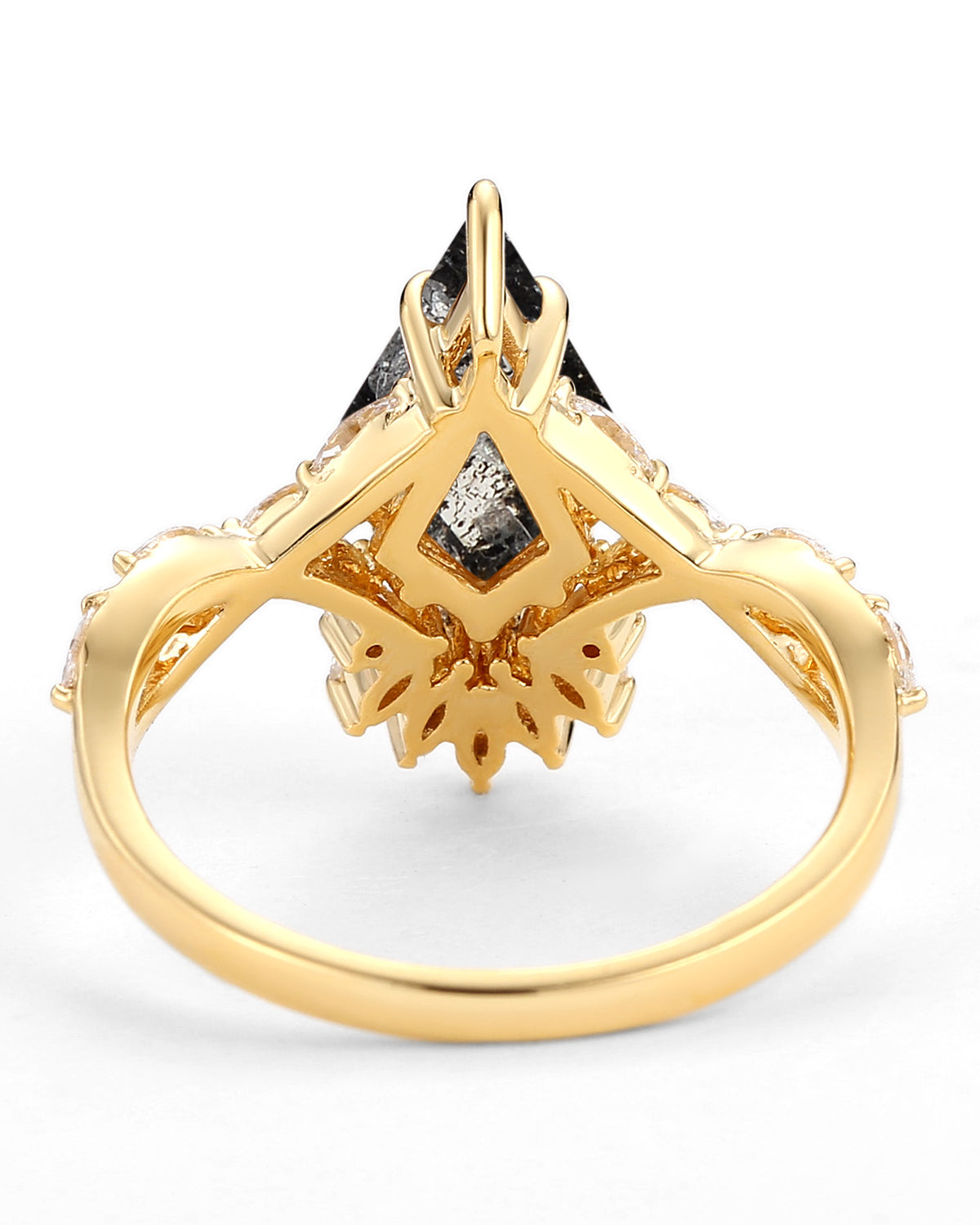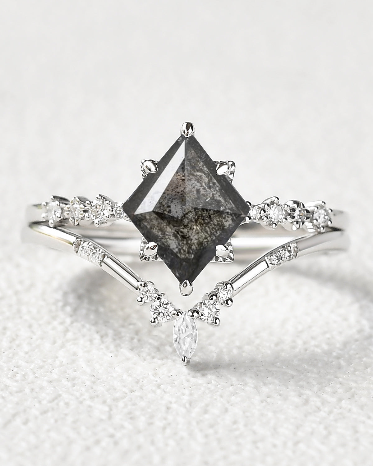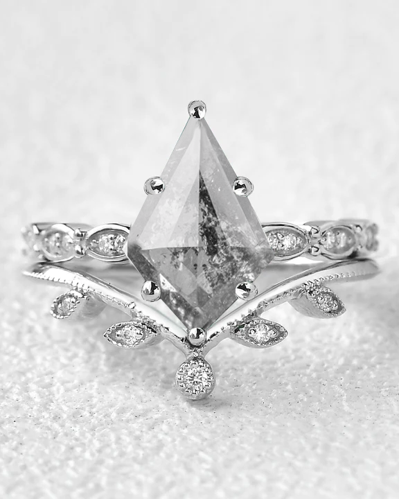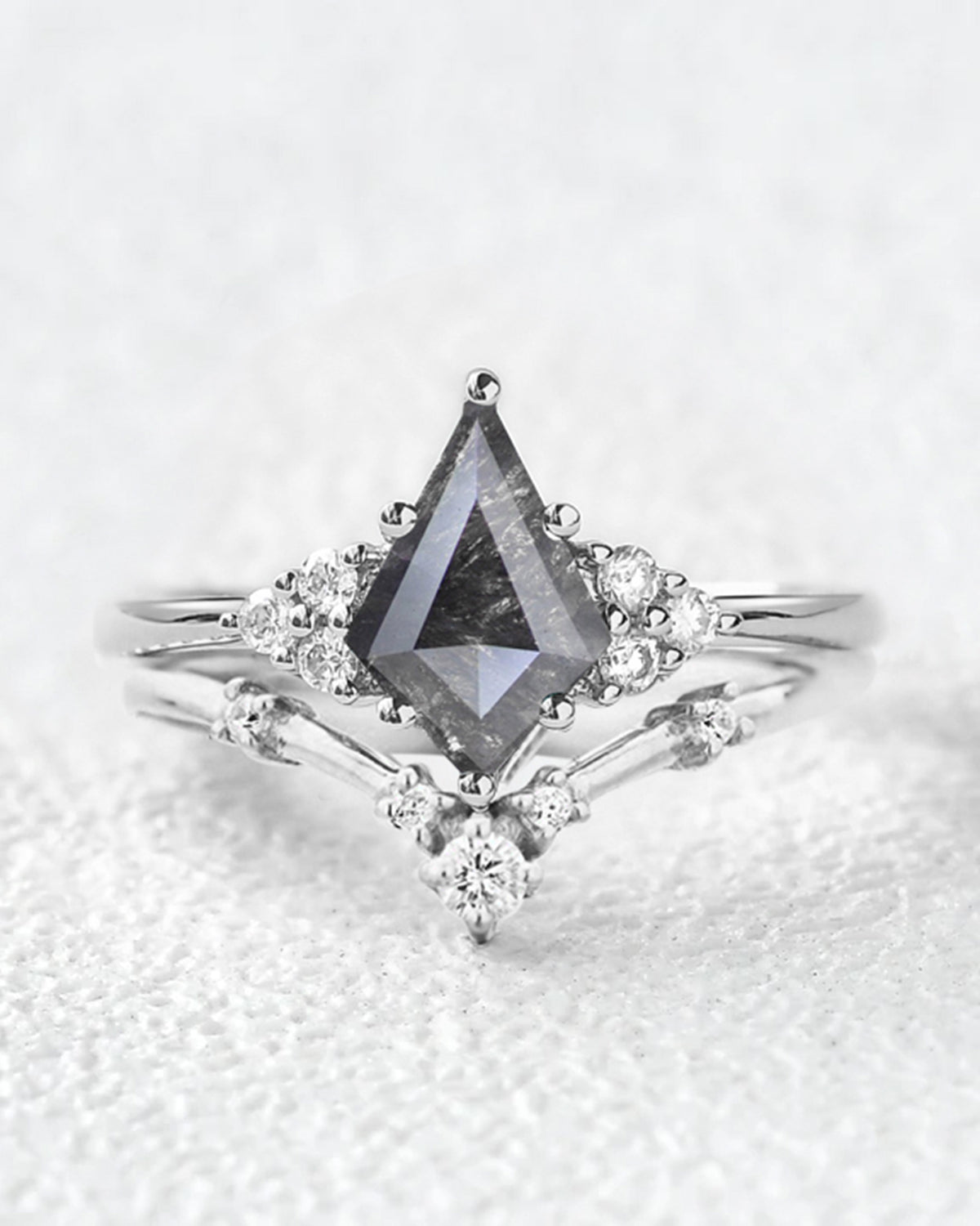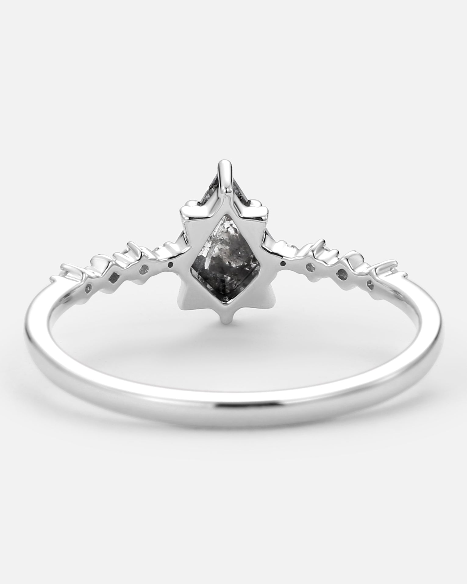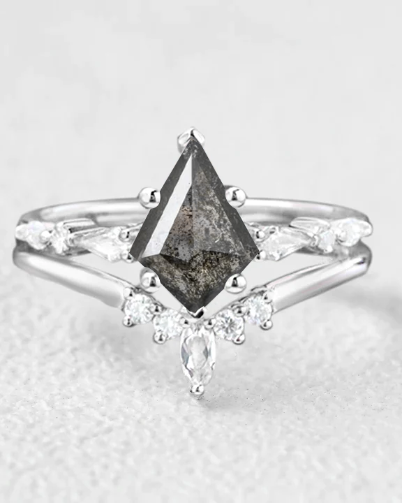 "Pepper" refers to black inclusions, while "salt" refers to white inclusions. Salt and Pepper Diamonds are typically earthy tones that go beyond pure black and white. The black inclusions inside diamonds are like the stars in the night sky. The exquisite, unique, and eclectic kite cut salt and pepper diamond engagement ring has both a vintage and modern feel. With these brilliant and special starry unique engagement rings from felicegals, you can capture the touching moments of your love and bravely pursue it.