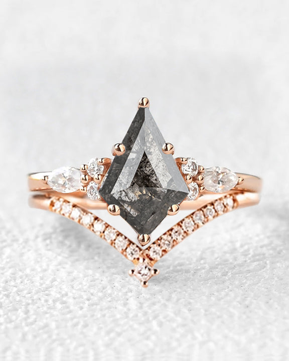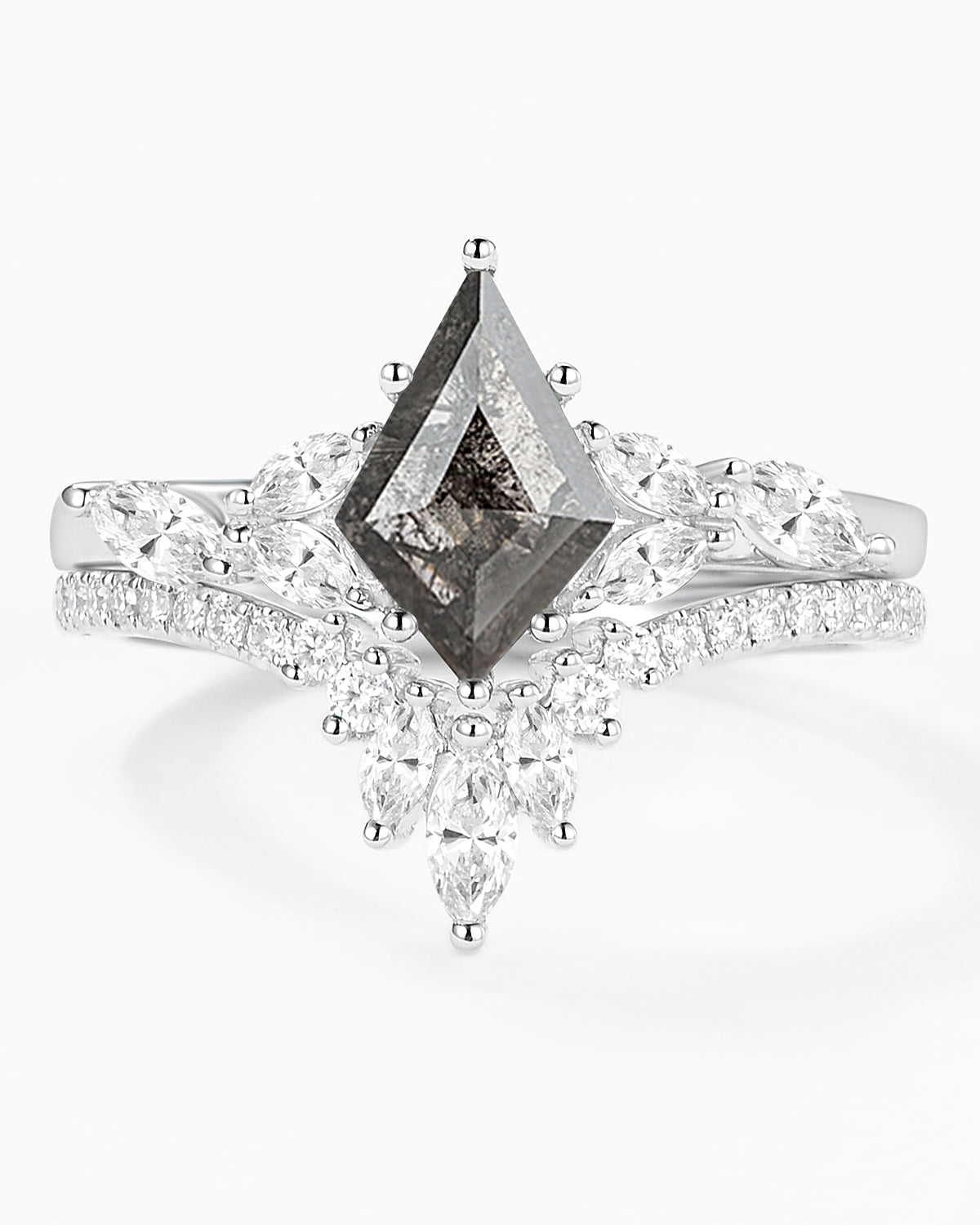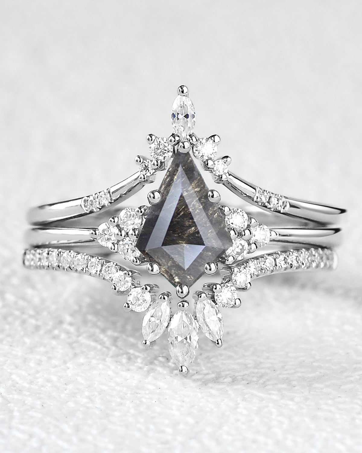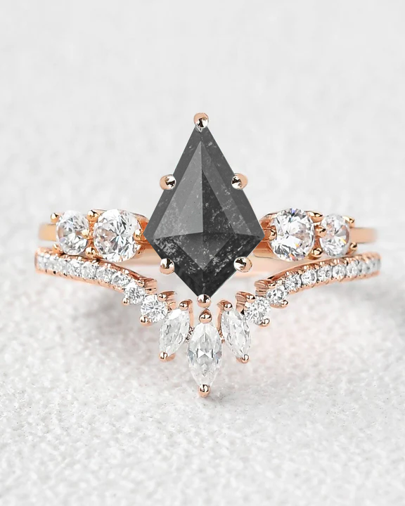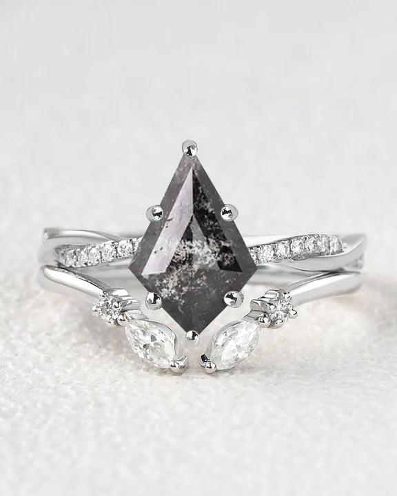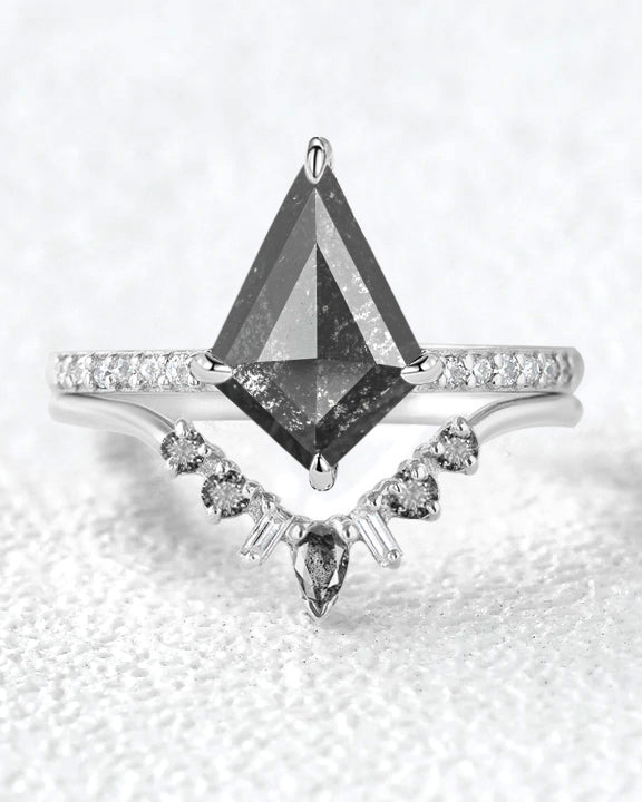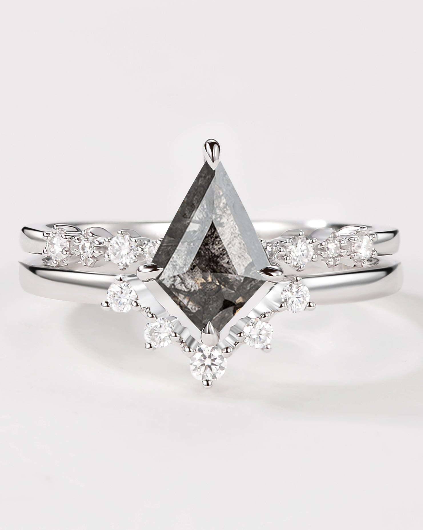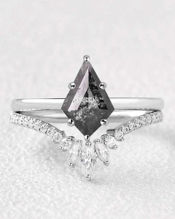 "Pepper" refers to black inclusions, while "salt" refers to white inclusions. Salt and Pepper Diamonds are typically earthy tones that go beyond pure black and white. The black inclusions inside diamonds are like the stars in the night sky. The exquisite, unique, and eclectic kite cut salt and pepper diamond engagement ring has both a vintage and modern feel. With these brilliant and special starry unique engagement rings from felicegals, you can capture the touching moments of your love and bravely pursue it.
