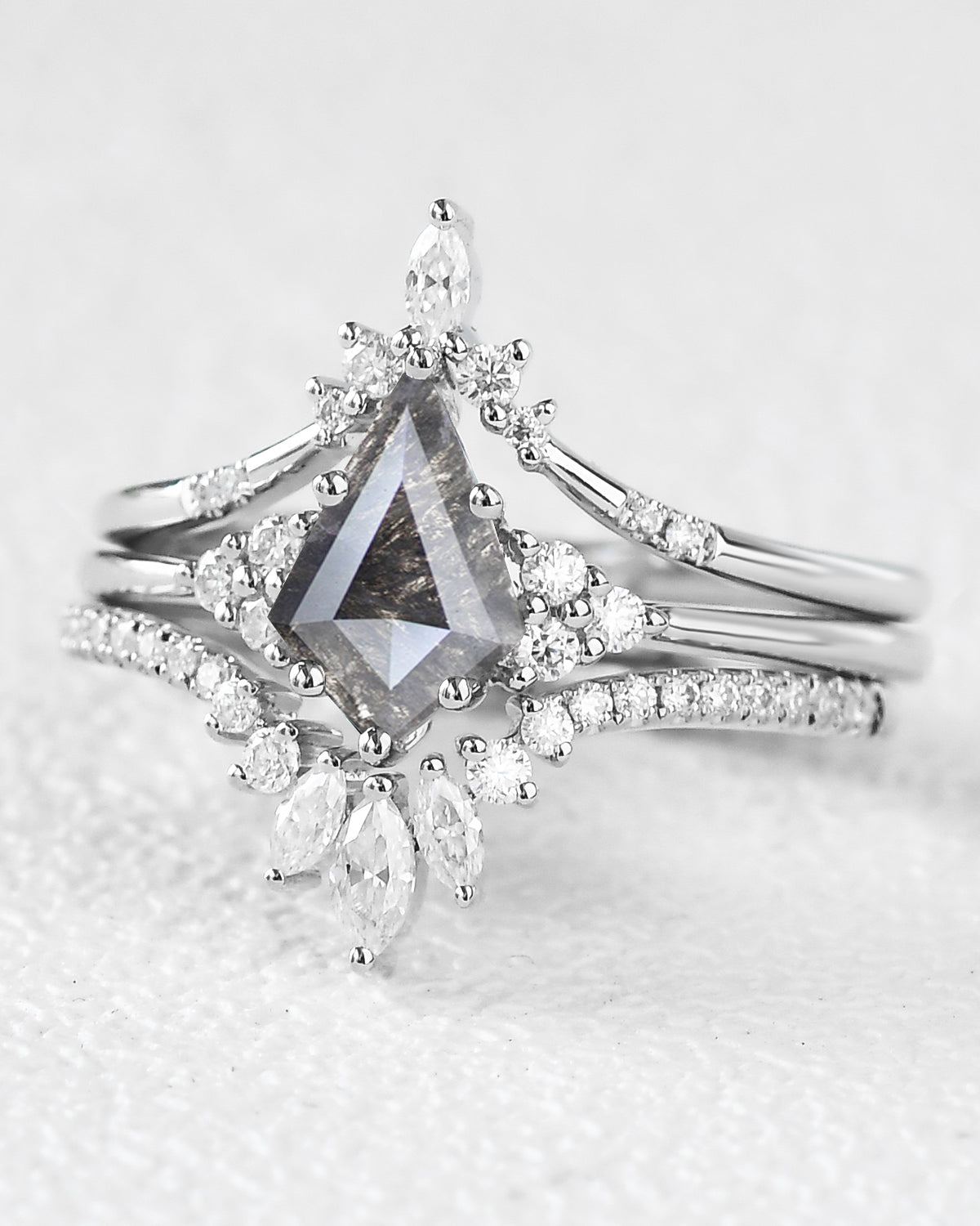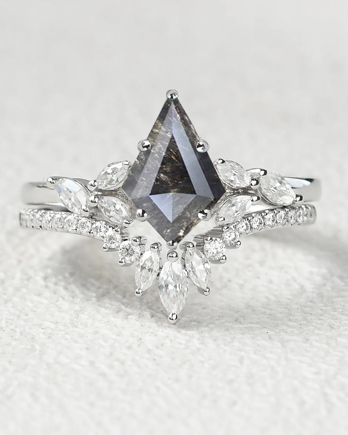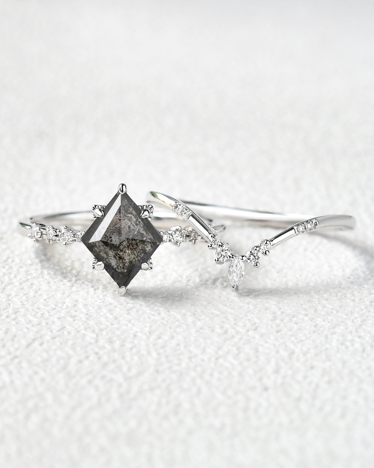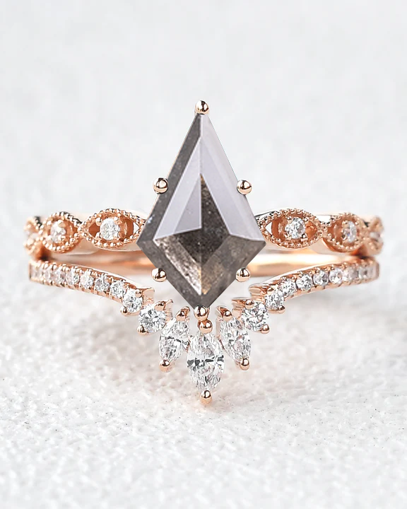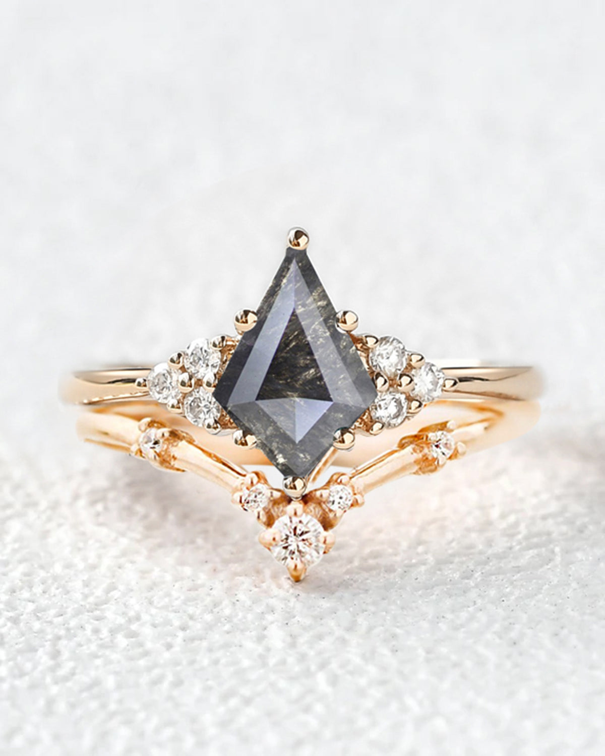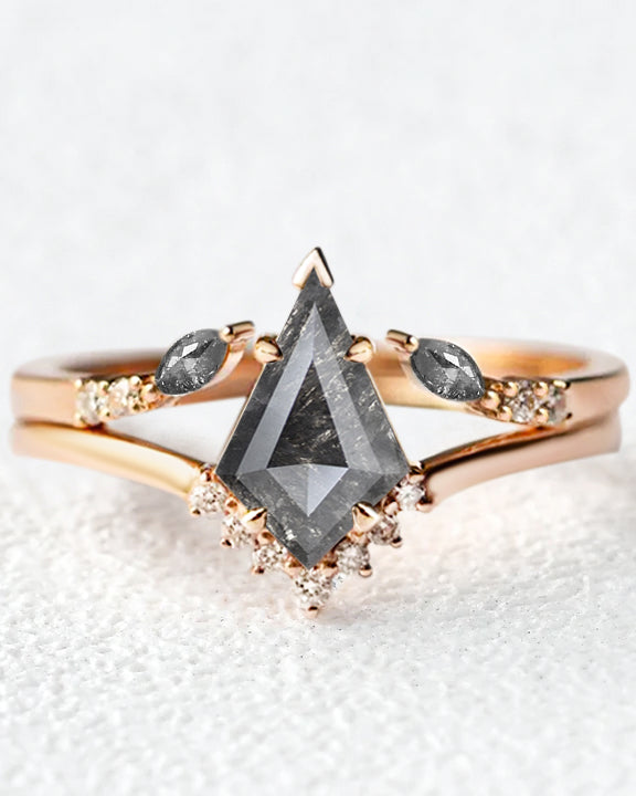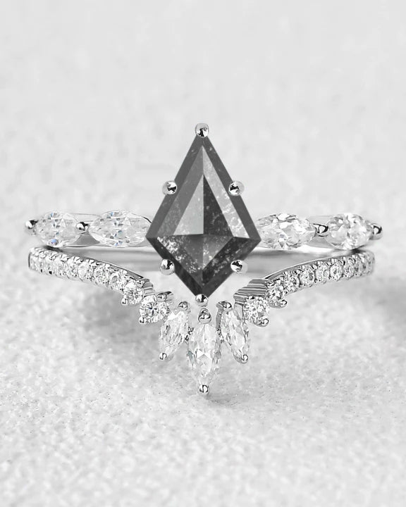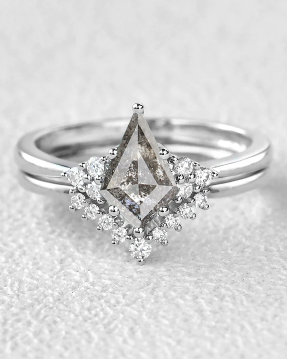 "Pepper" refers to black inclusions, while "salt" refers to white inclusions. Salt and Pepper Diamonds are typically earthy tones that go beyond pure black and white. The black inclusions inside diamonds are like the stars in the night sky. The exquisite, unique, and eclectic kite cut salt and pepper diamond engagement ring has both a vintage and modern feel. With these brilliant and special starry unique engagement rings from felicegals, you can capture the touching moments of your love and bravely pursue it.