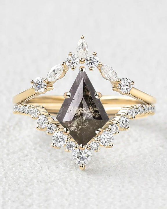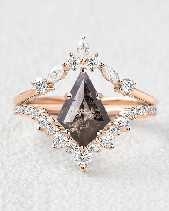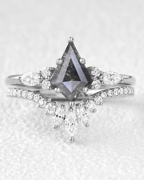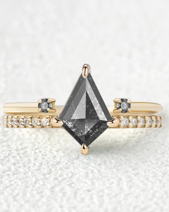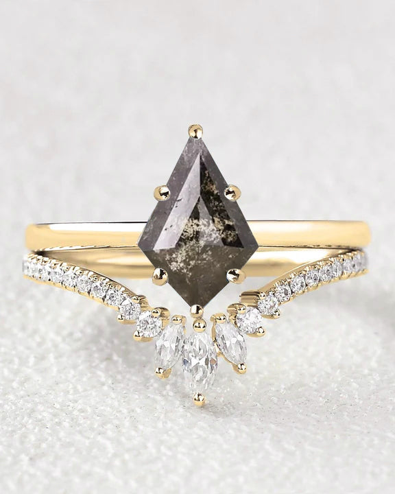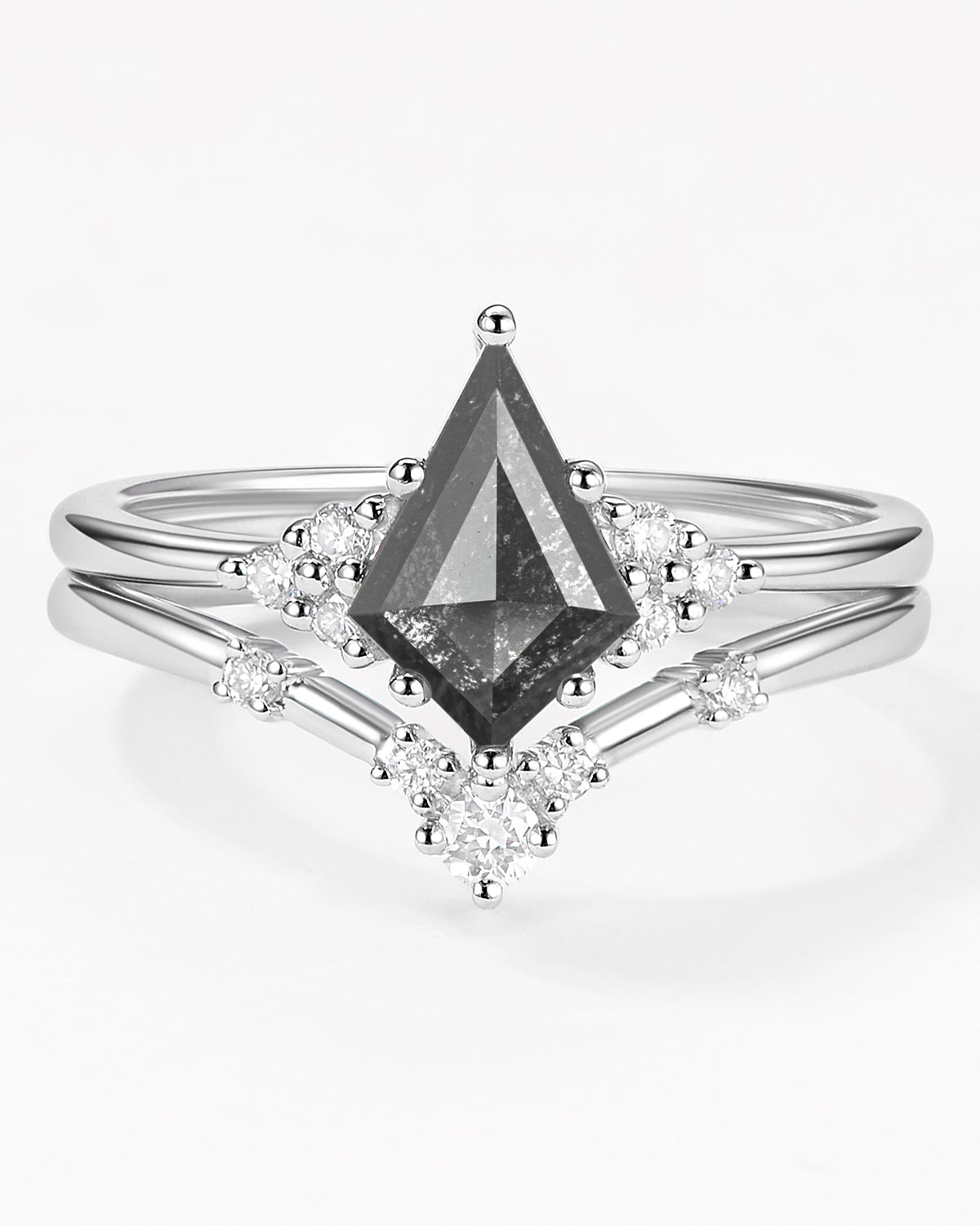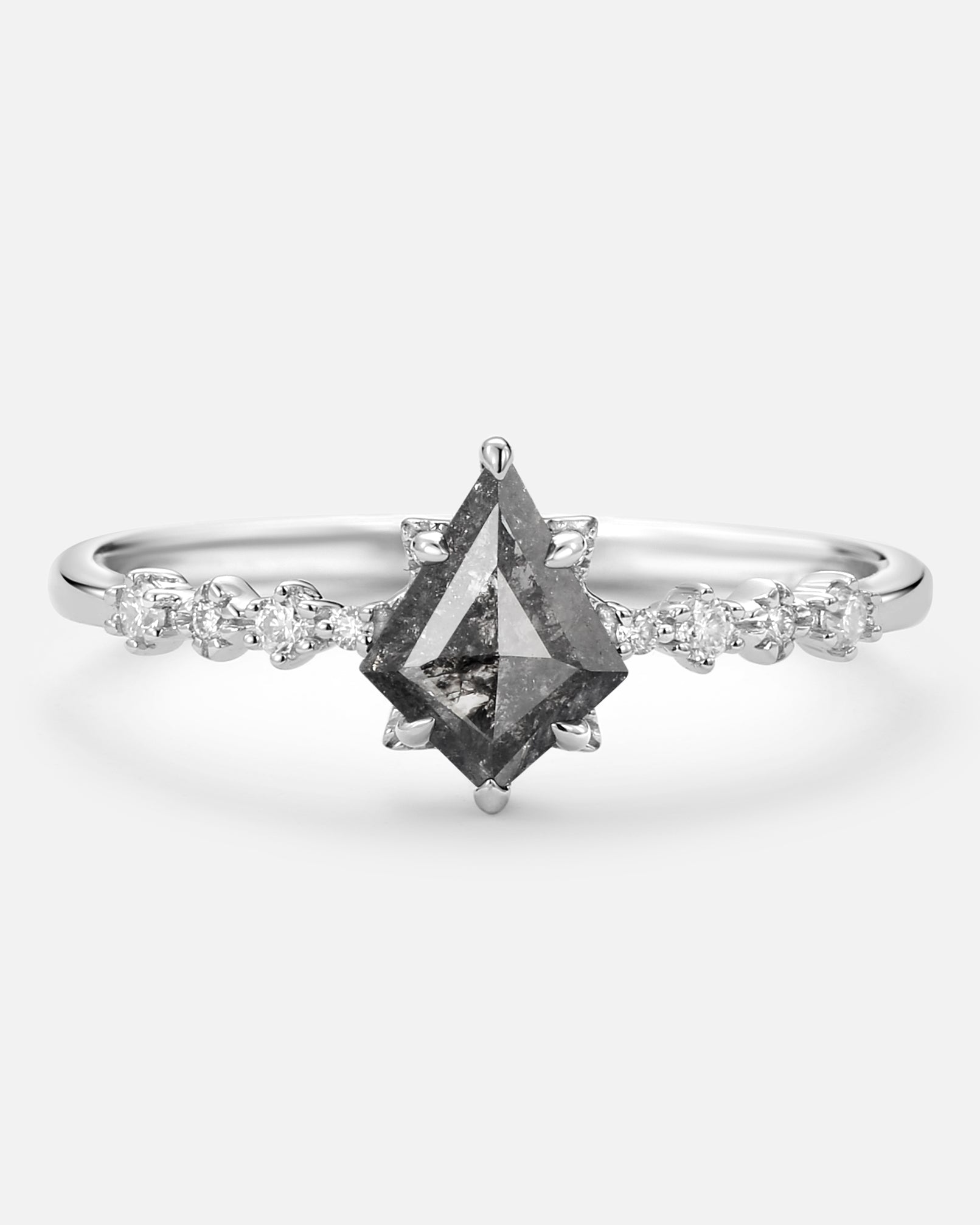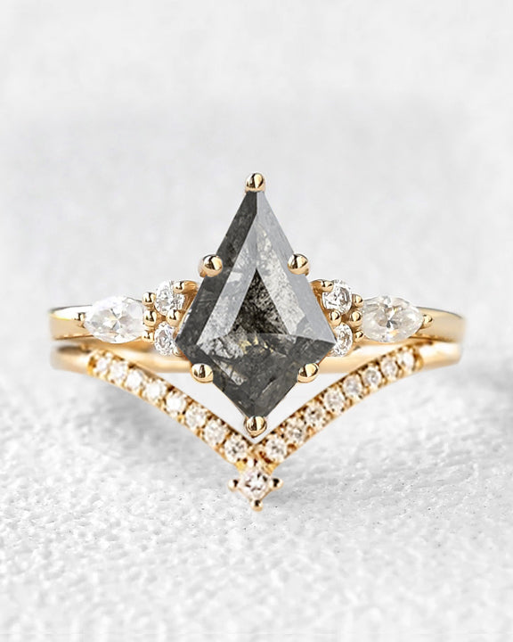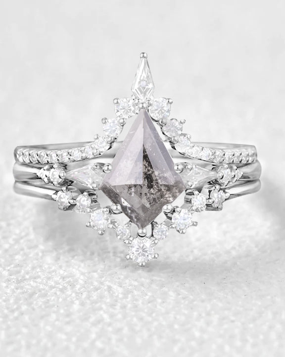 "Pepper" refers to black inclusions, while "salt" refers to white inclusions. Salt and Pepper Diamonds are typically earthy tones that go beyond pure black and white. The black inclusions inside diamonds are like the stars in the night sky. The exquisite, unique, and eclectic kite cut salt and pepper diamond engagement ring has both a vintage and modern feel. With these brilliant and special starry unique engagement rings from felicegals, you can capture the touching moments of your love and bravely pursue it.