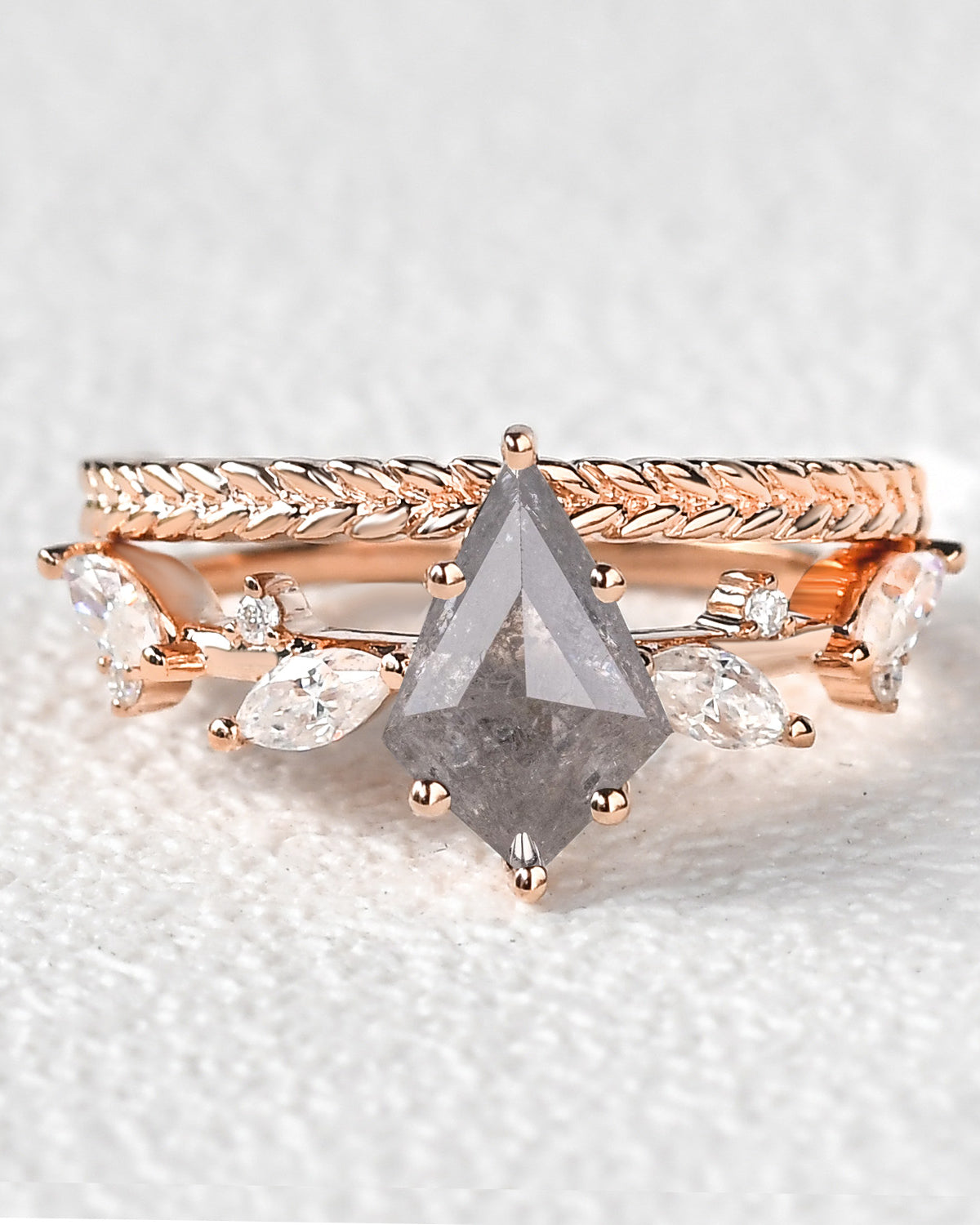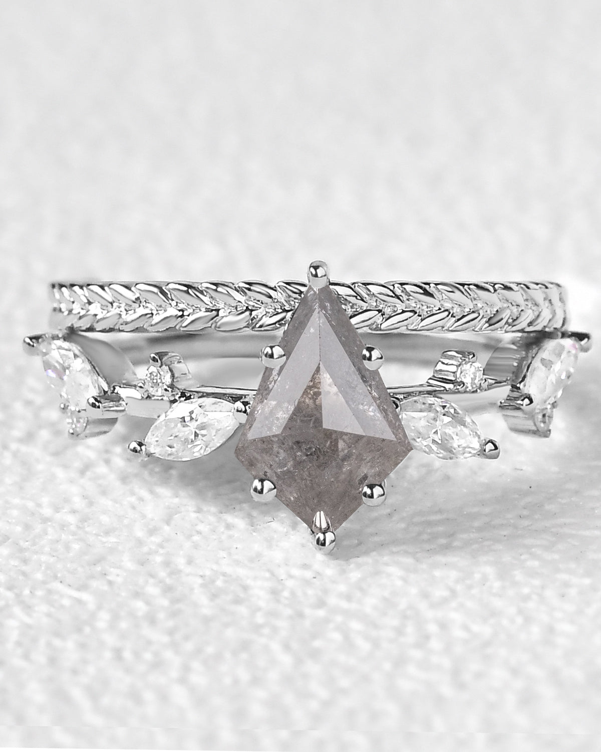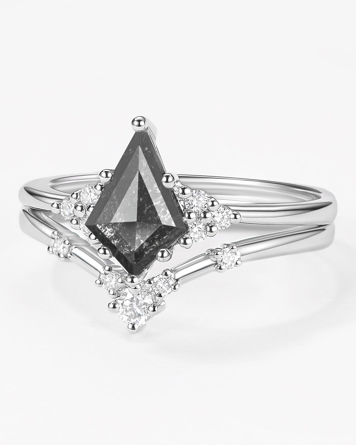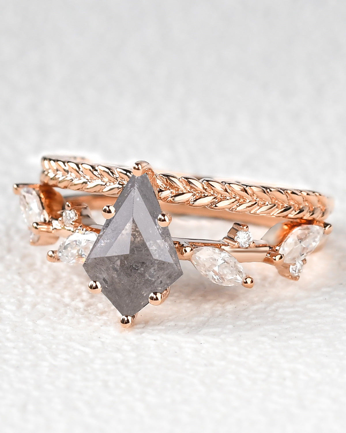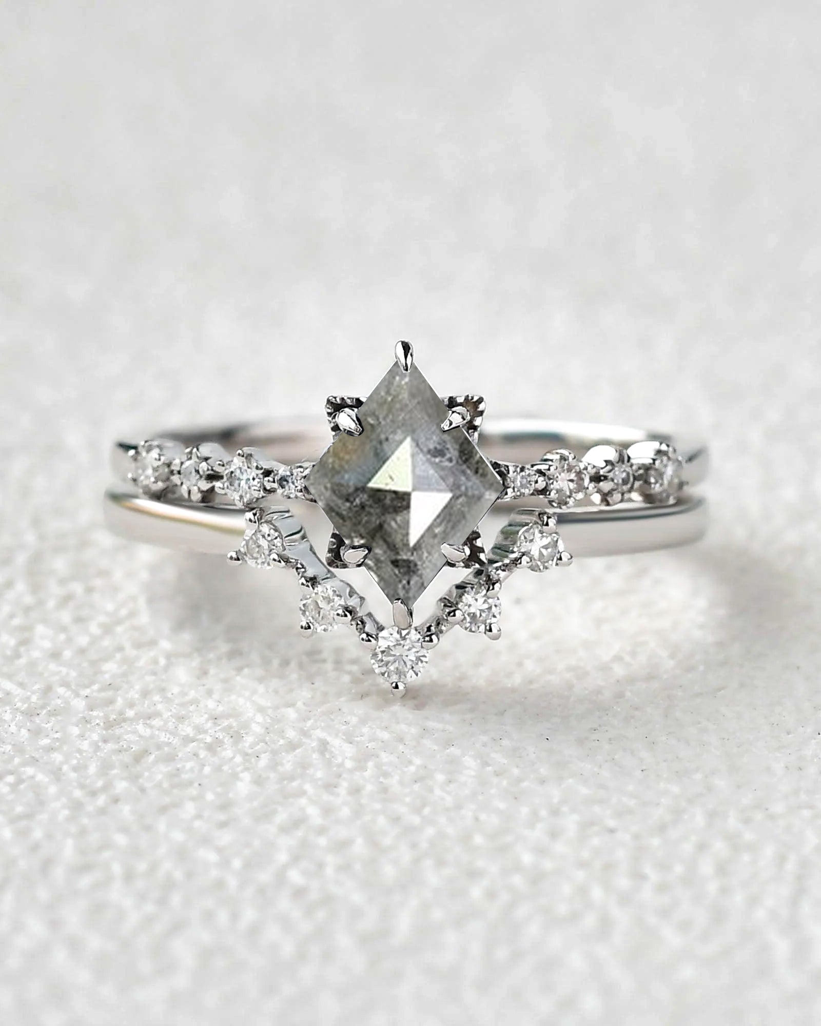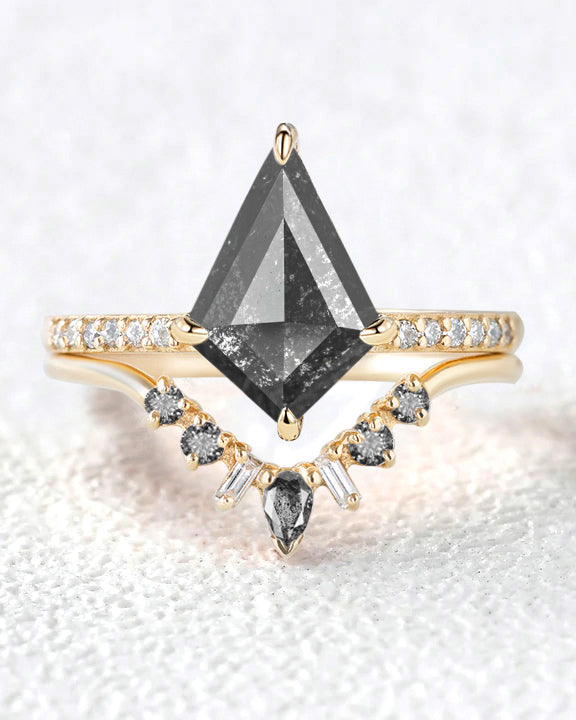 "Pepper" refers to black inclusions, while "salt" refers to white inclusions. Salt and Pepper Diamonds are typically earthy tones that go beyond pure black and white. The black inclusions inside diamonds are like the stars in the night sky. The exquisite, unique, and eclectic kite cut salt and pepper diamond engagement ring has both a vintage and modern feel. With these brilliant and special starry unique engagement rings from felicegals, you can capture the touching moments of your love and bravely pursue it.