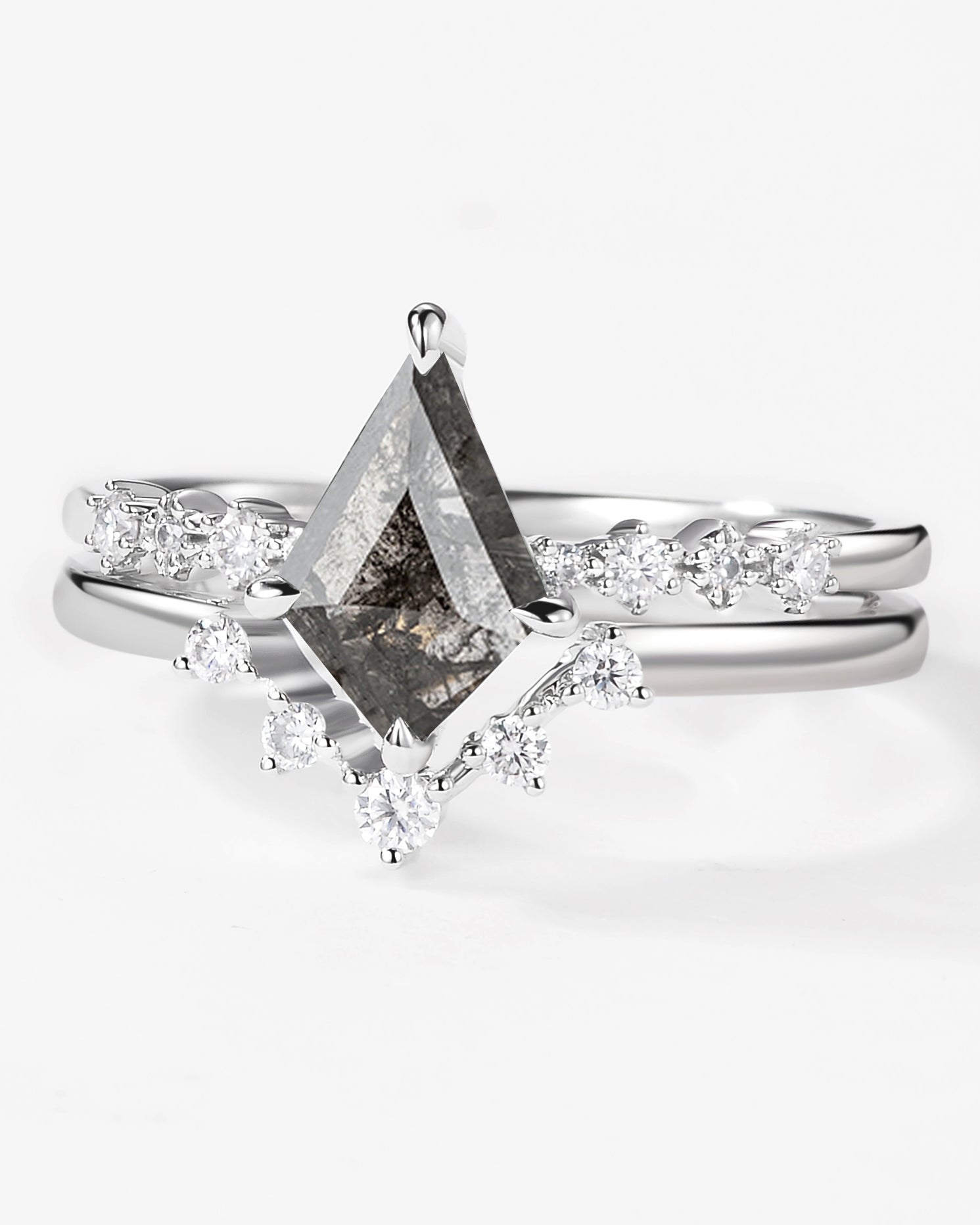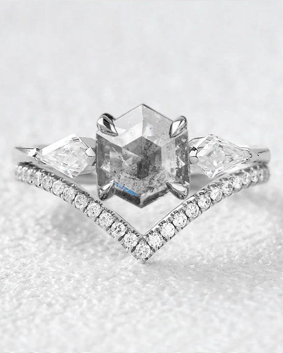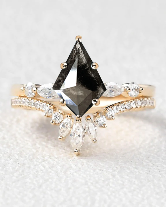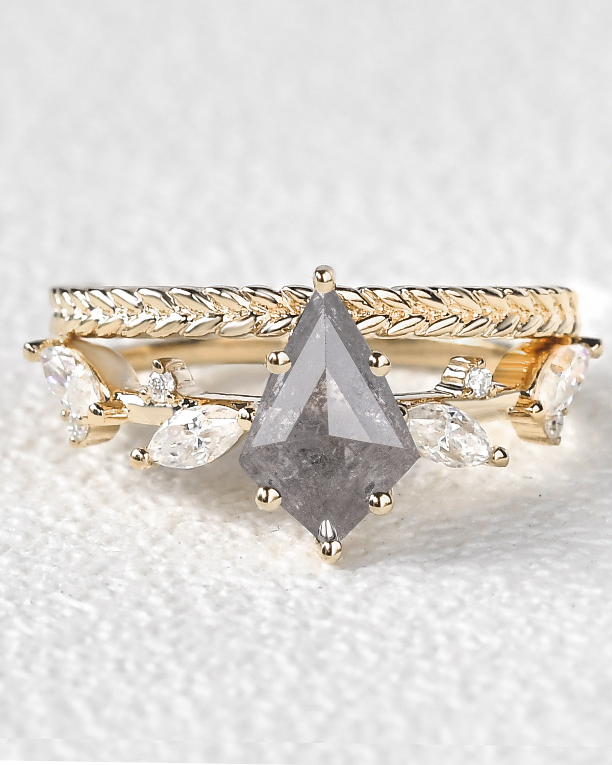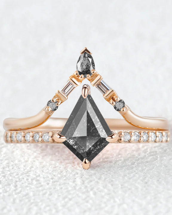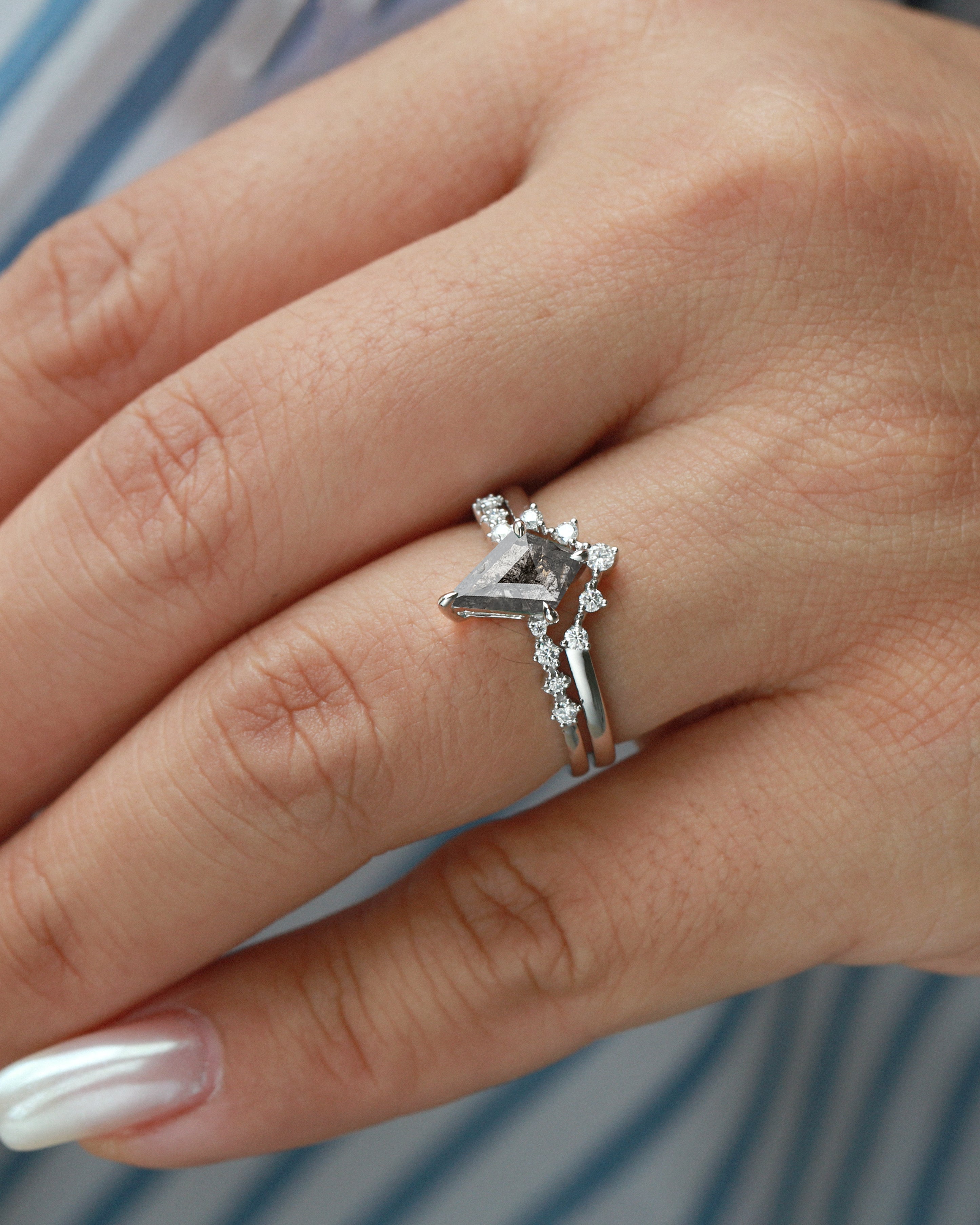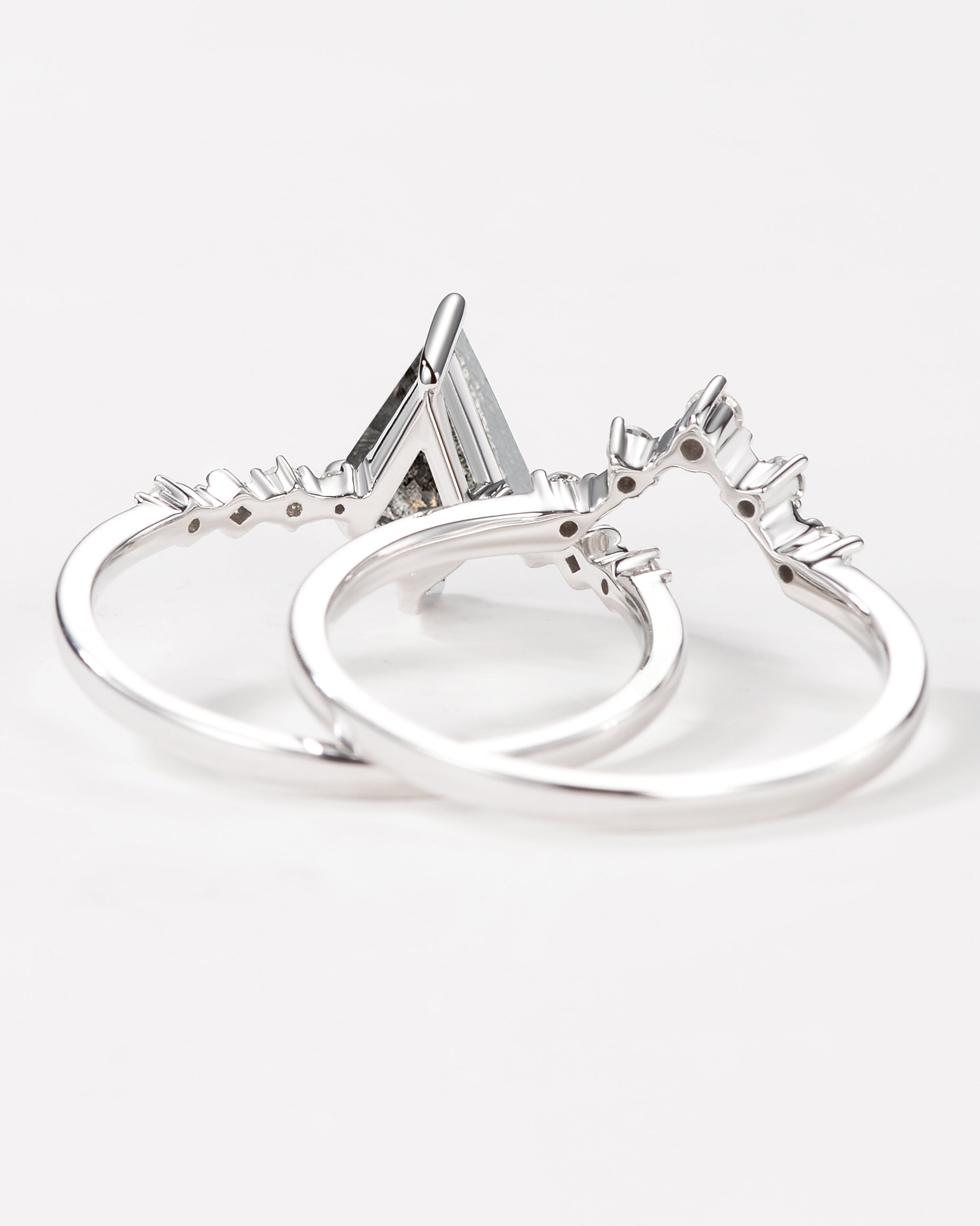 "Pepper" refers to black inclusions, while "salt" refers to white inclusions. Salt and Pepper Diamonds are typically earthy tones that go beyond pure black and white. The black inclusions inside diamonds are like the stars in the night sky. The exquisite, unique, and eclectic kite cut salt and pepper diamond engagement ring has both a vintage and modern feel. With these brilliant and special starry unique engagement rings from felicegals, you can capture the touching moments of your love and bravely pursue it.