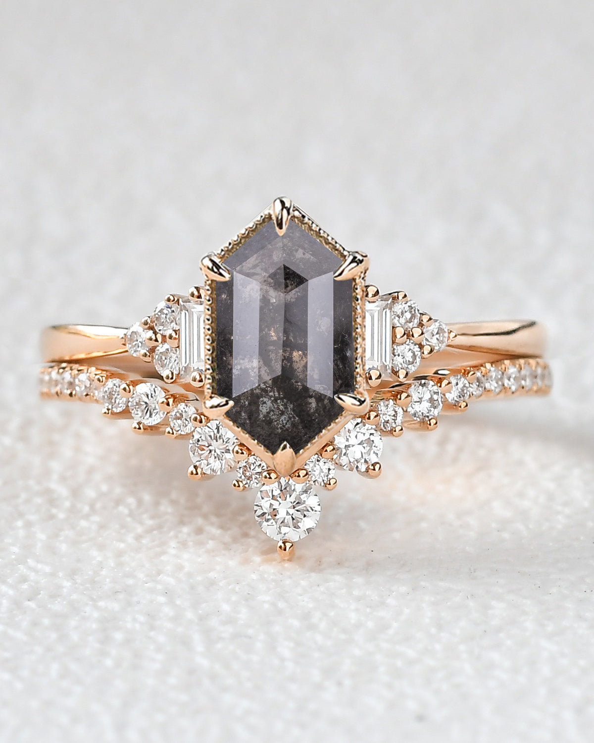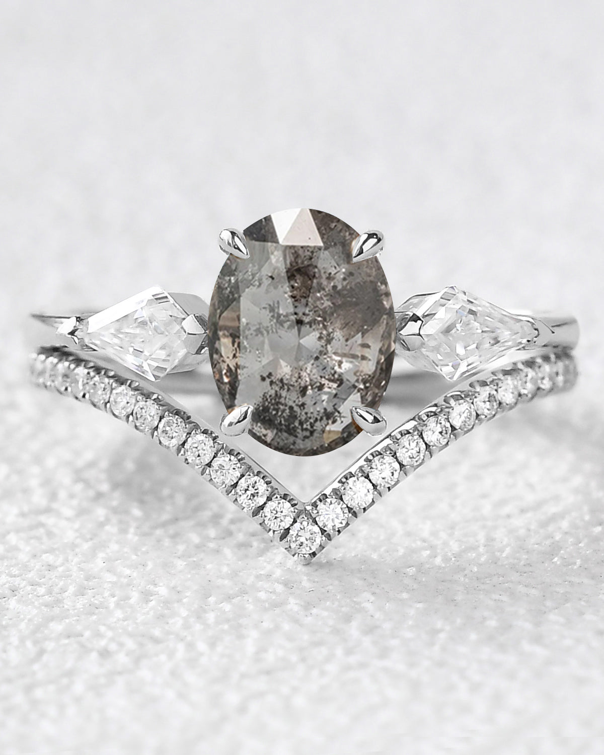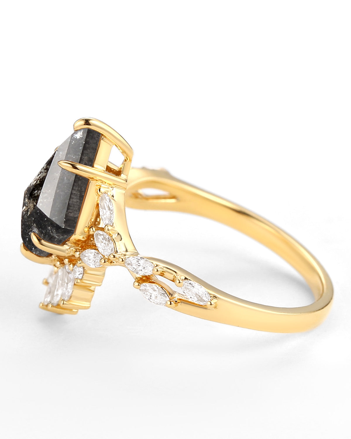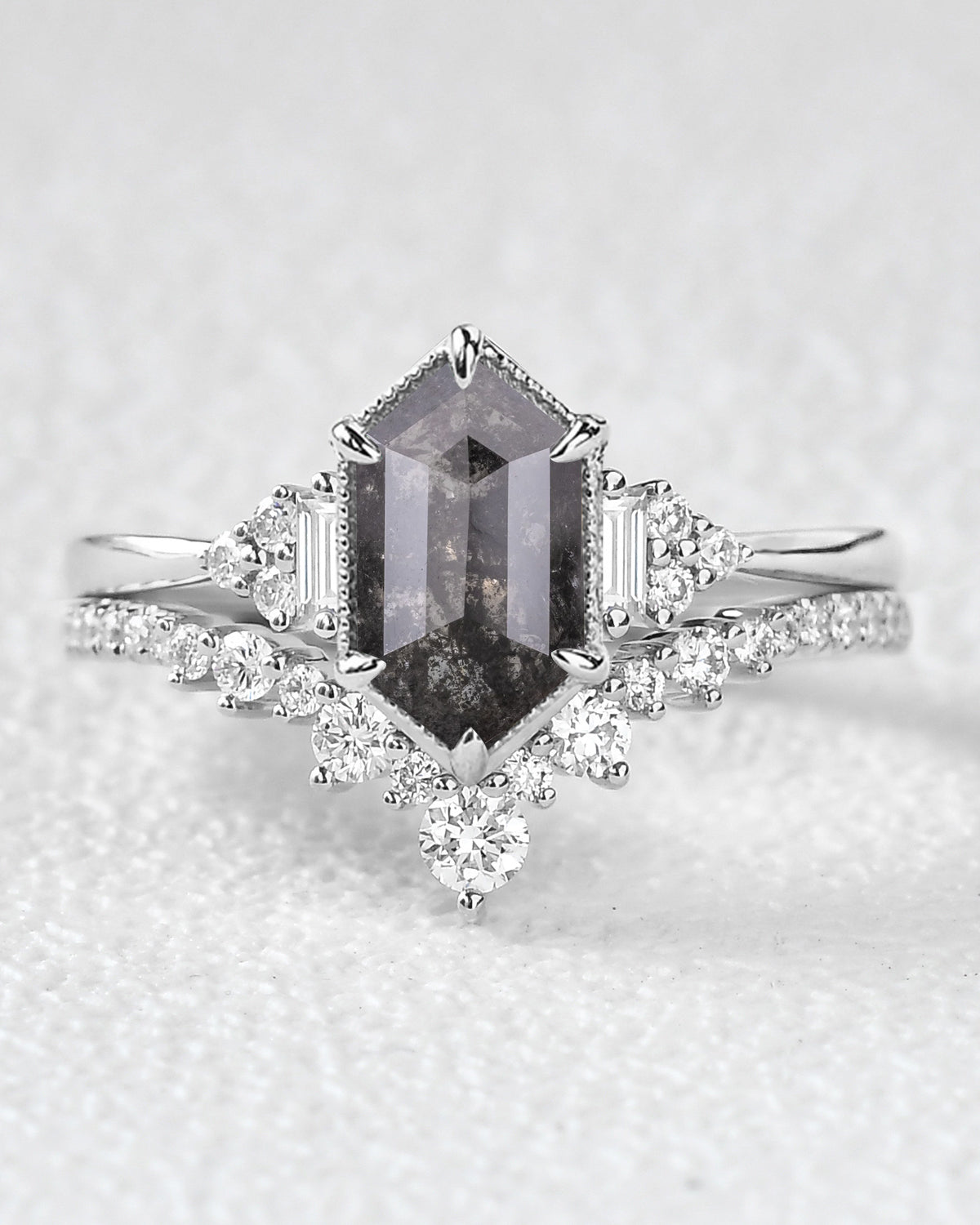 "Pepper" refers to black inclusions, while "salt" refers to white inclusions. Salt and Pepper Diamonds are typically earthy tones that go beyond pure black and white. The black inclusions inside diamonds are like the stars in the night sky. The exquisite, unique, and eclectic kite cut salt and pepper diamond engagement ring has both a vintage and modern feel. With these brilliant and special starry unique engagement rings from felicegals, you can capture the touching moments of your love and bravely pursue it.