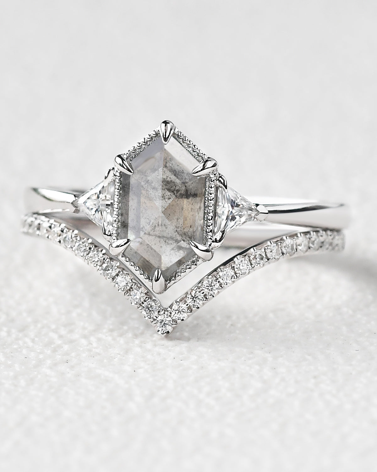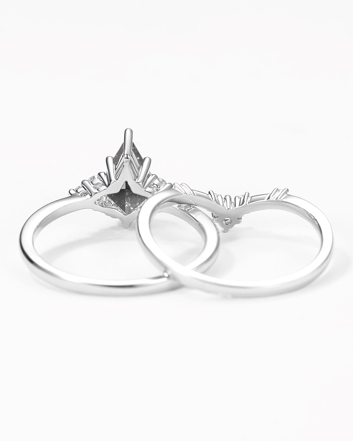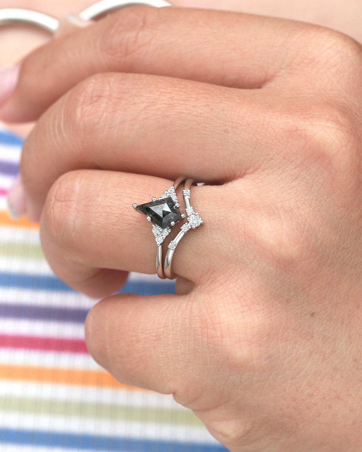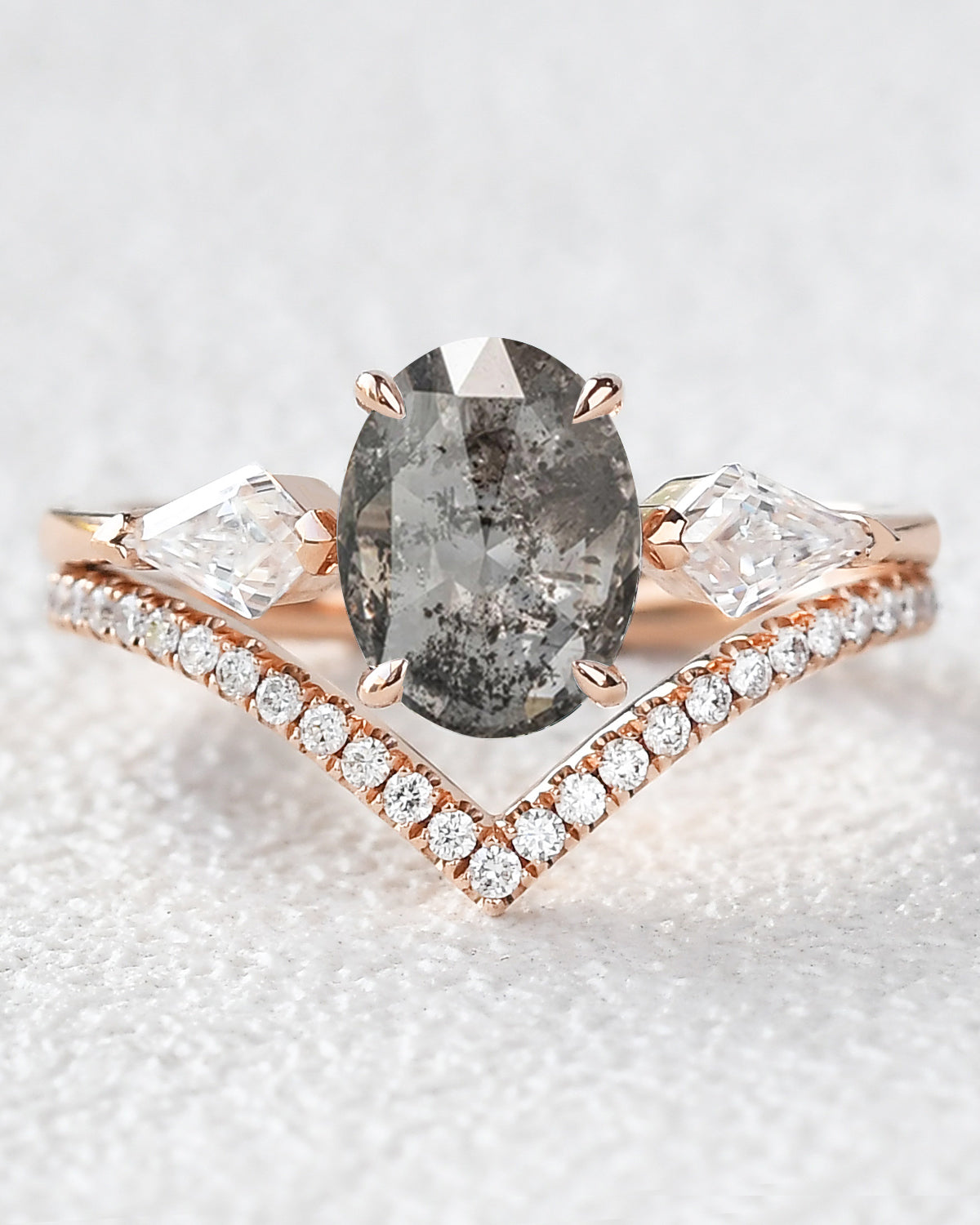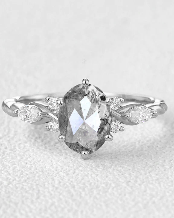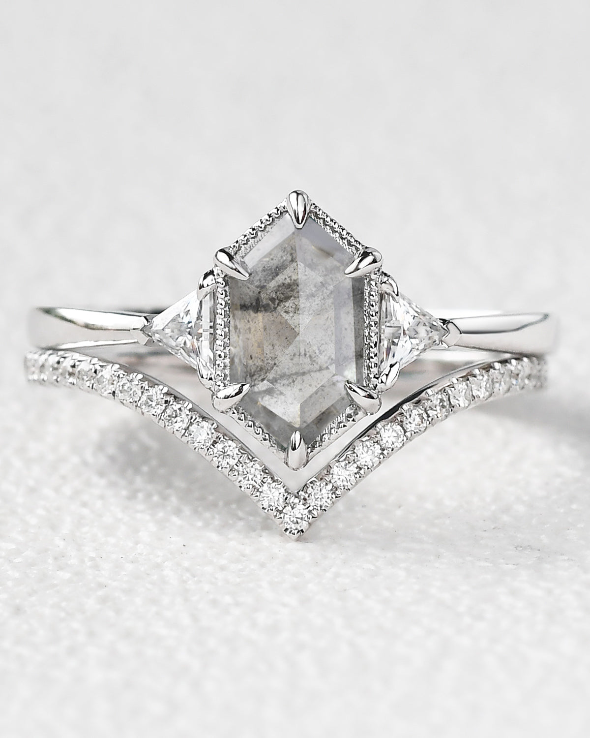 "Pepper" refers to black inclusions, while "salt" refers to white inclusions. Salt and Pepper Diamonds are typically earthy tones that go beyond pure black and white. The black inclusions inside diamonds are like the stars in the night sky. The exquisite, unique, and eclectic kite cut salt and pepper diamond engagement ring has both a vintage and modern feel. With these brilliant and special starry unique engagement rings from felicegals, you can capture the touching moments of your love and bravely pursue it.