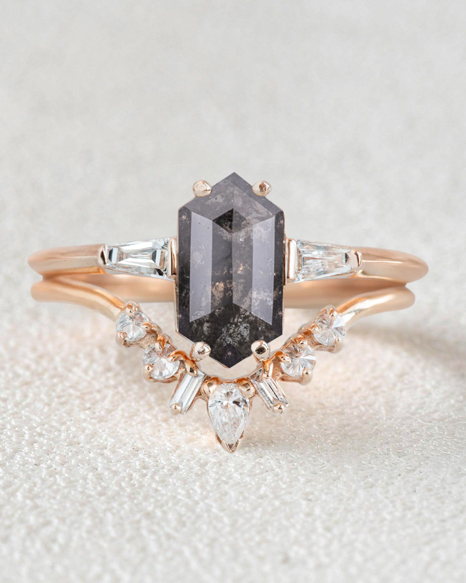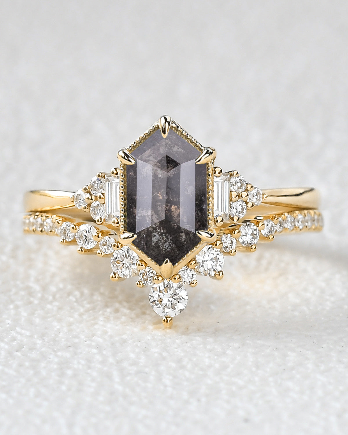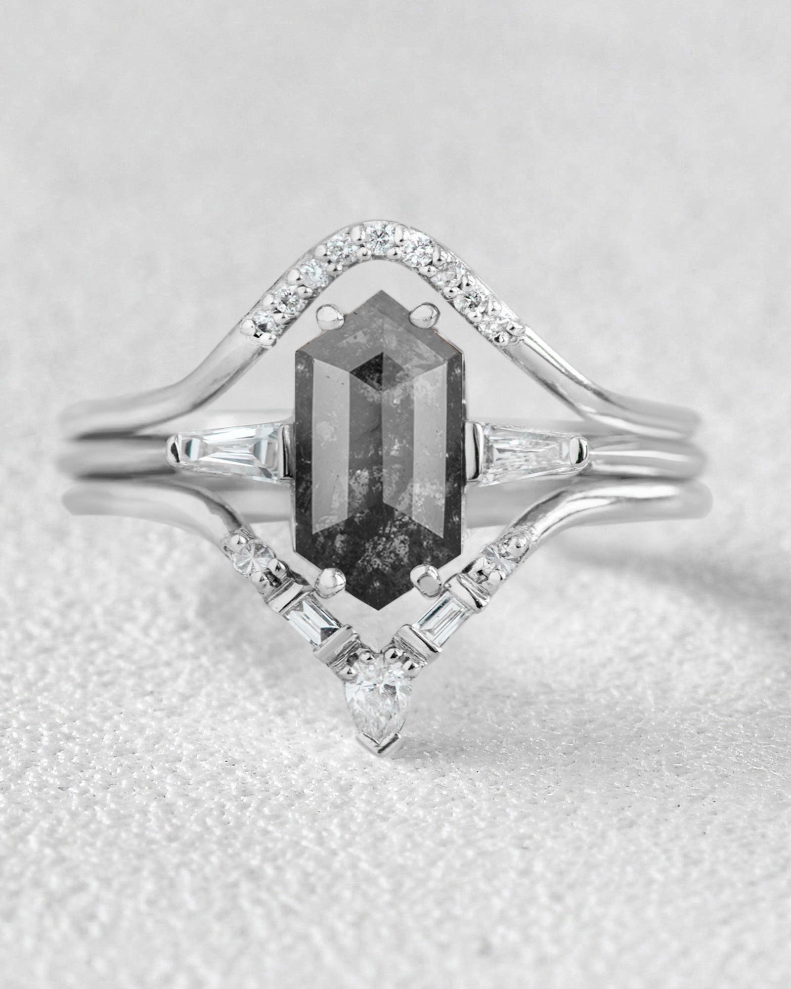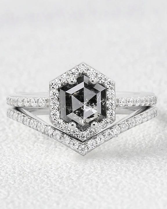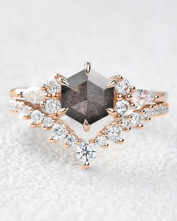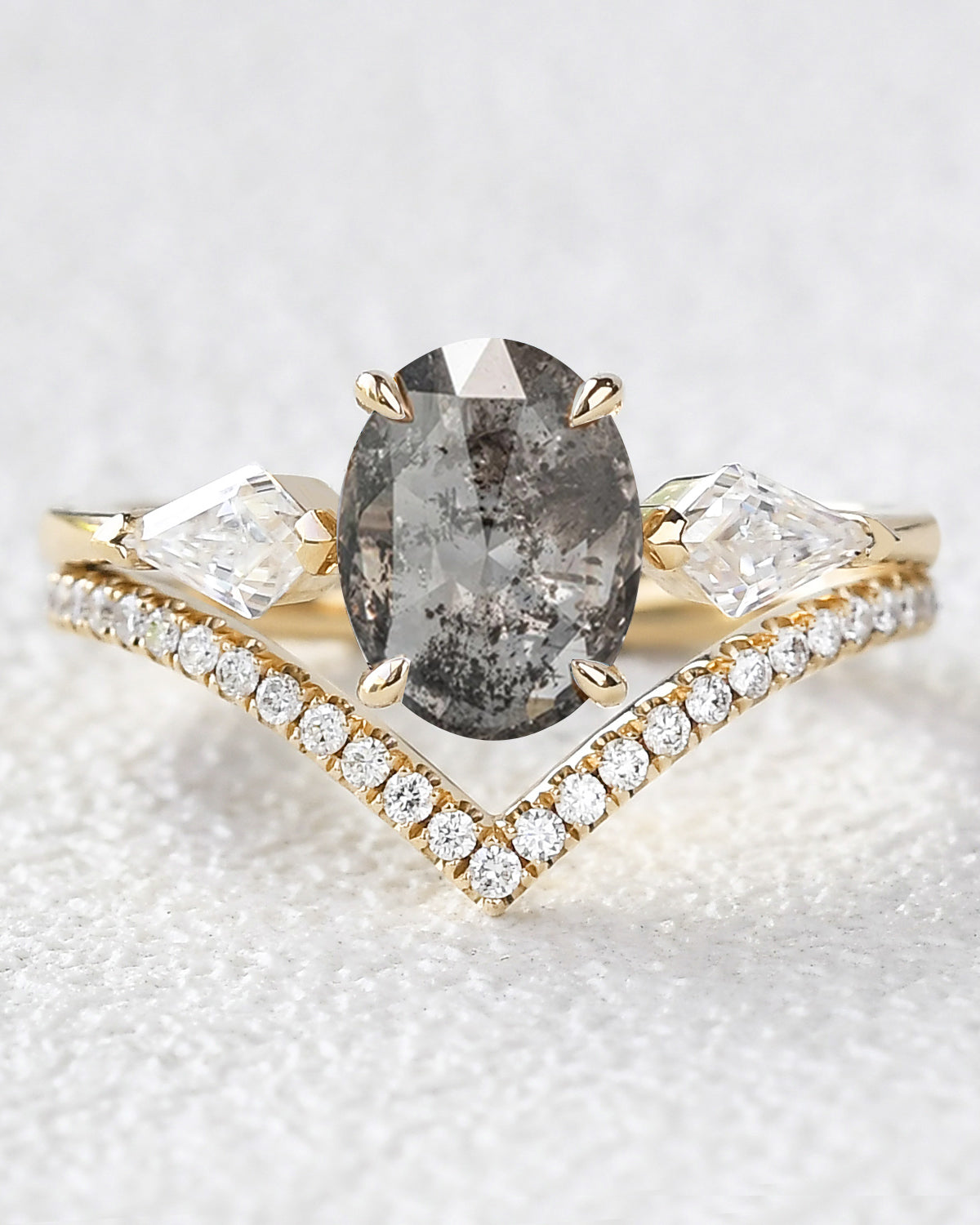 "Pepper" refers to black inclusions, while "salt" refers to white inclusions. Salt and Pepper Diamonds are typically earthy tones that go beyond pure black and white. The black inclusions inside diamonds are like the stars in the night sky. The exquisite, unique, and eclectic kite cut salt and pepper diamond engagement ring has both a vintage and modern feel. With these brilliant and special starry unique engagement rings from felicegals, you can capture the touching moments of your love and bravely pursue it.
