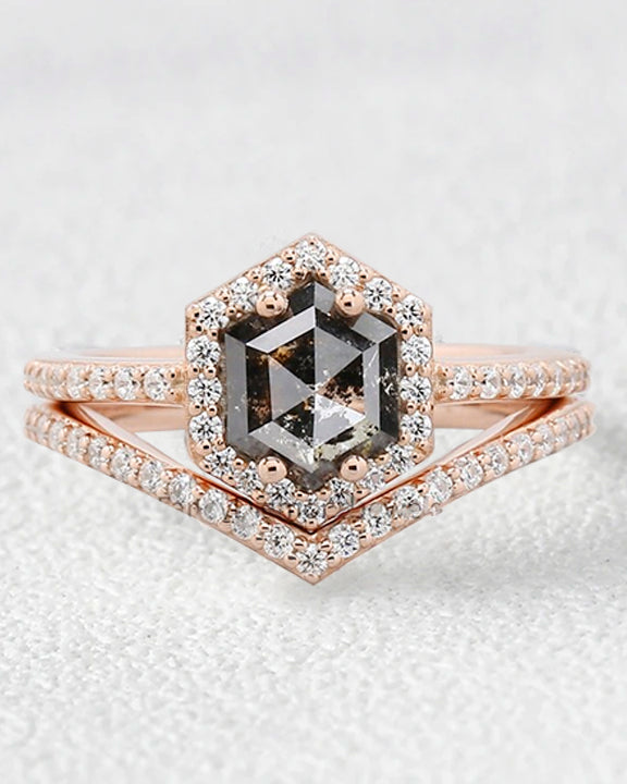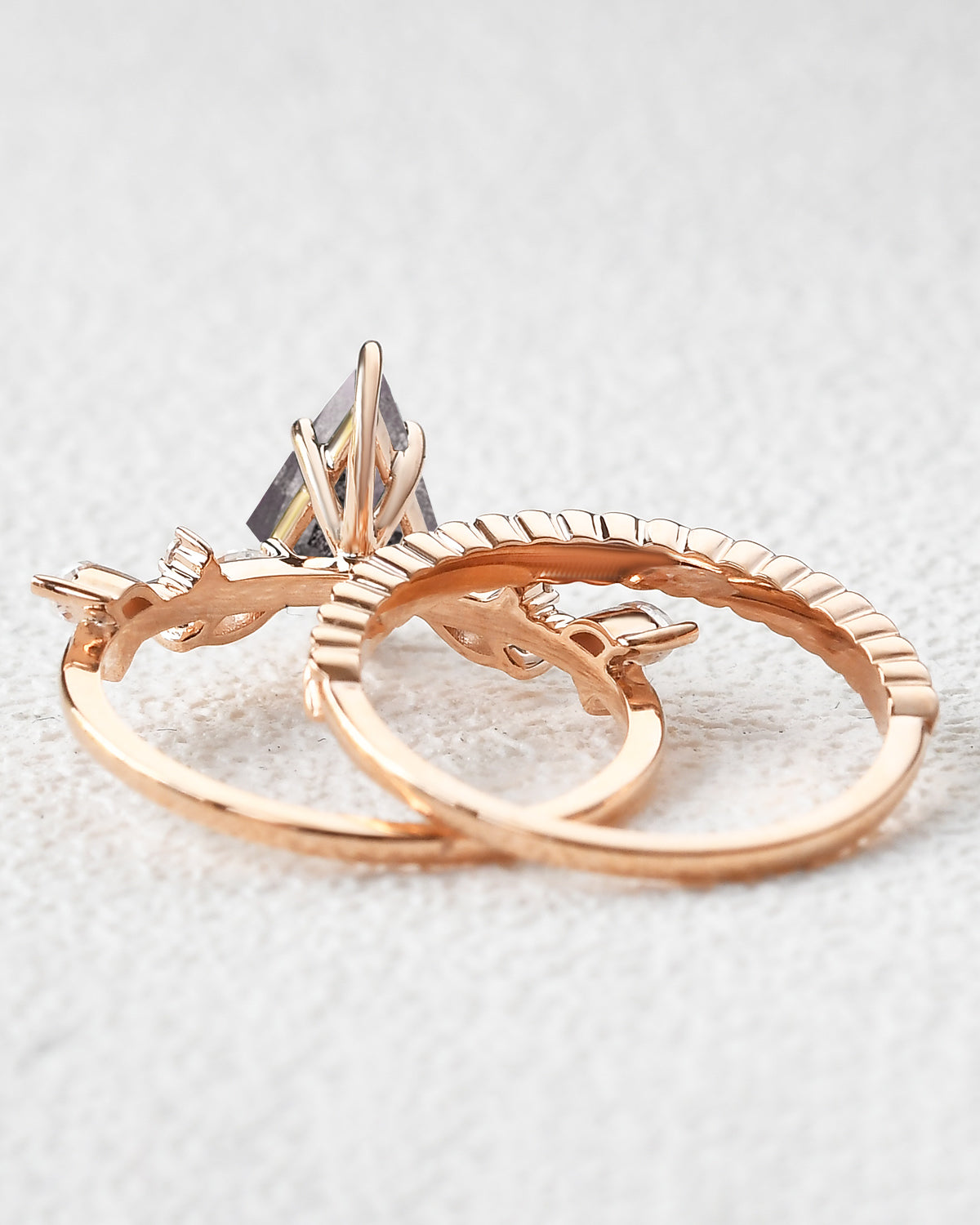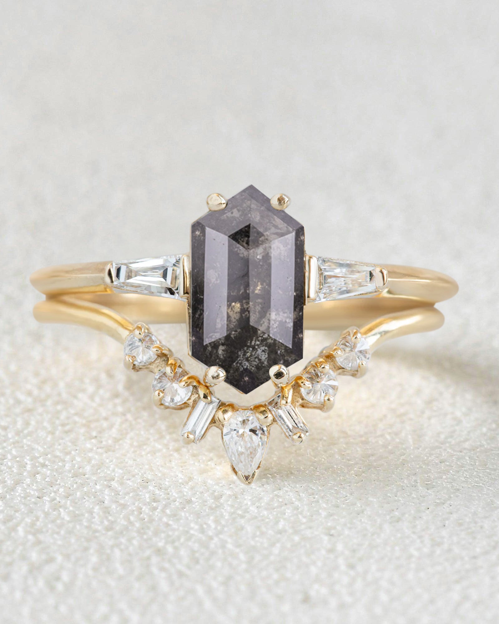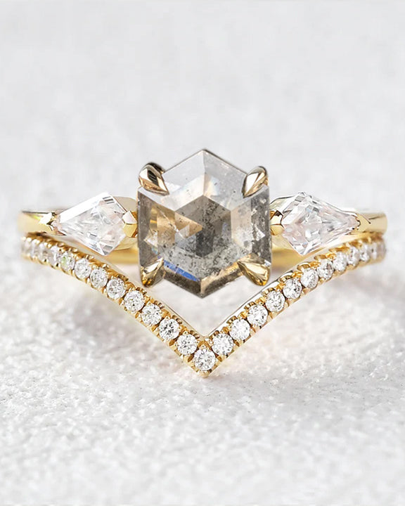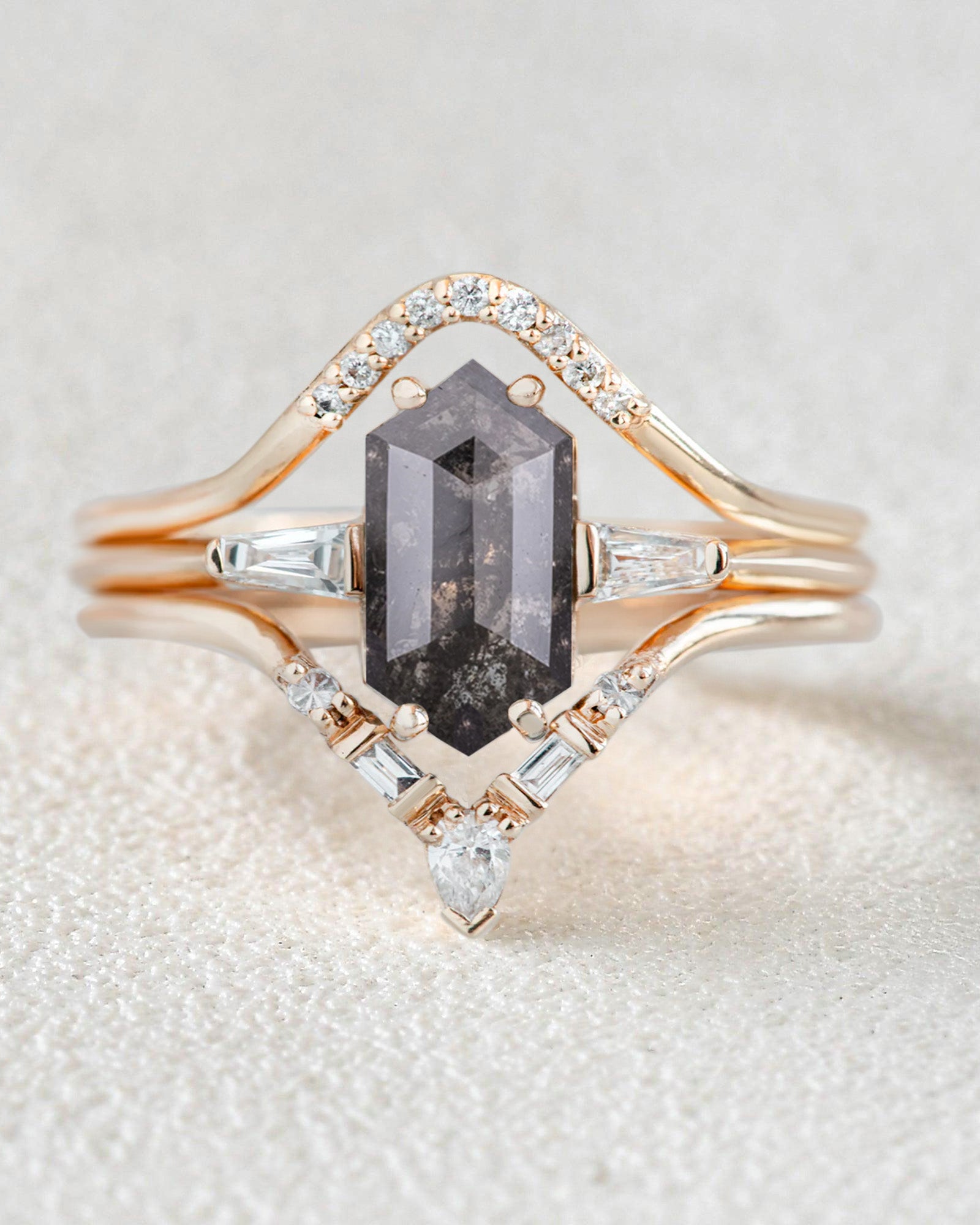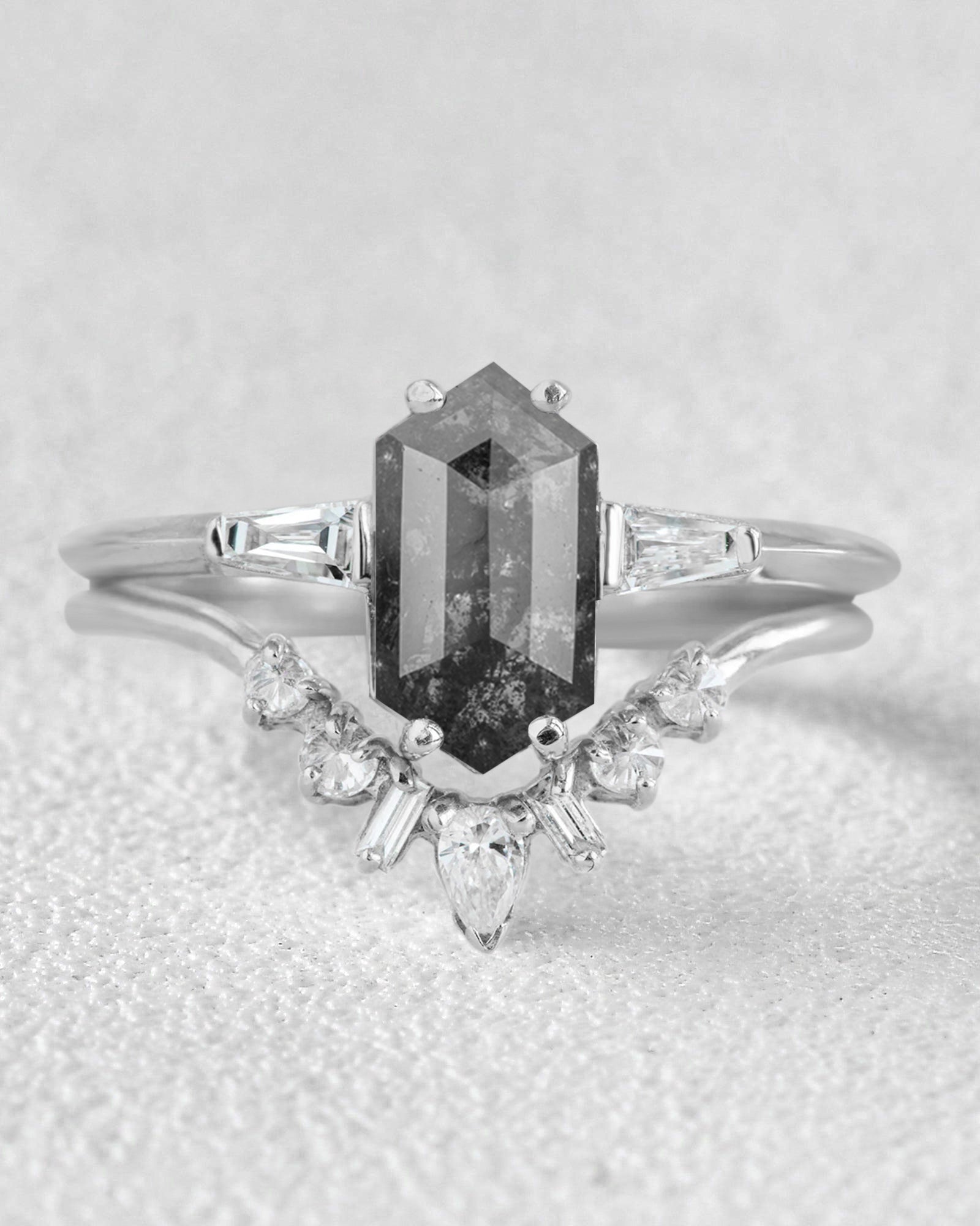 "Pepper" refers to black inclusions, while "salt" refers to white inclusions. Salt and Pepper Diamonds are typically earthy tones that go beyond pure black and white. The black inclusions inside diamonds are like the stars in the night sky. The exquisite, unique, and eclectic kite cut salt and pepper diamond engagement ring has both a vintage and modern feel. With these brilliant and special starry unique engagement rings from felicegals, you can capture the touching moments of your love and bravely pursue it.