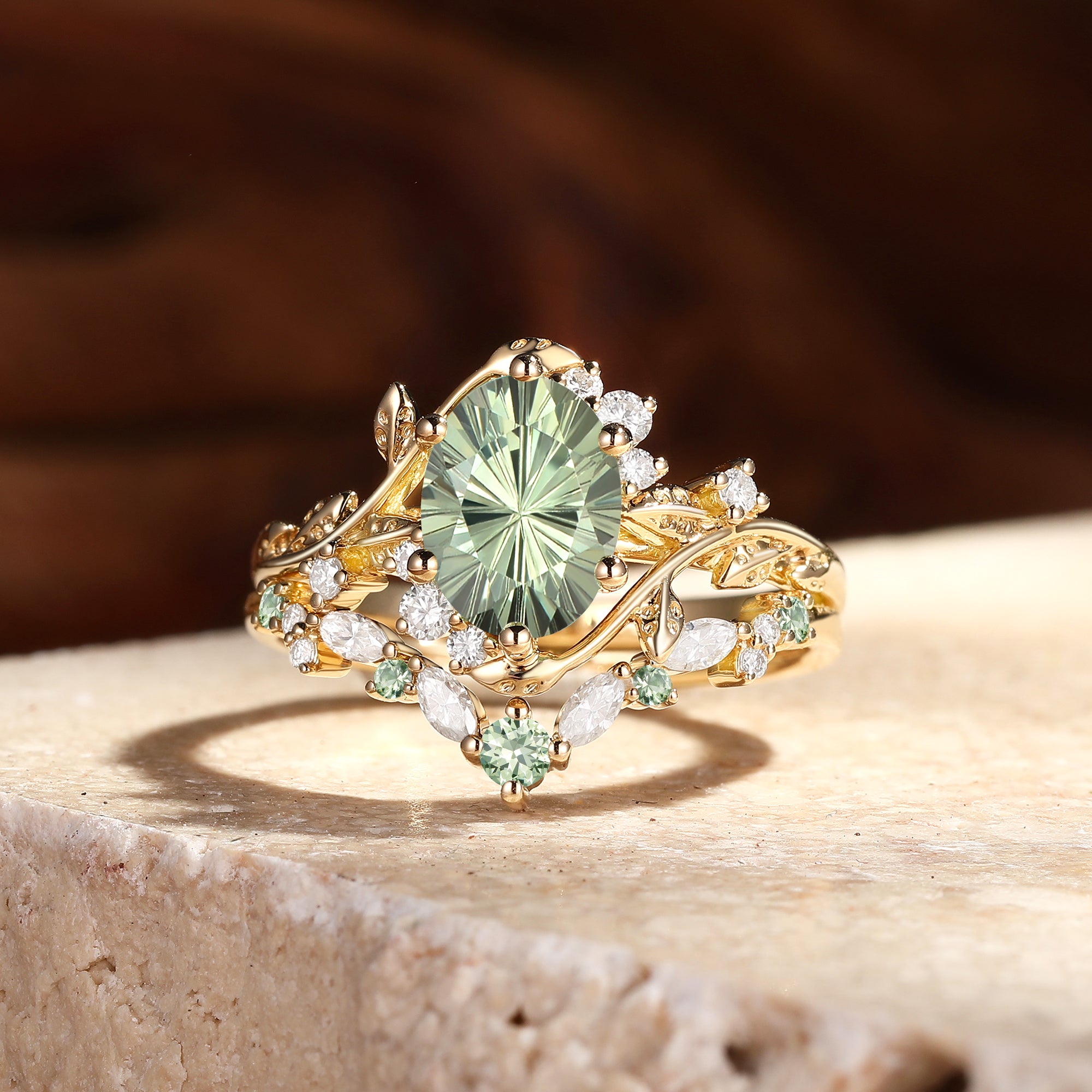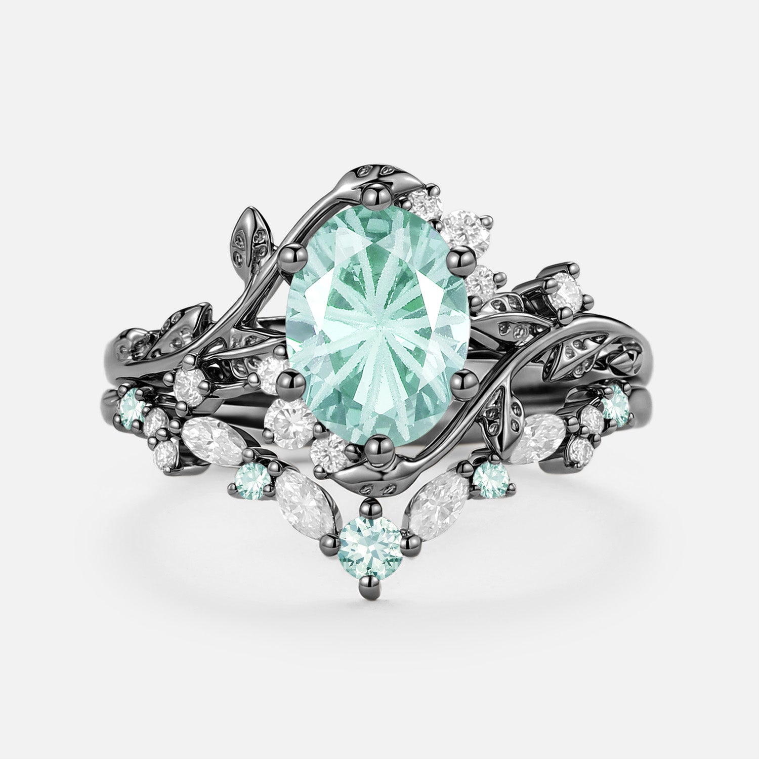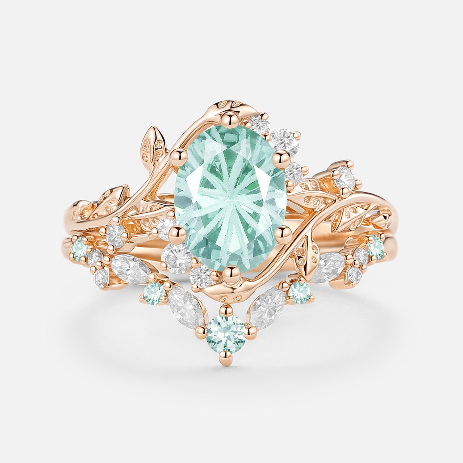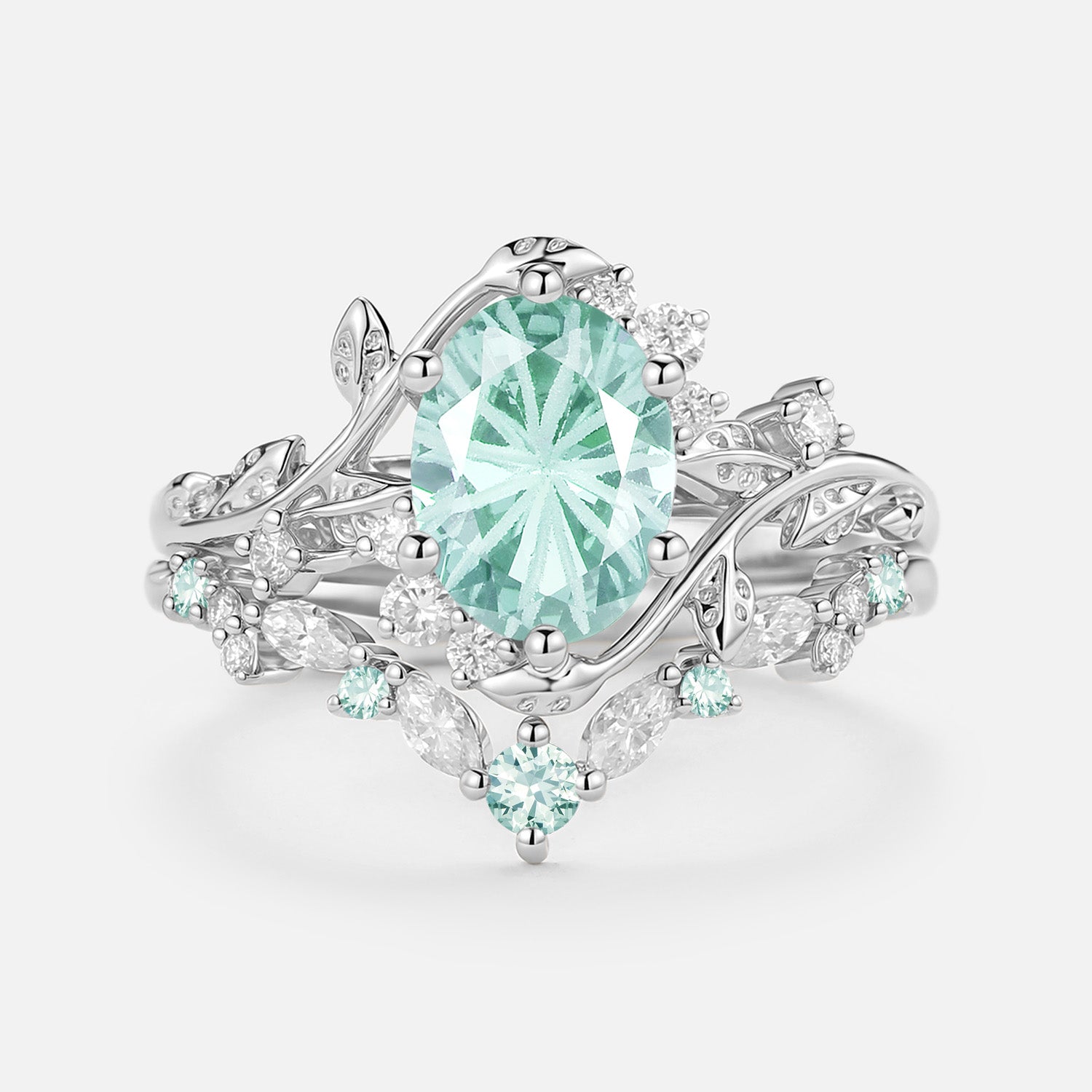The Lilac set is breathtaking! The firework cut oval lab green sapphire sparkles like crazy, and the leafy bands feel natural and romantic. The two rings stack perfectly—quality is outstanding.