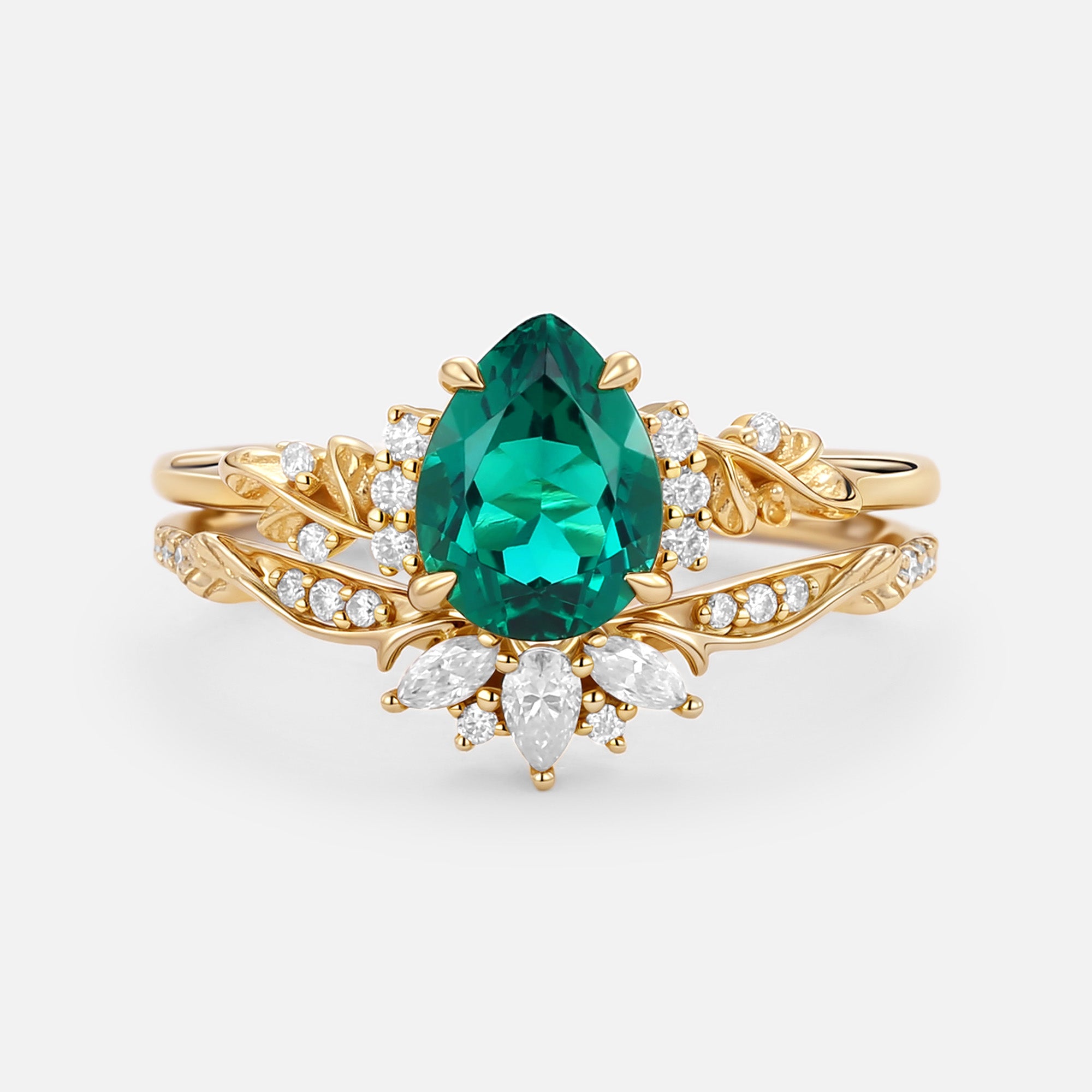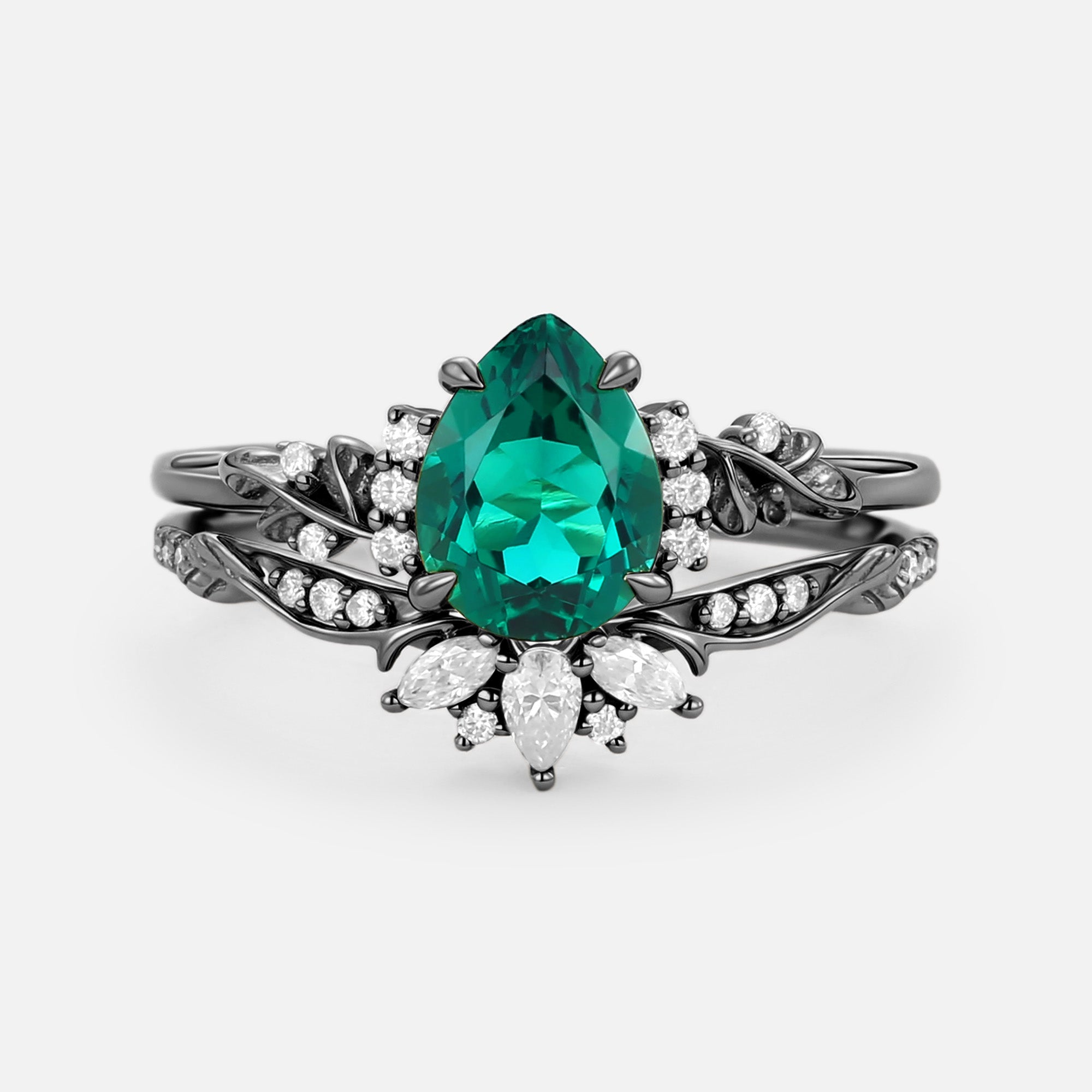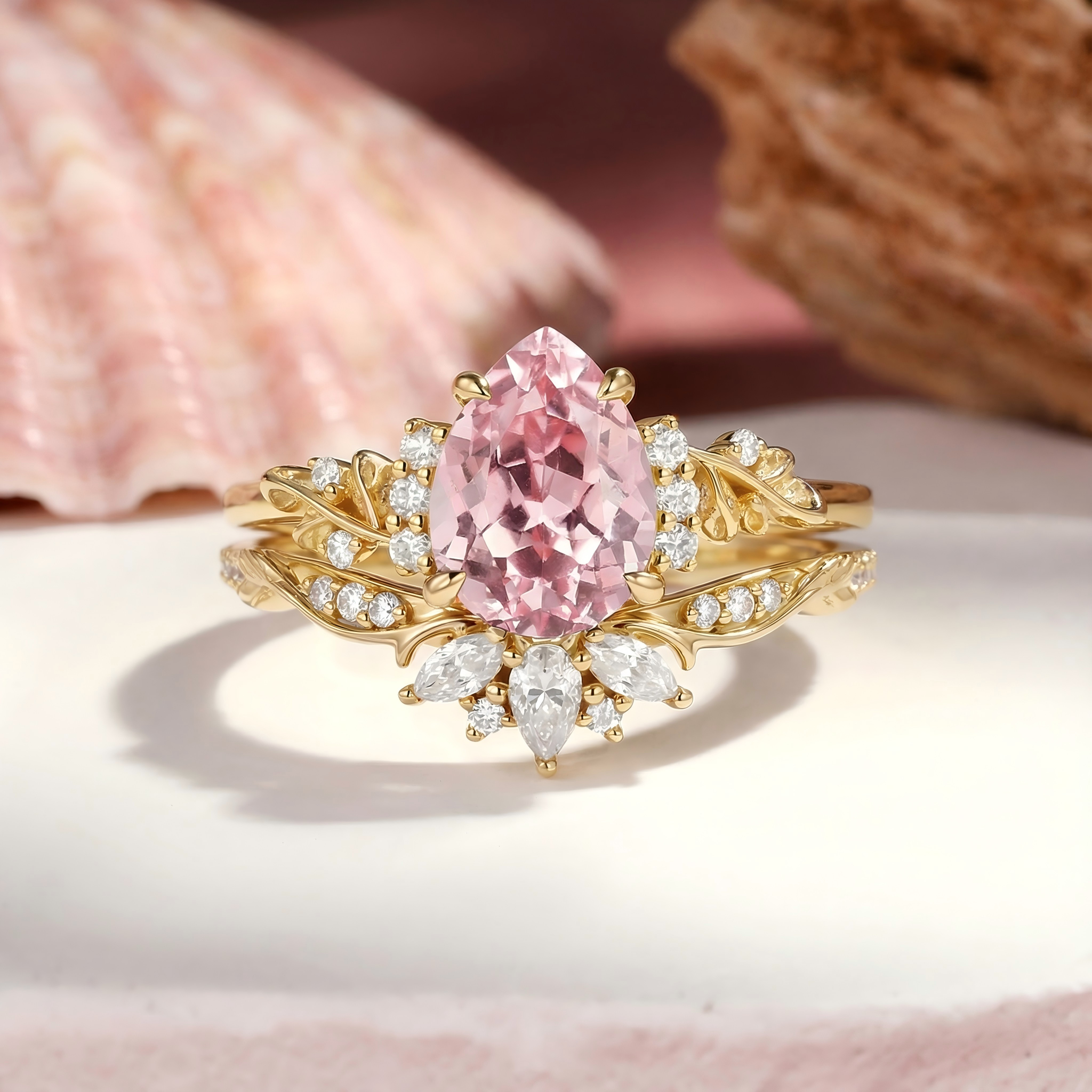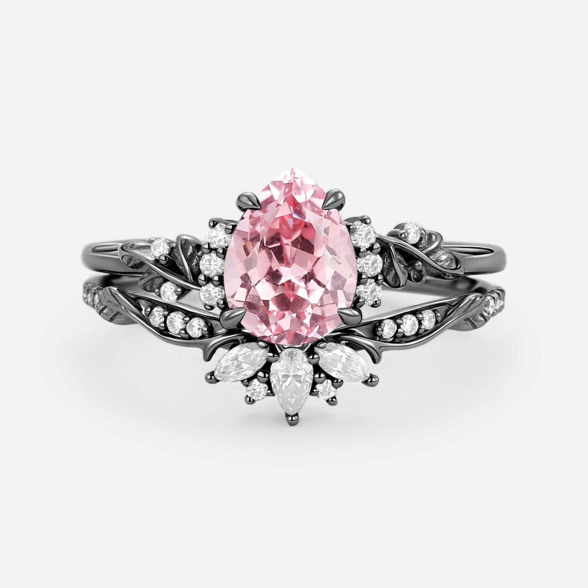 Flower Pear Cut Lab Pink Sapphire Leafy Ring Sets 2pcs - Lola