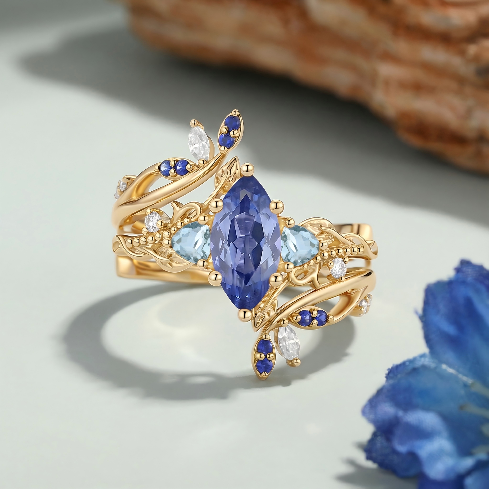 Marquise Lab Cornflower Sapphire Leafy Engagement Ring Sets 2pcs - Thistle
