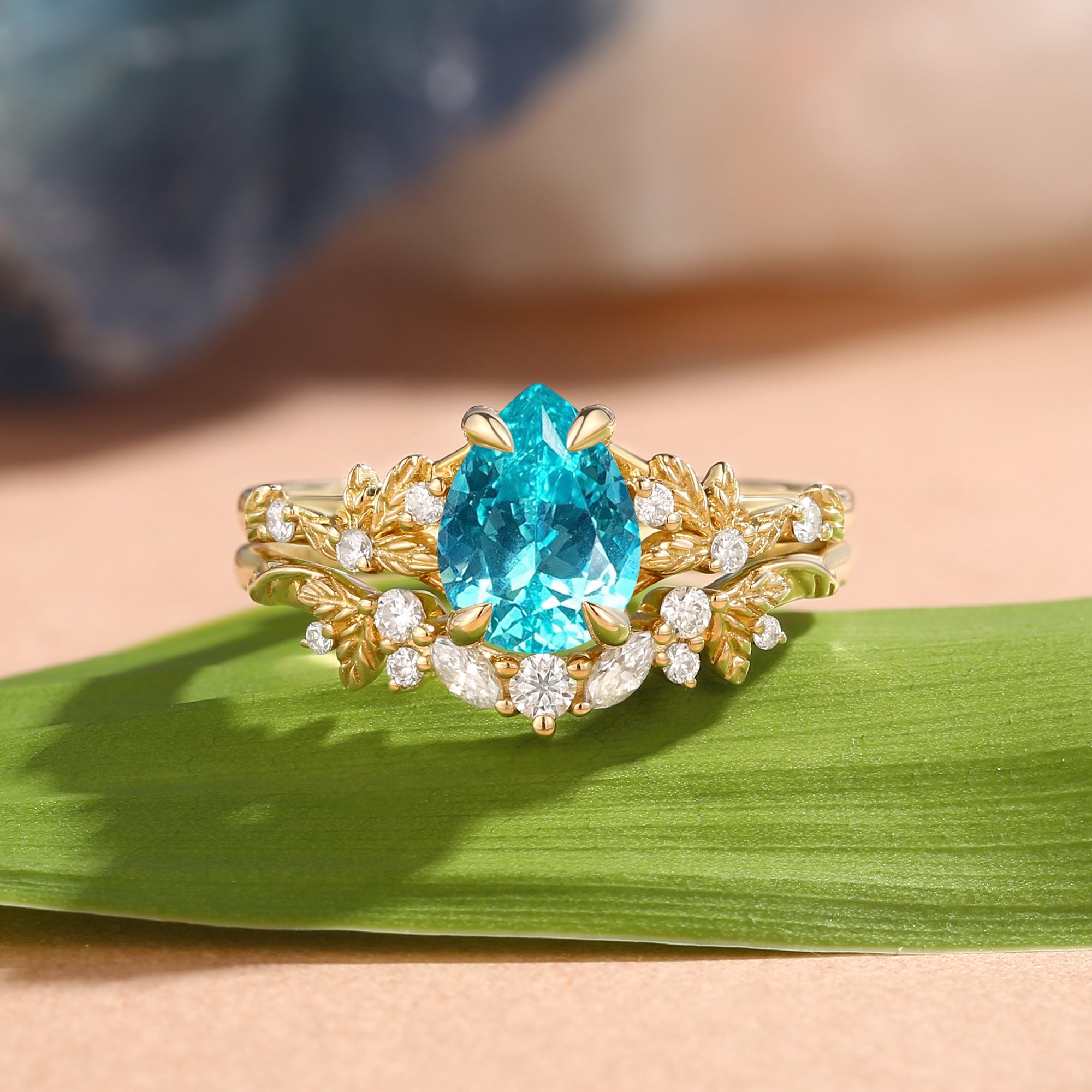 Pear Cut Lab Paraiba Leaf Engagement Ring Set 2pcs - Parea