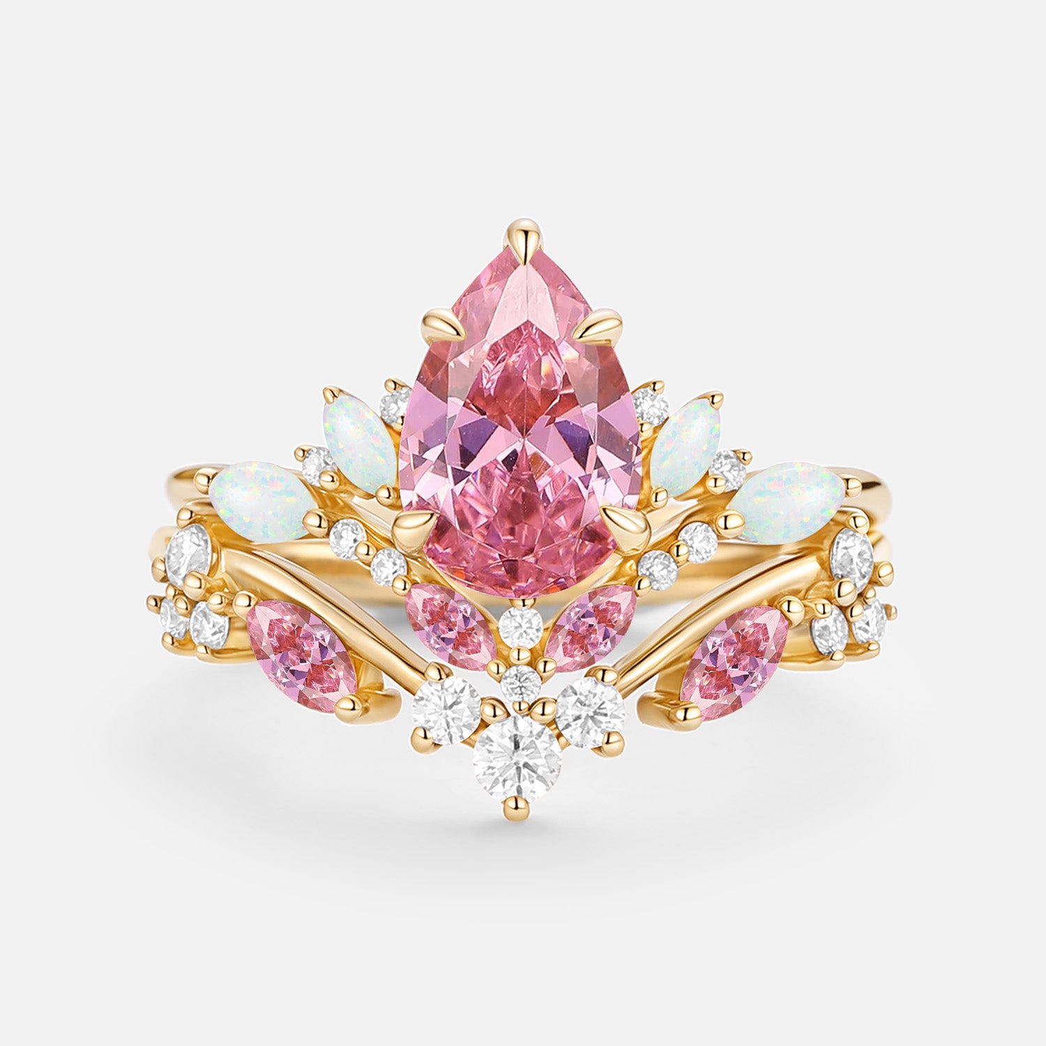 Pear Cut Lab Padparadscha Sapphire & Lab Opal Leafy Ring Sets 2pcs - Nectar