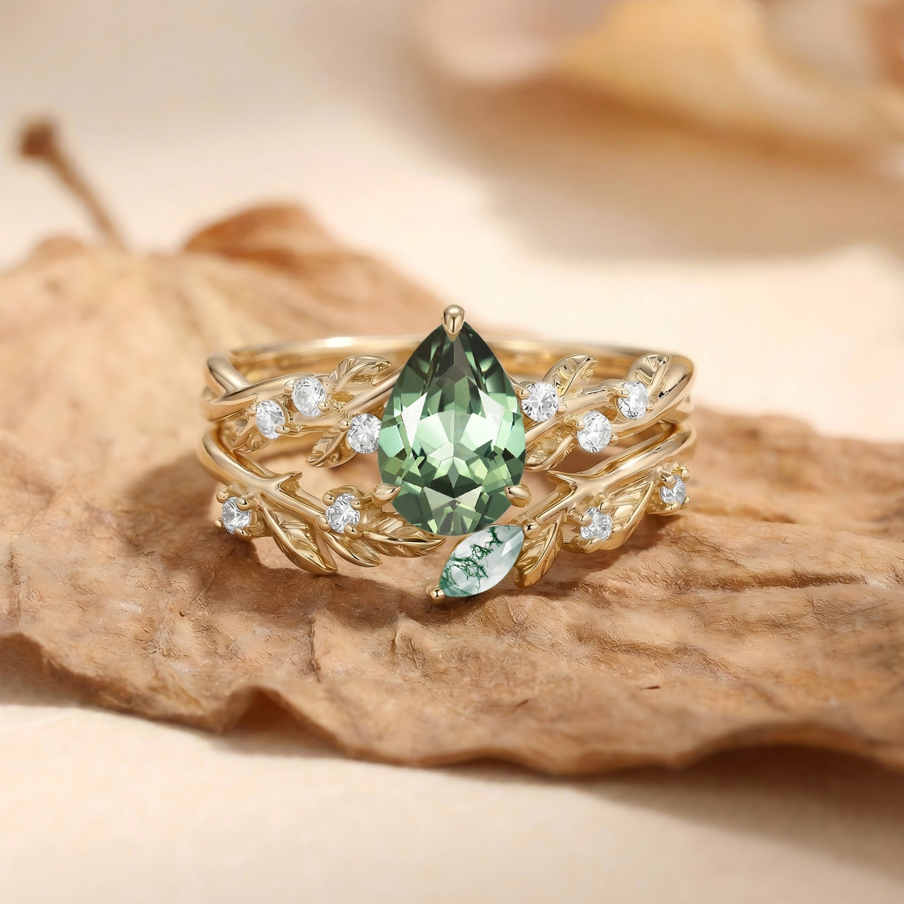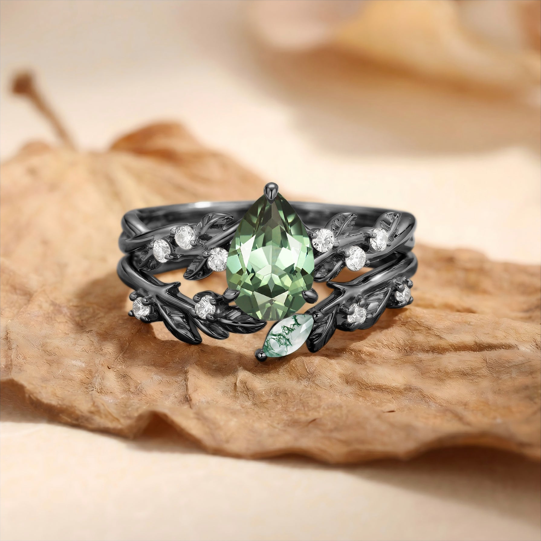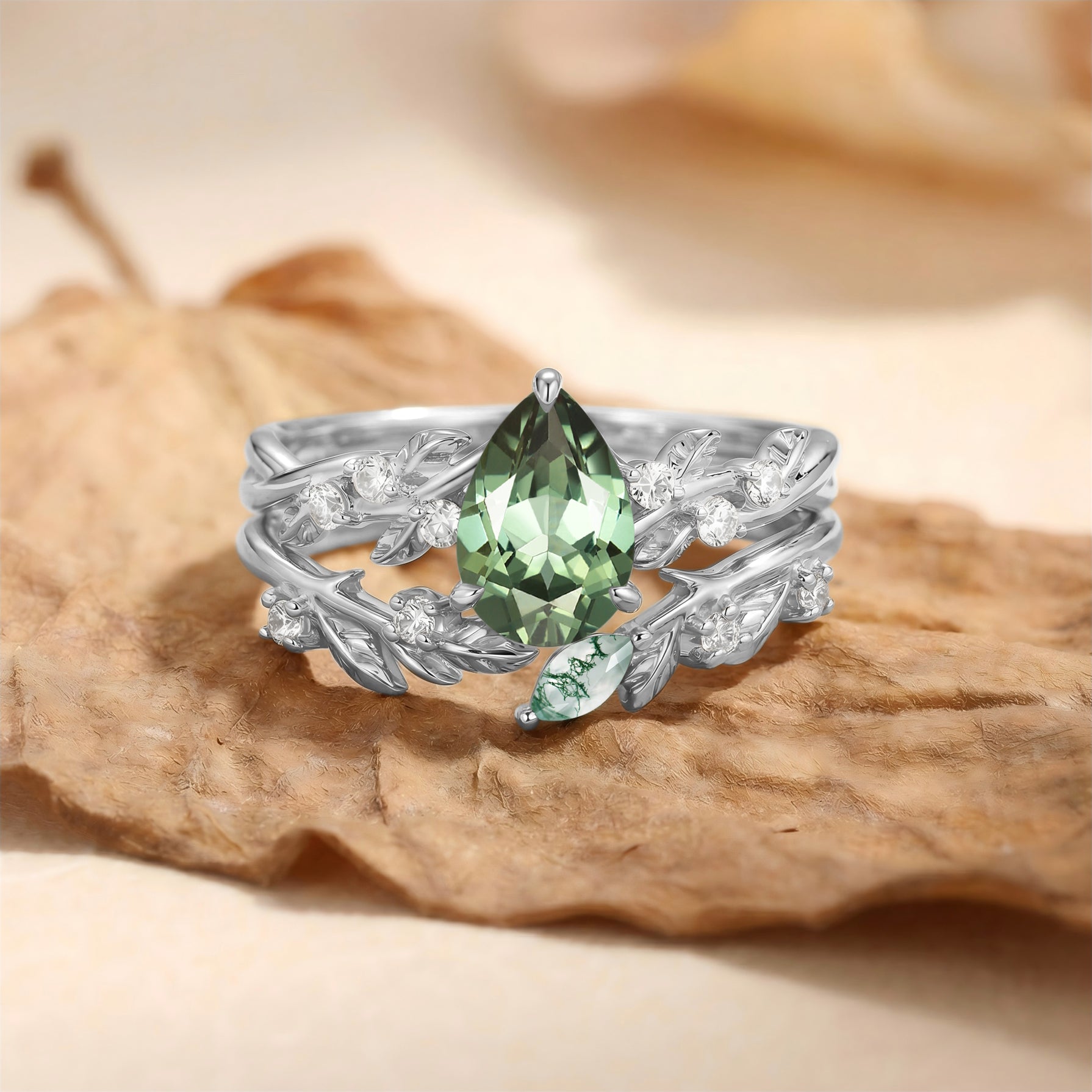 Pear Cut Leafy Lab Green Sapphire Engagement Ring Set 2pcs - Leto
