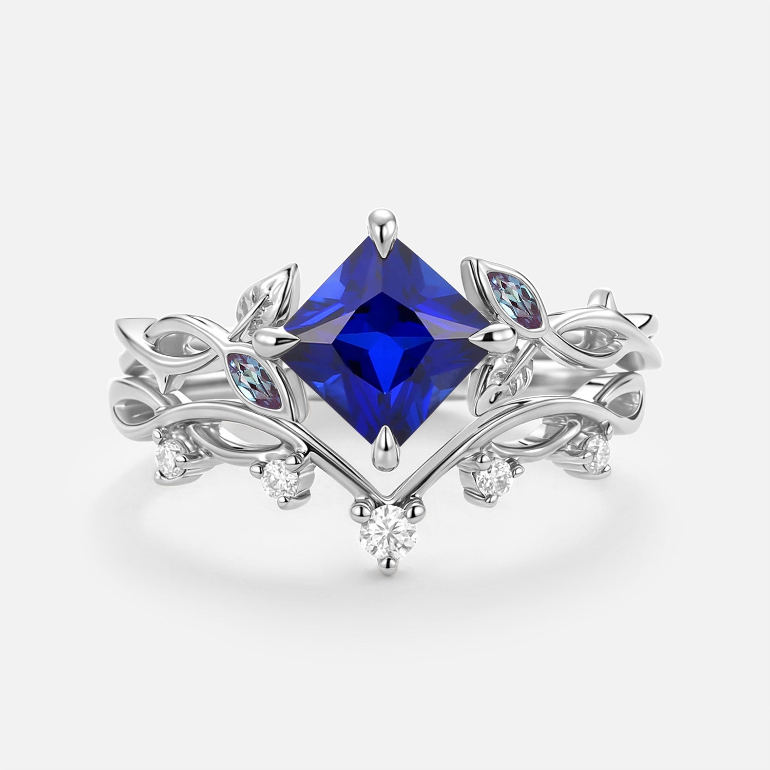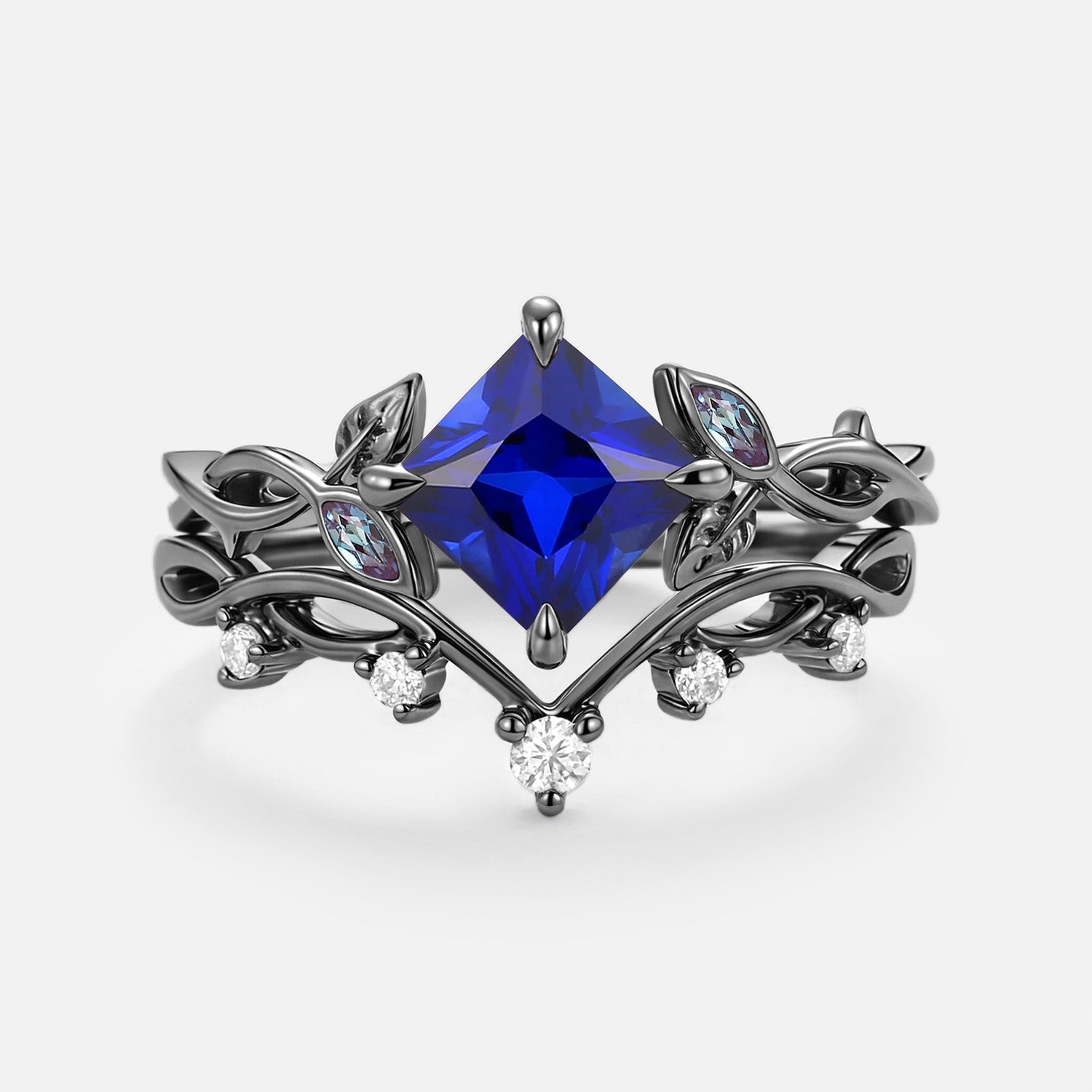 Princess Cut Lab Sapphire Twist Leafy Engagement Ring Set- Sable