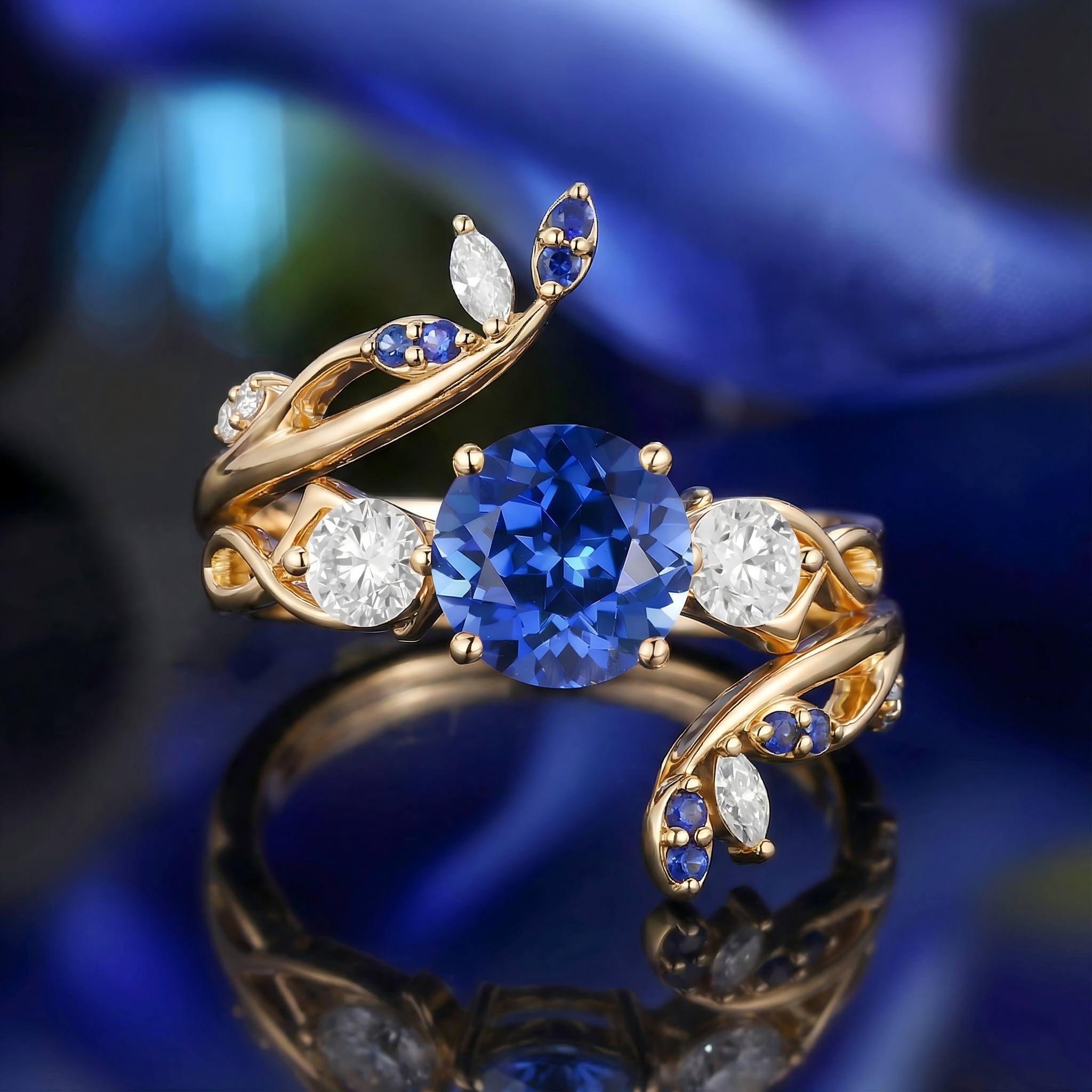 Round Cut Lab Sapphire Leafy Cage Engagement Ring Set 2pcs - Blush