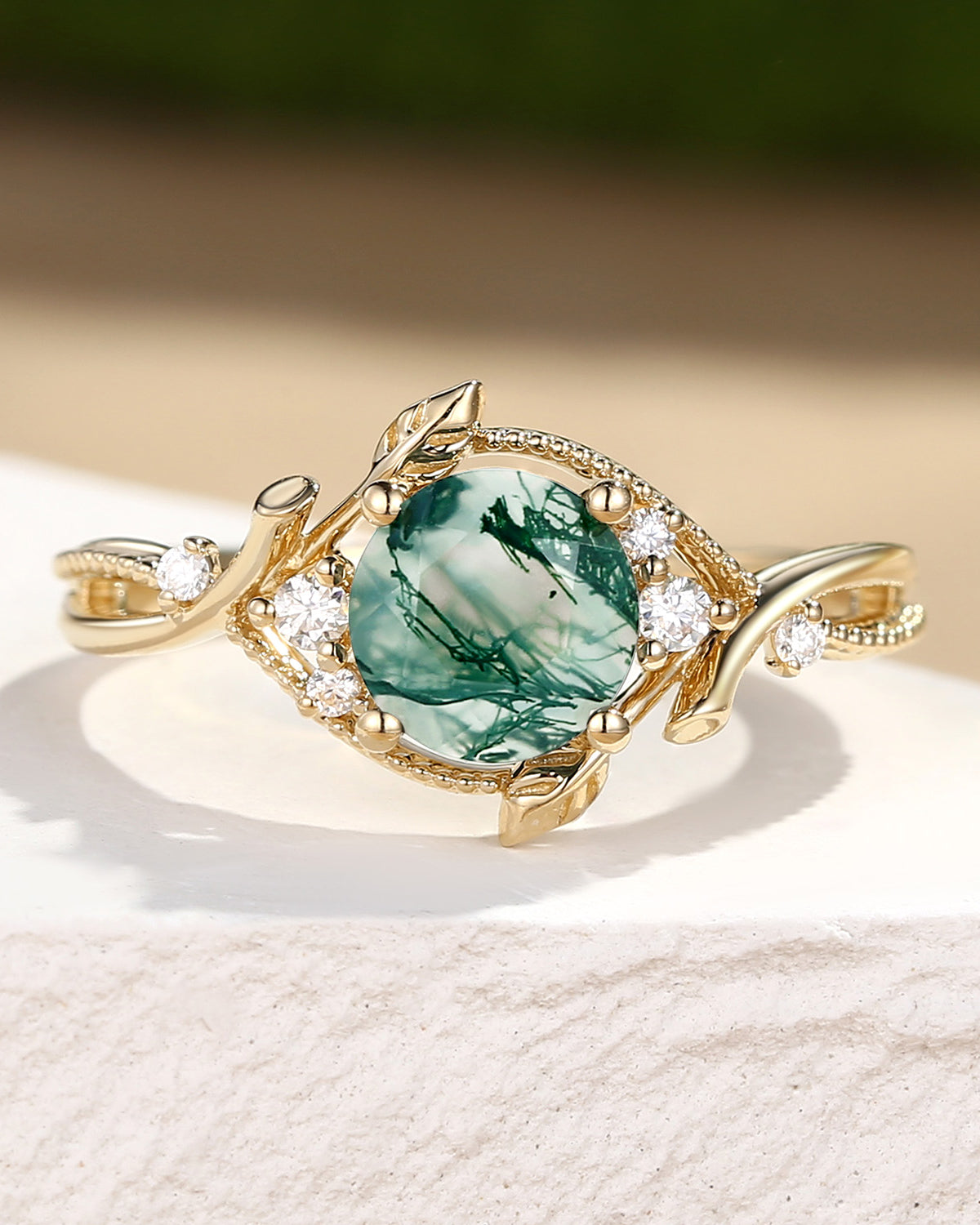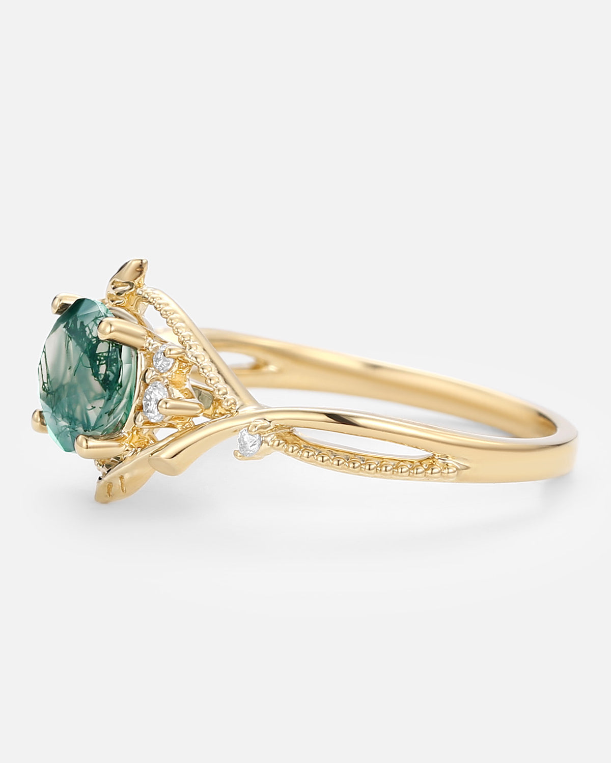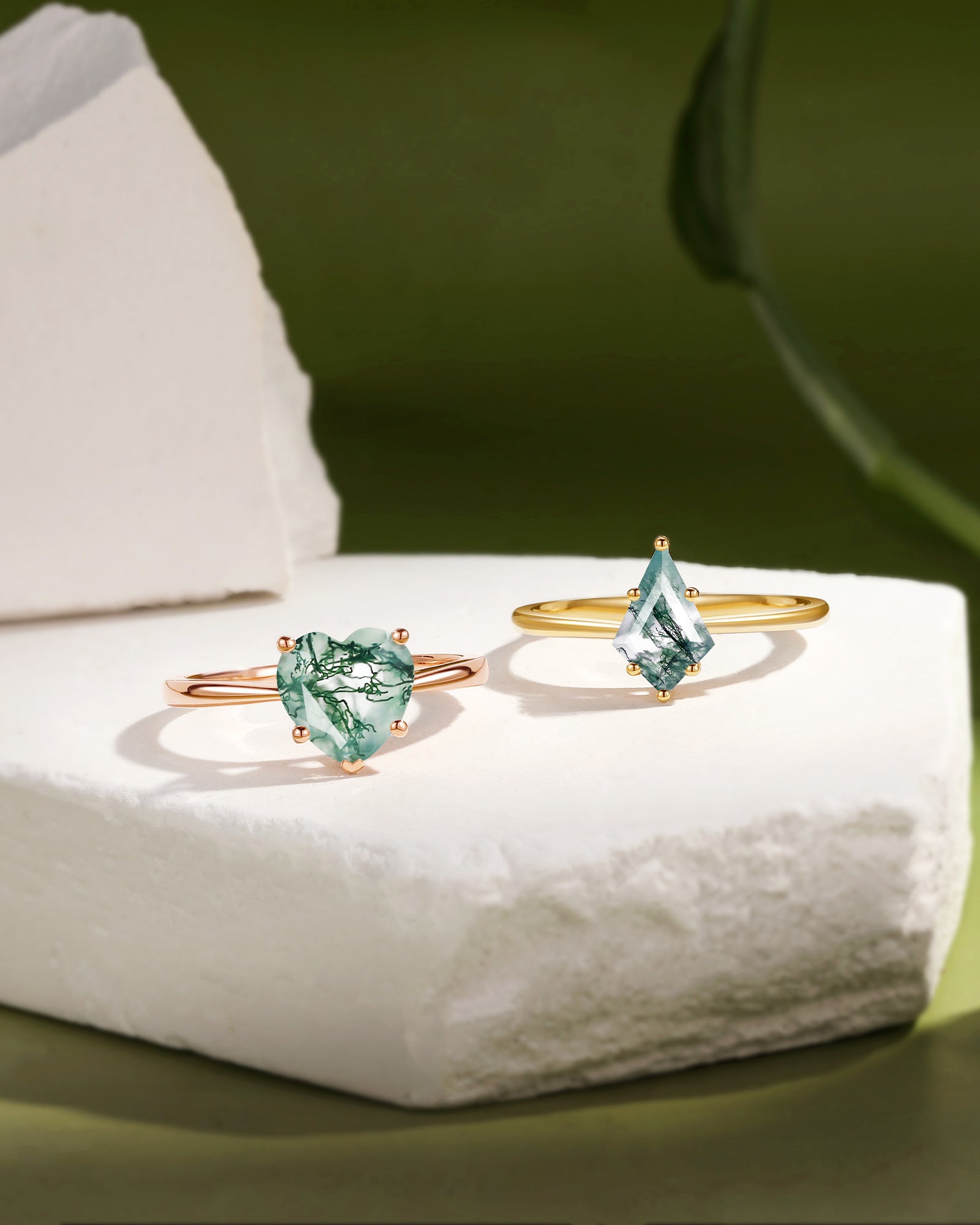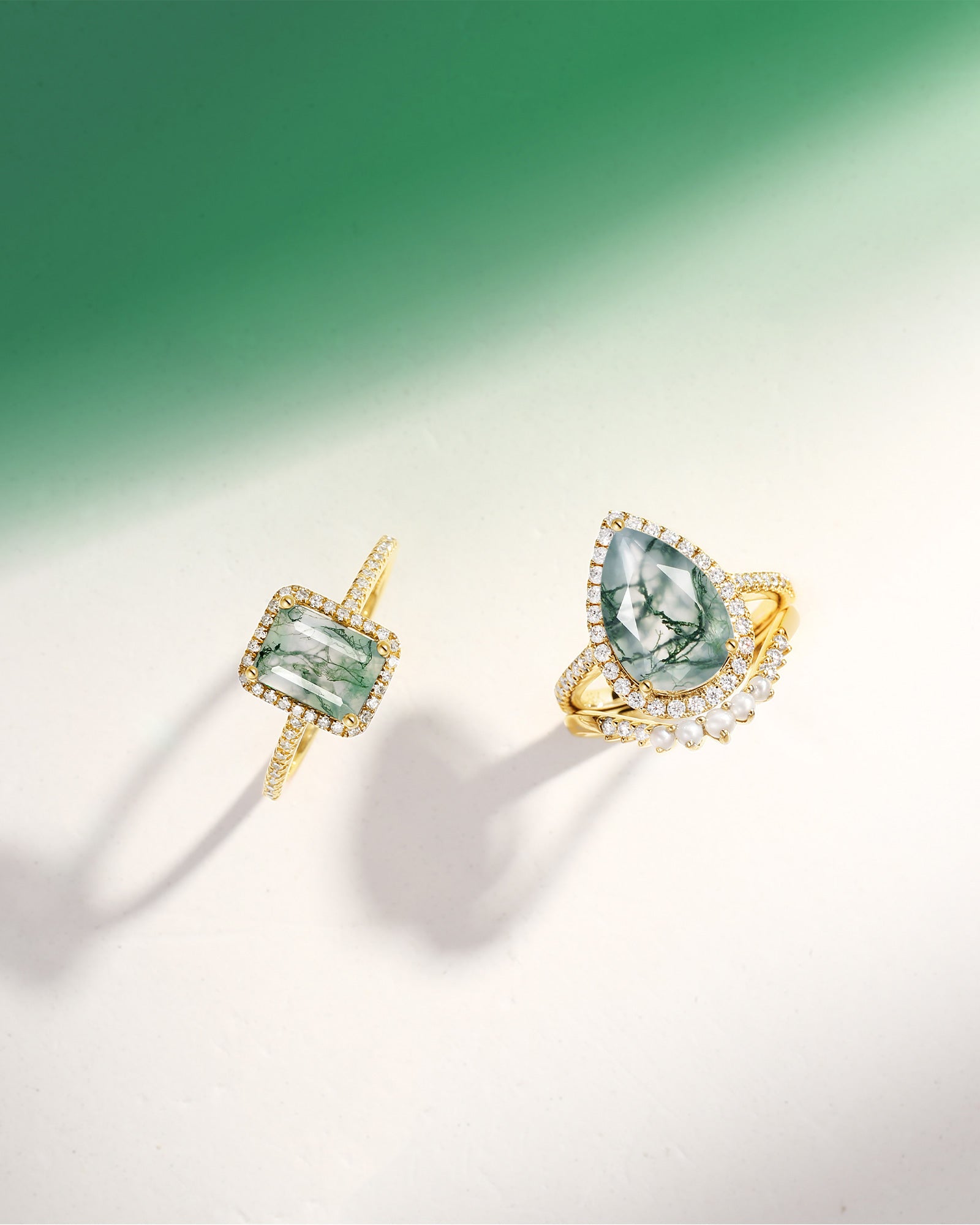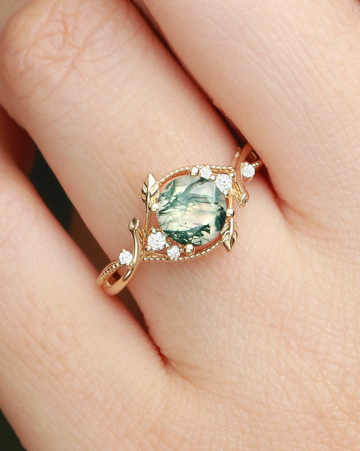 Spring green, summer transparency, autumn yellow, winter milky haze—our moss agate engagement rings fit each season’s hue. These precious chapters in these engagement rings tell your love story daily.