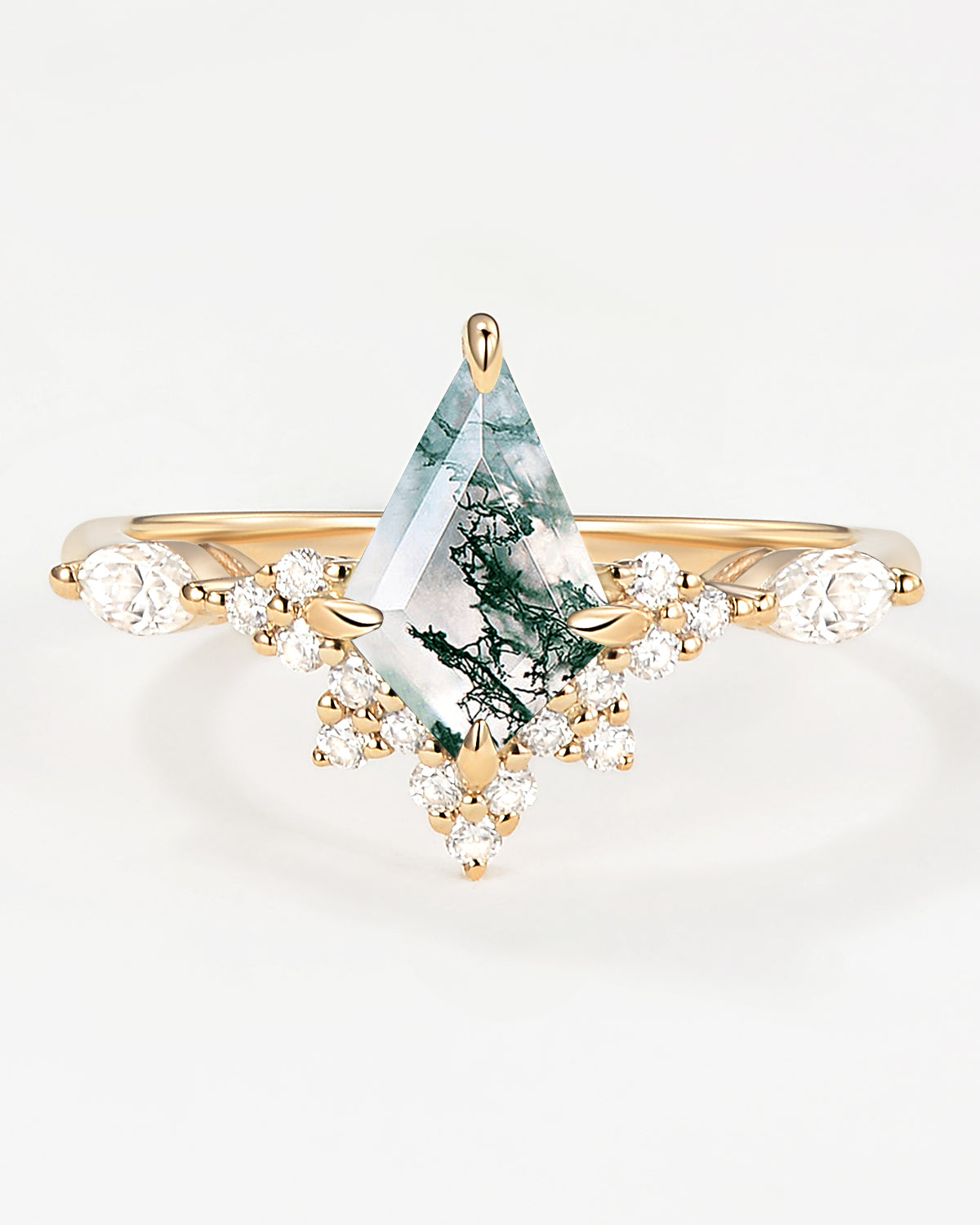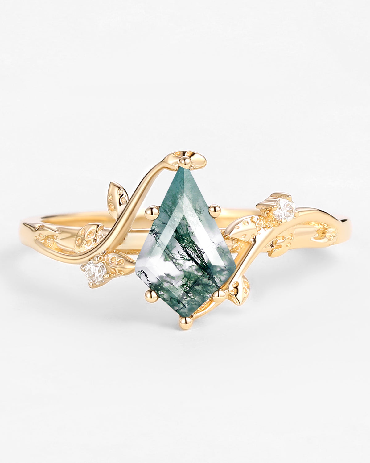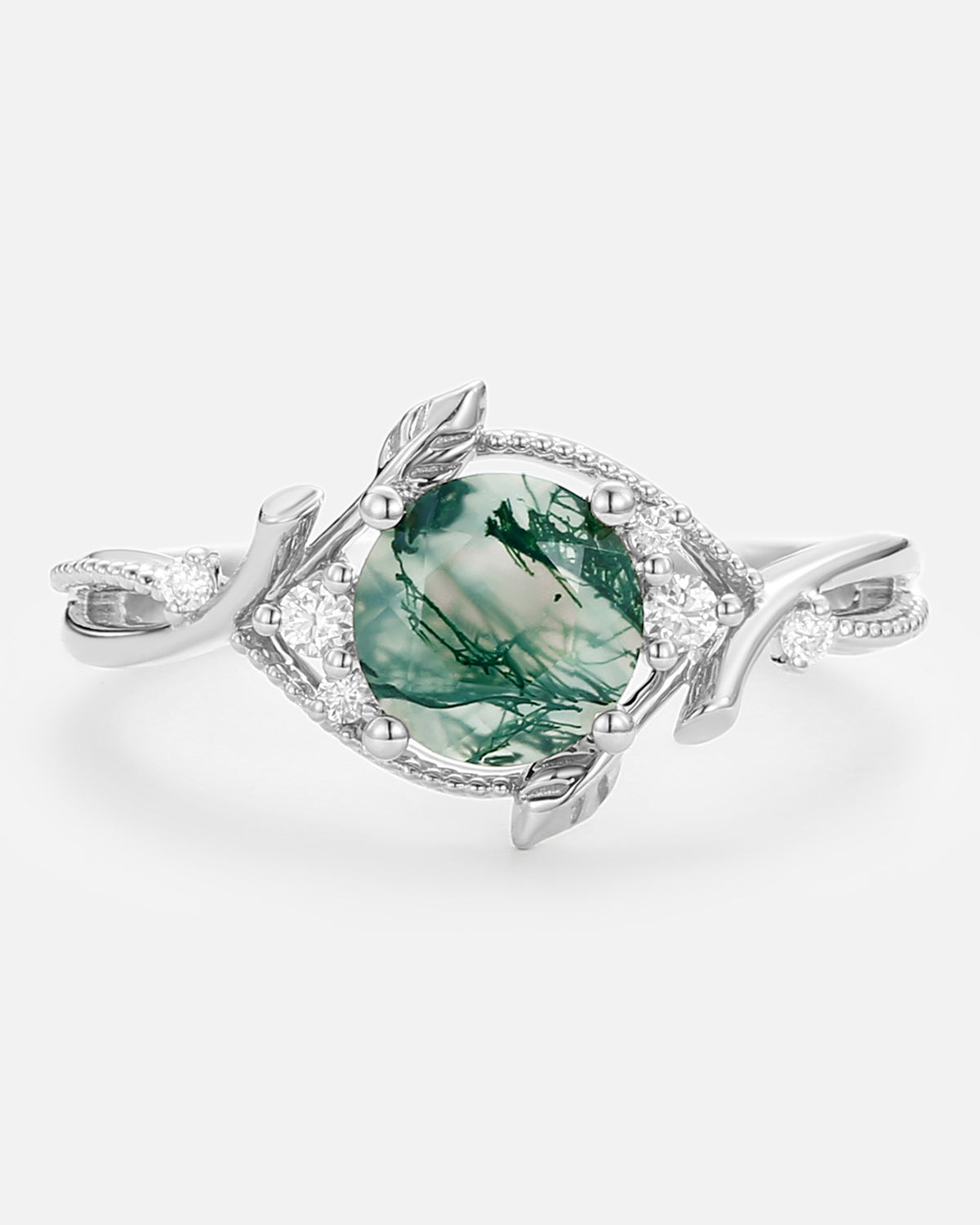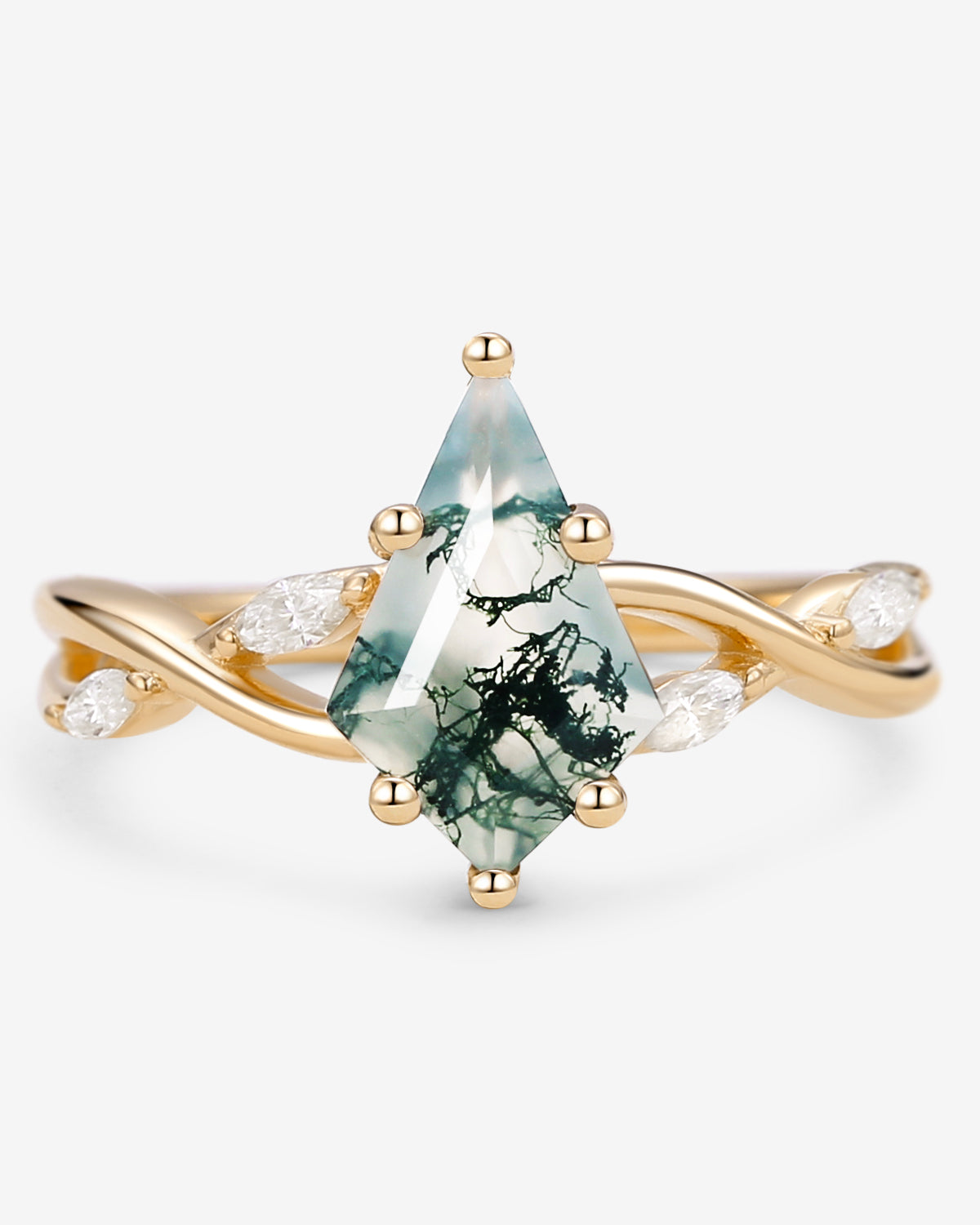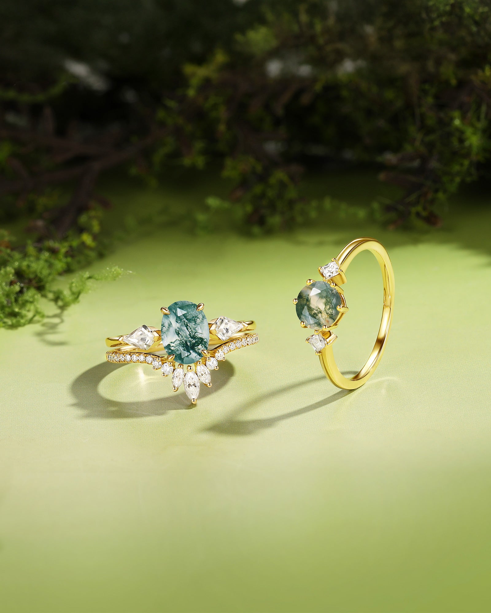 Spring green, summer transparency, autumn yellow, winter milky haze—our moss agate engagement rings fit each season’s hue. These precious chapters in these engagement rings tell your love story daily.