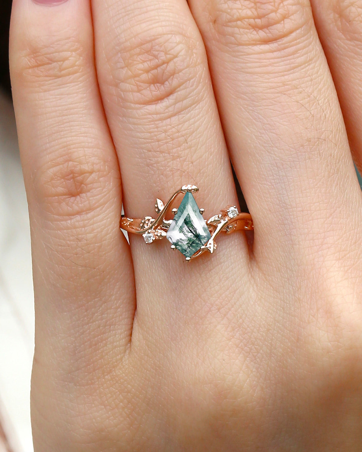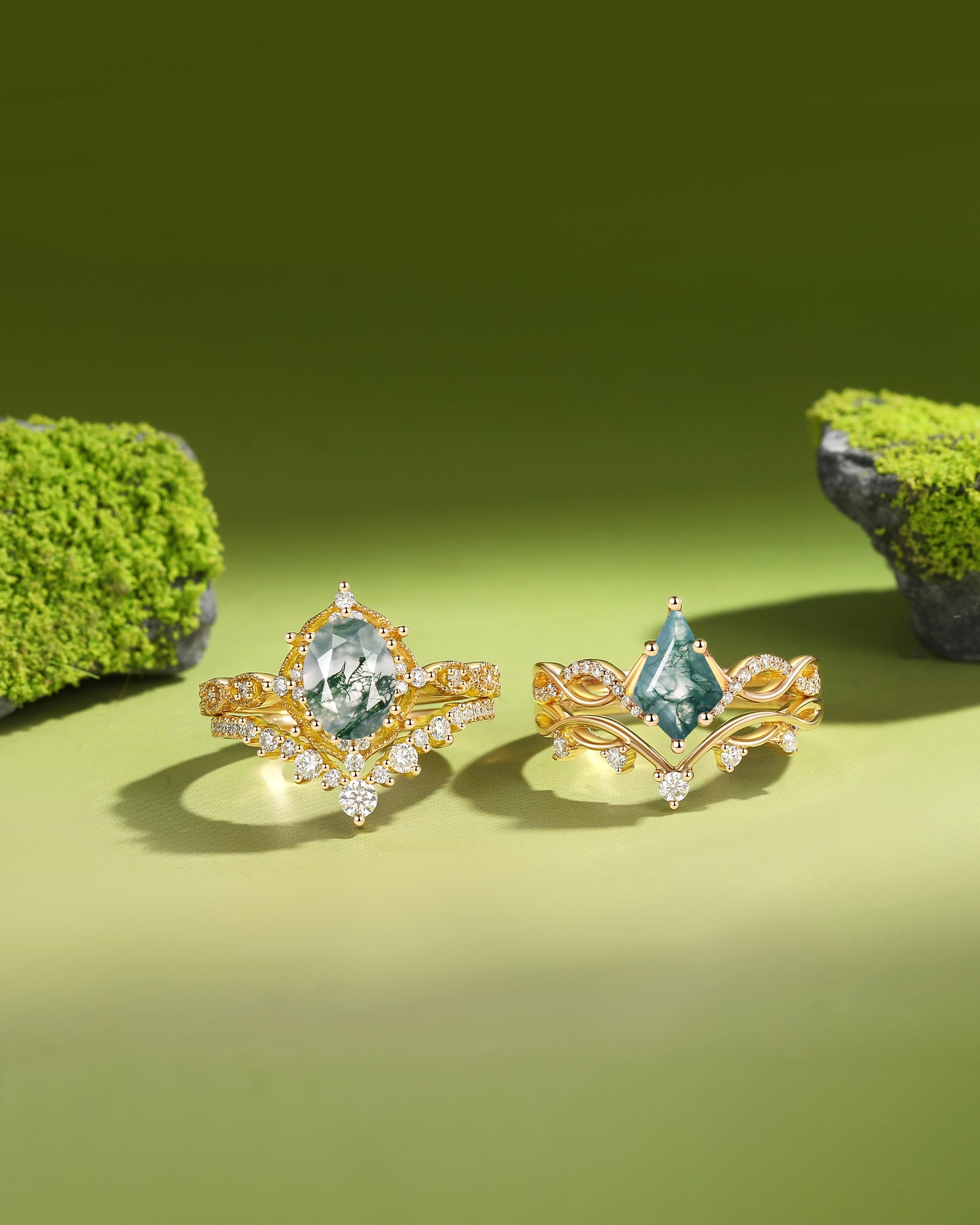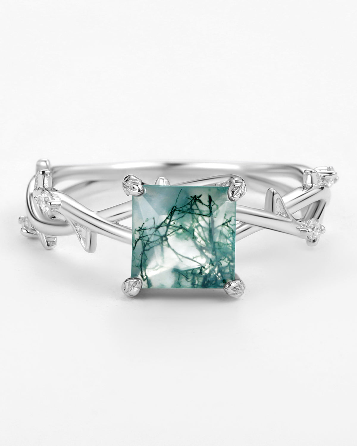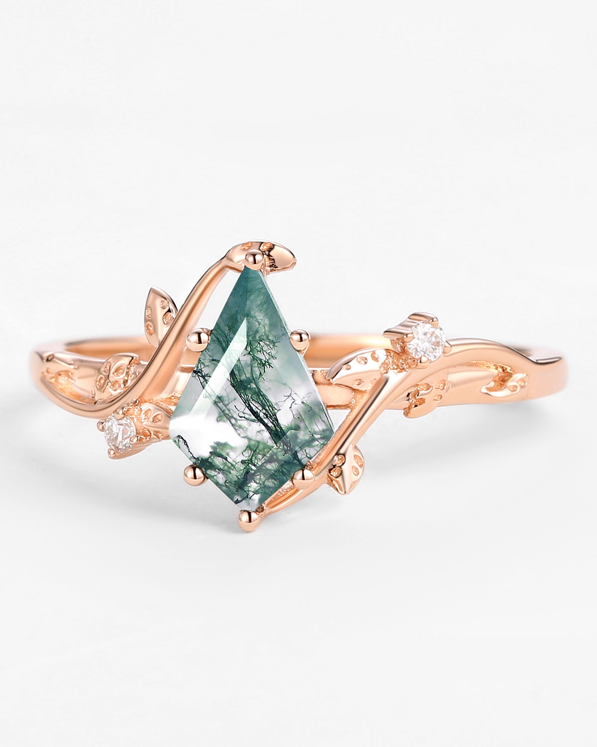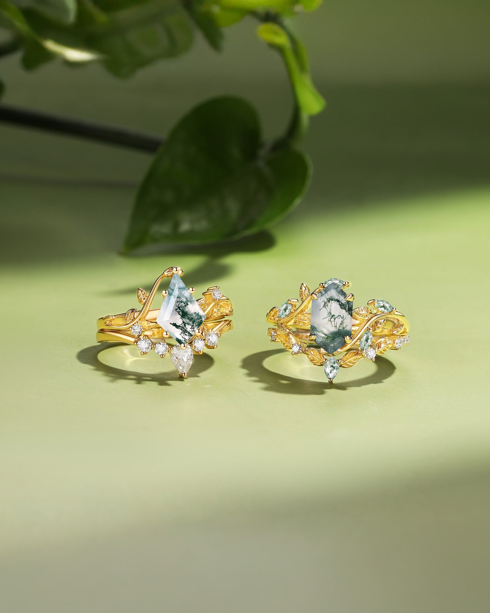 Spring green, summer transparency, autumn yellow, winter milky haze—our moss agate engagement rings fit each season’s hue. These precious chapters in these engagement rings tell your love story daily.