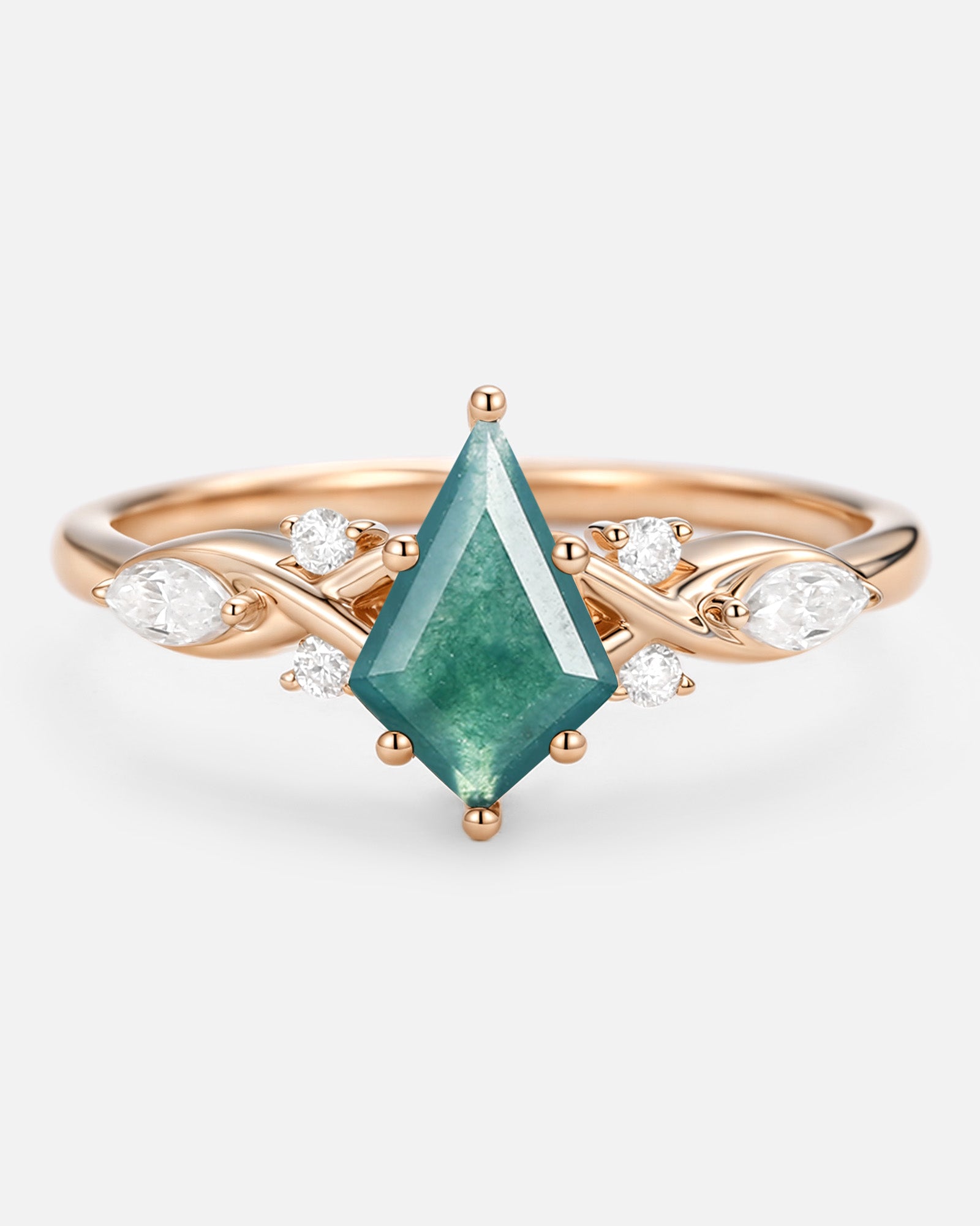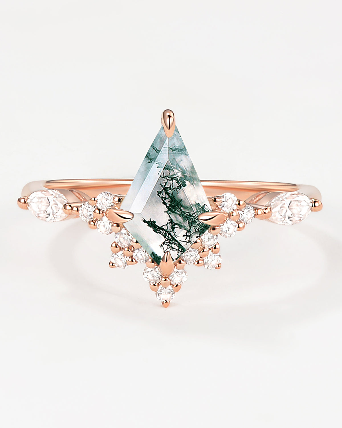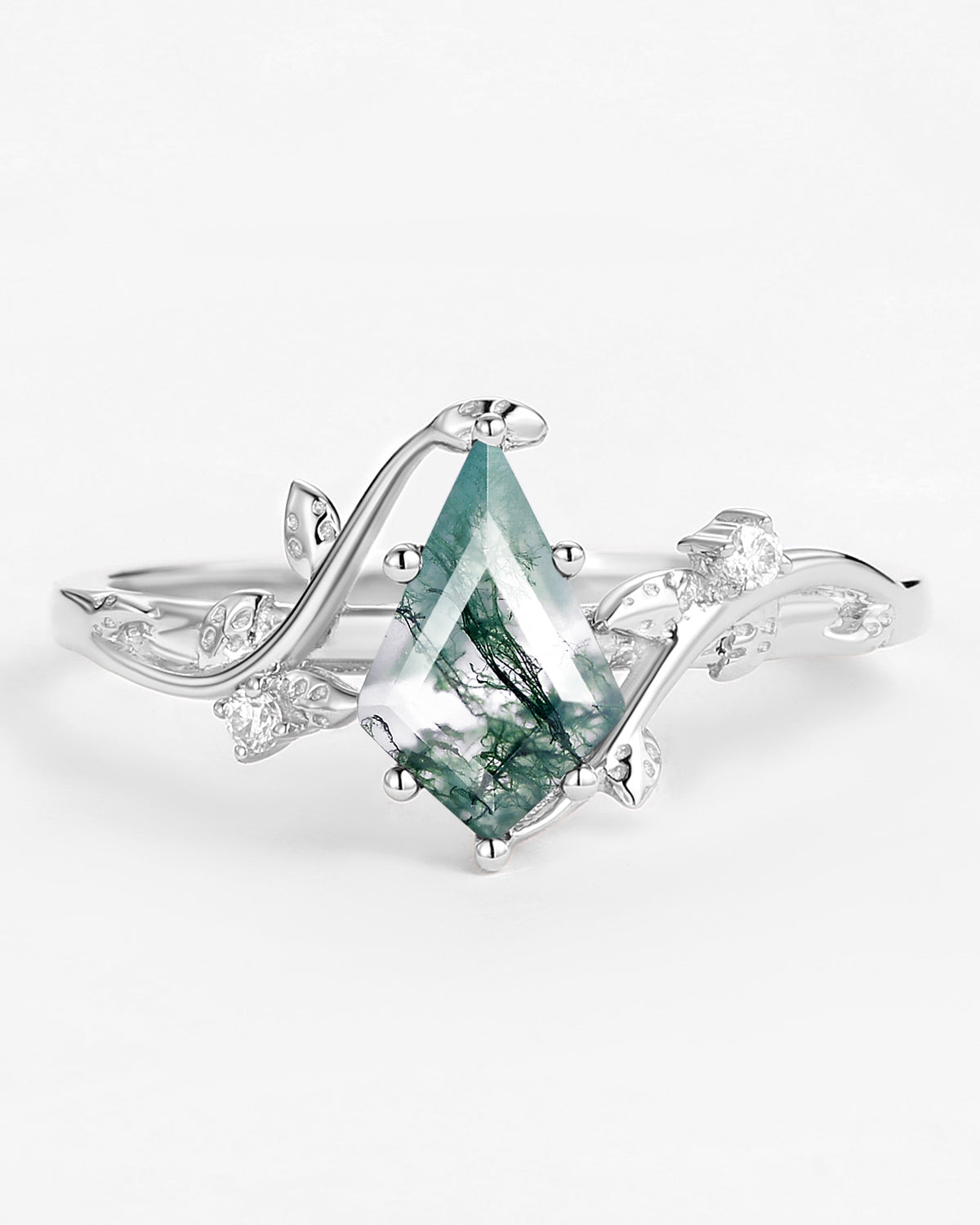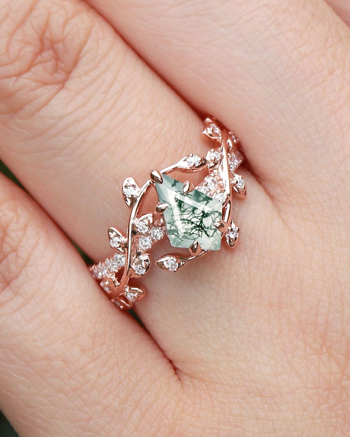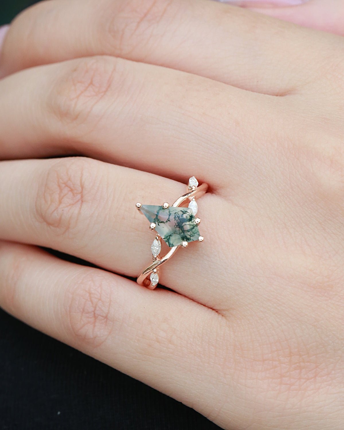 Spring green, summer transparency, autumn yellow, winter milky haze—our moss agate engagement rings fit each season’s hue. These precious chapters in these engagement rings tell your love story daily.