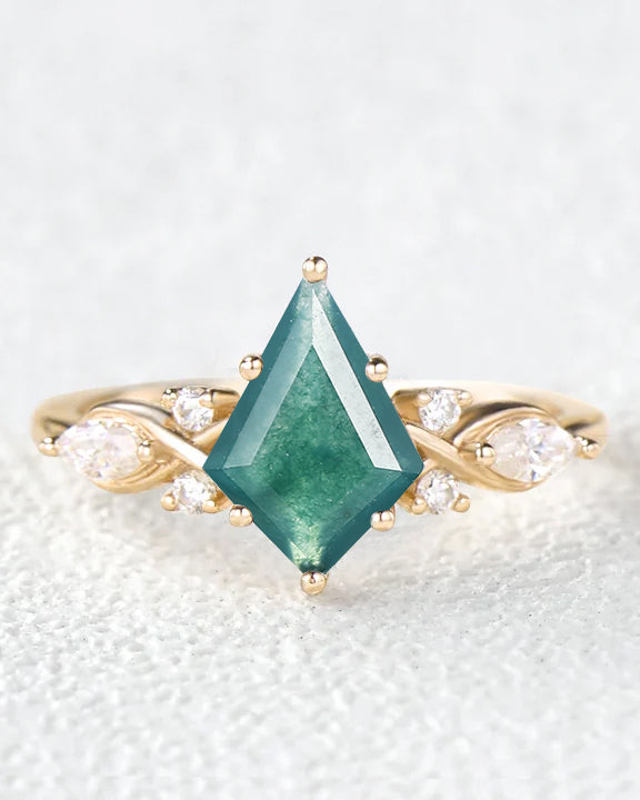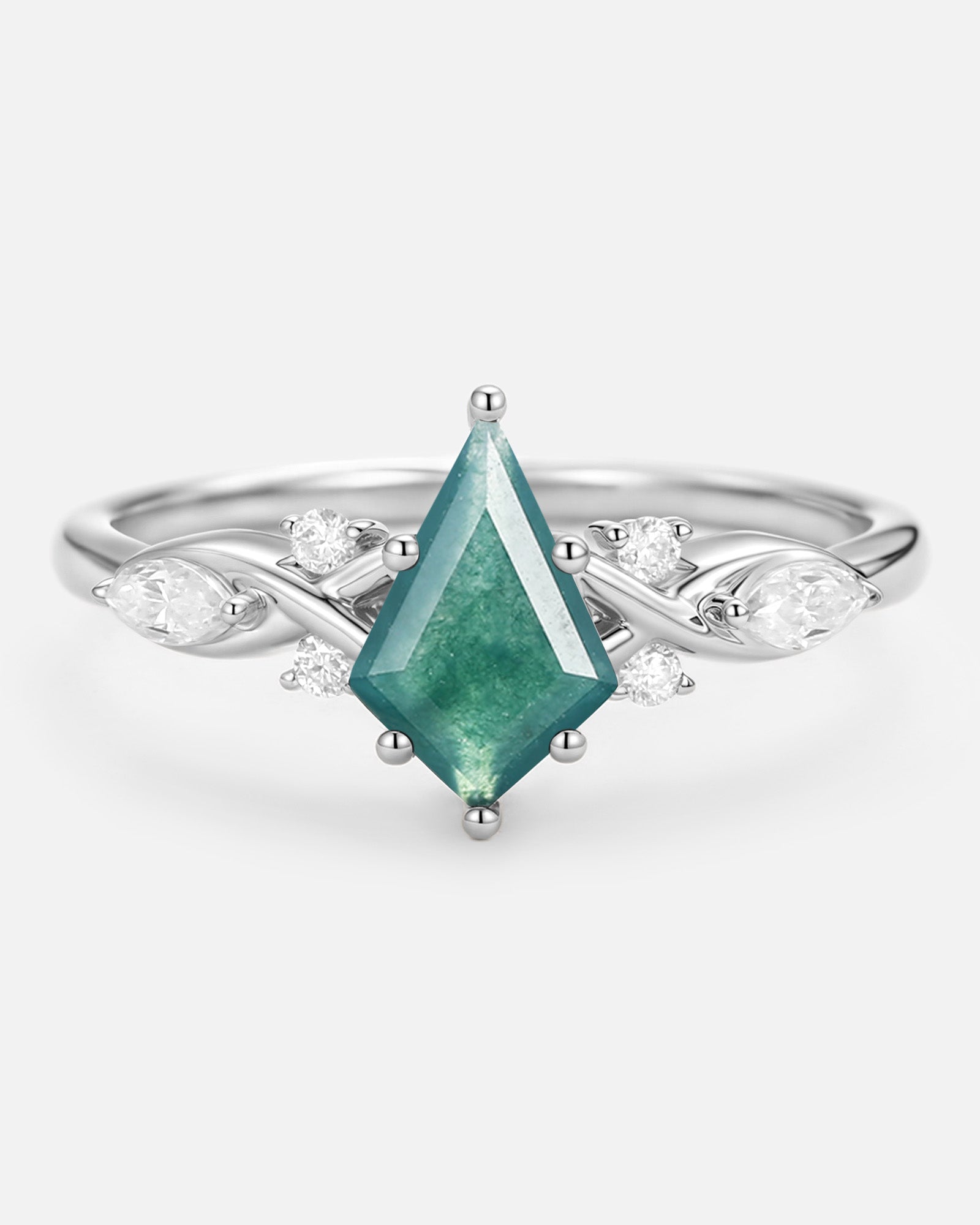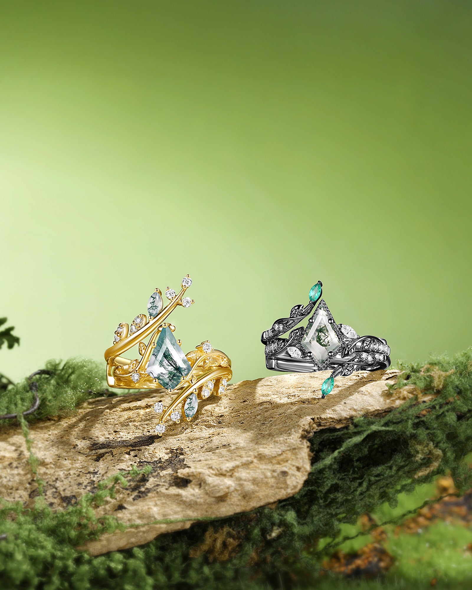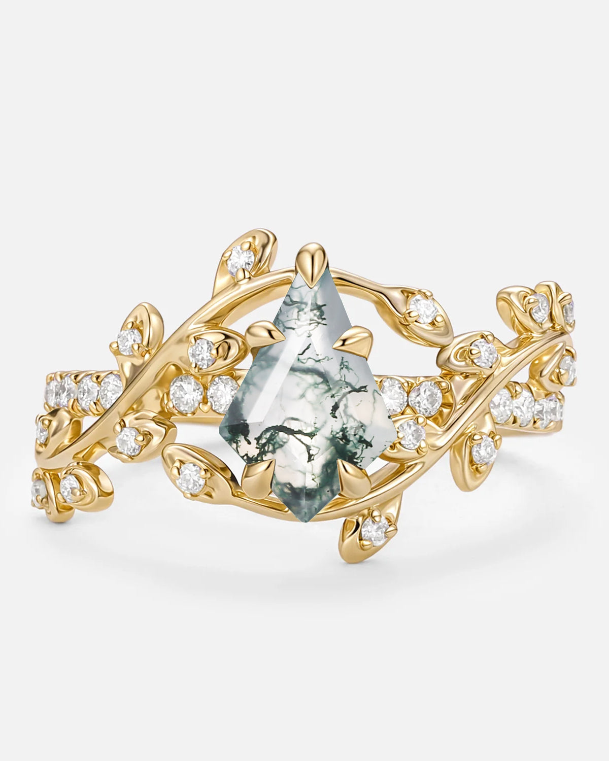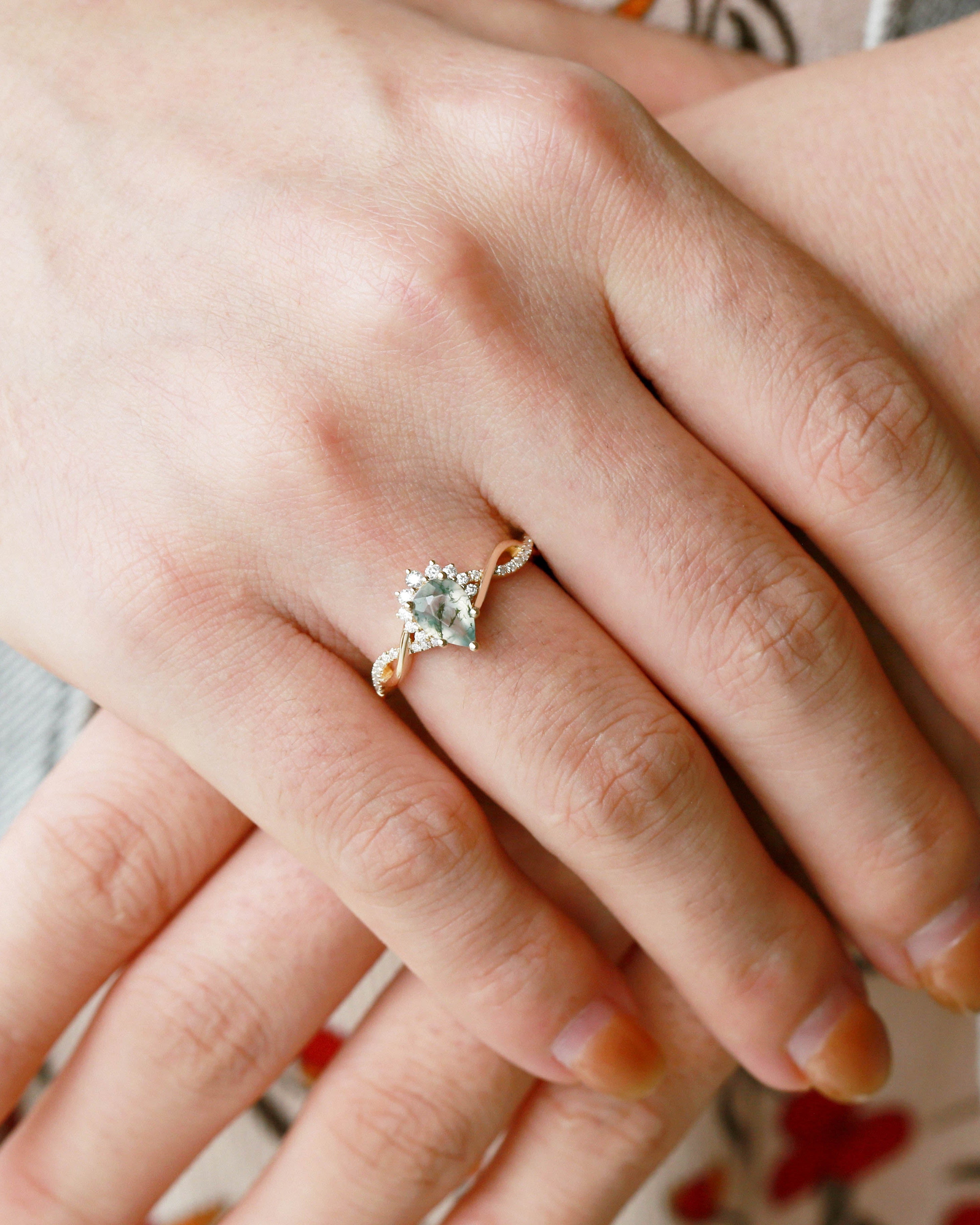 Spring green, summer transparency, autumn yellow, winter milky haze—our moss agate engagement rings fit each season’s hue. These precious chapters in these engagement rings tell your love story daily.