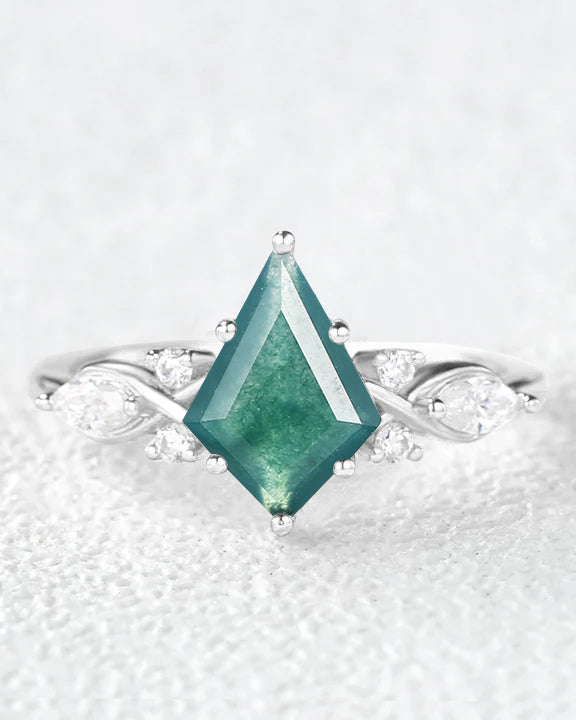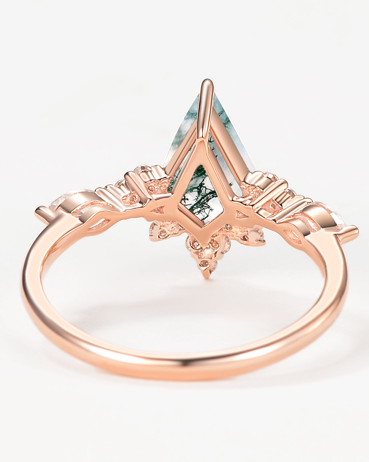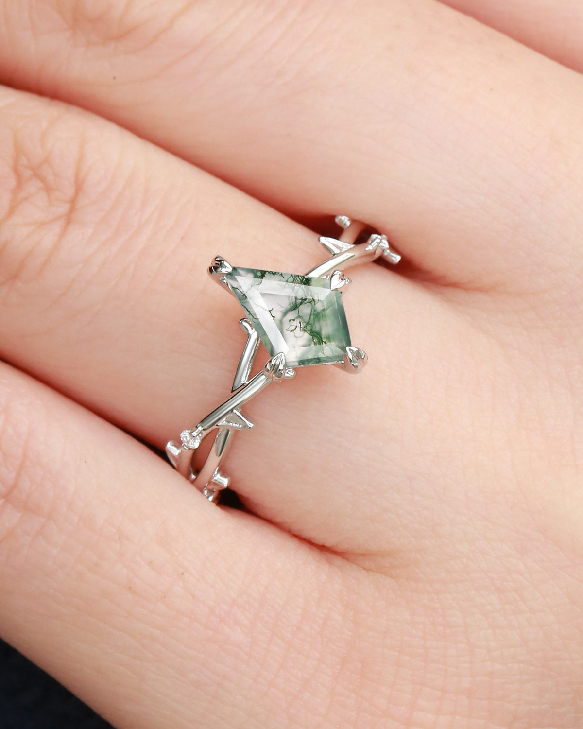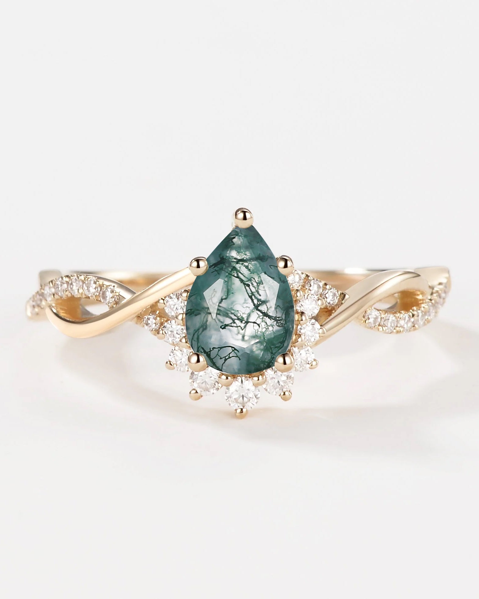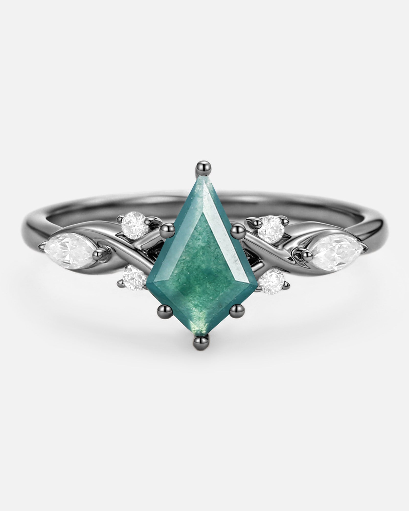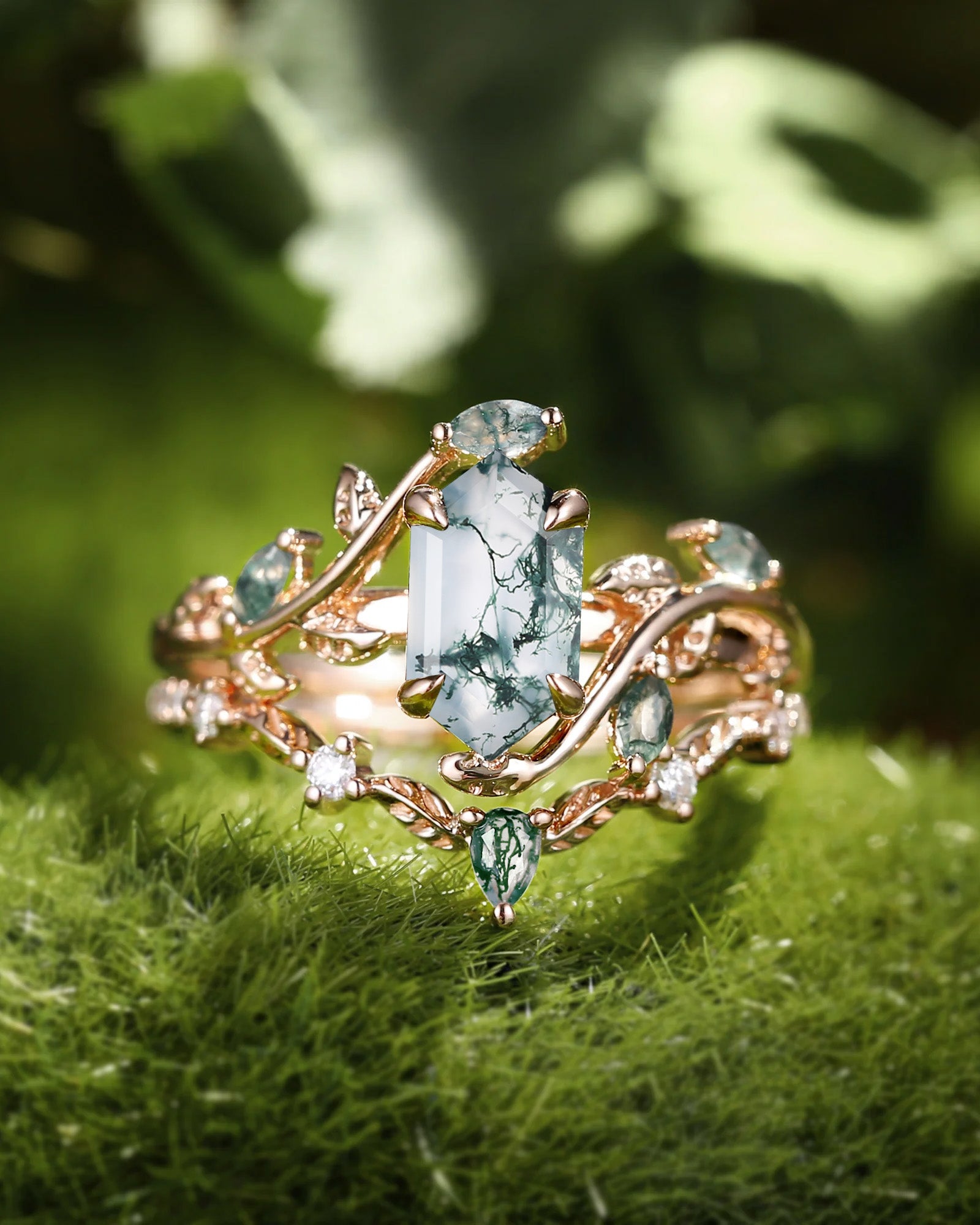 Spring green, summer transparency, autumn yellow, winter milky haze—our moss agate engagement rings fit each season’s hue. These precious chapters in these engagement rings tell your love story daily.