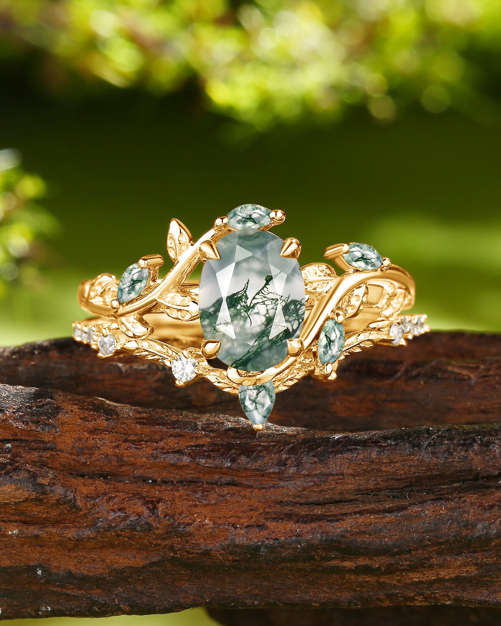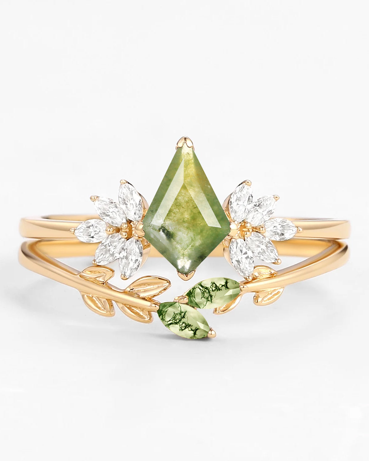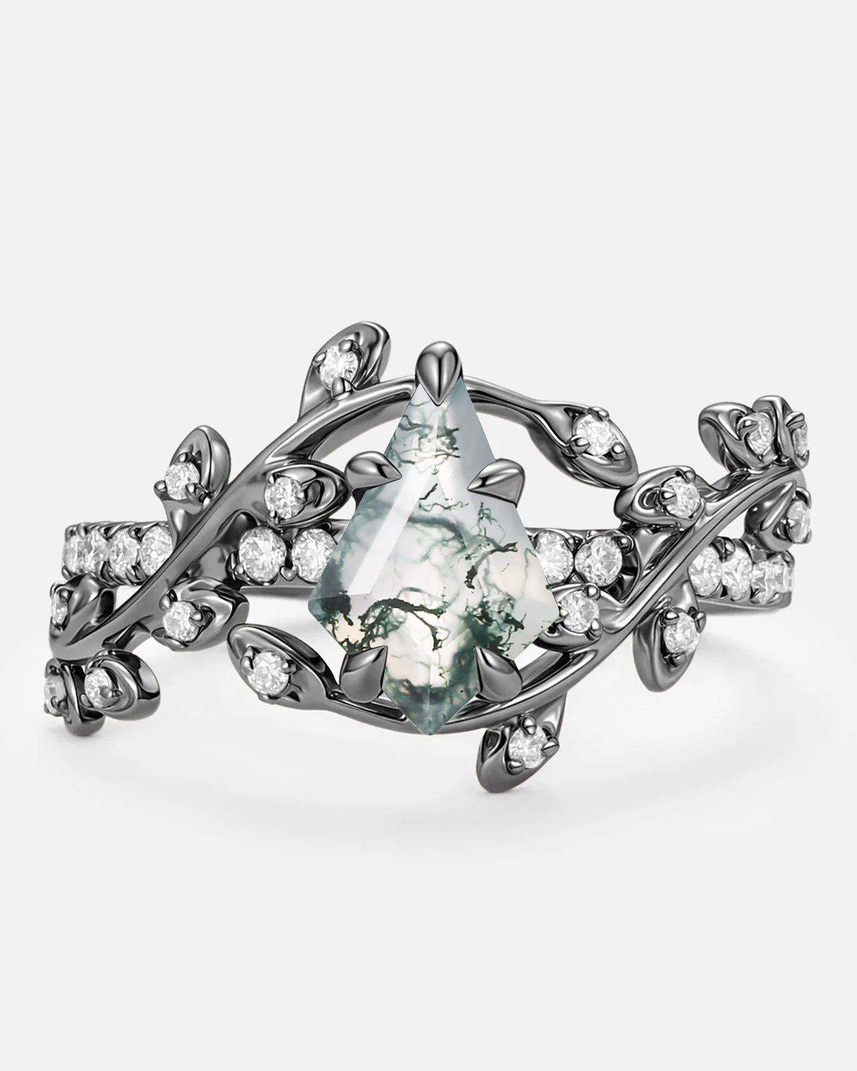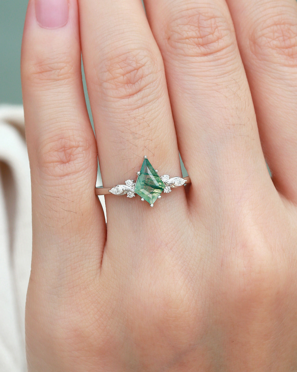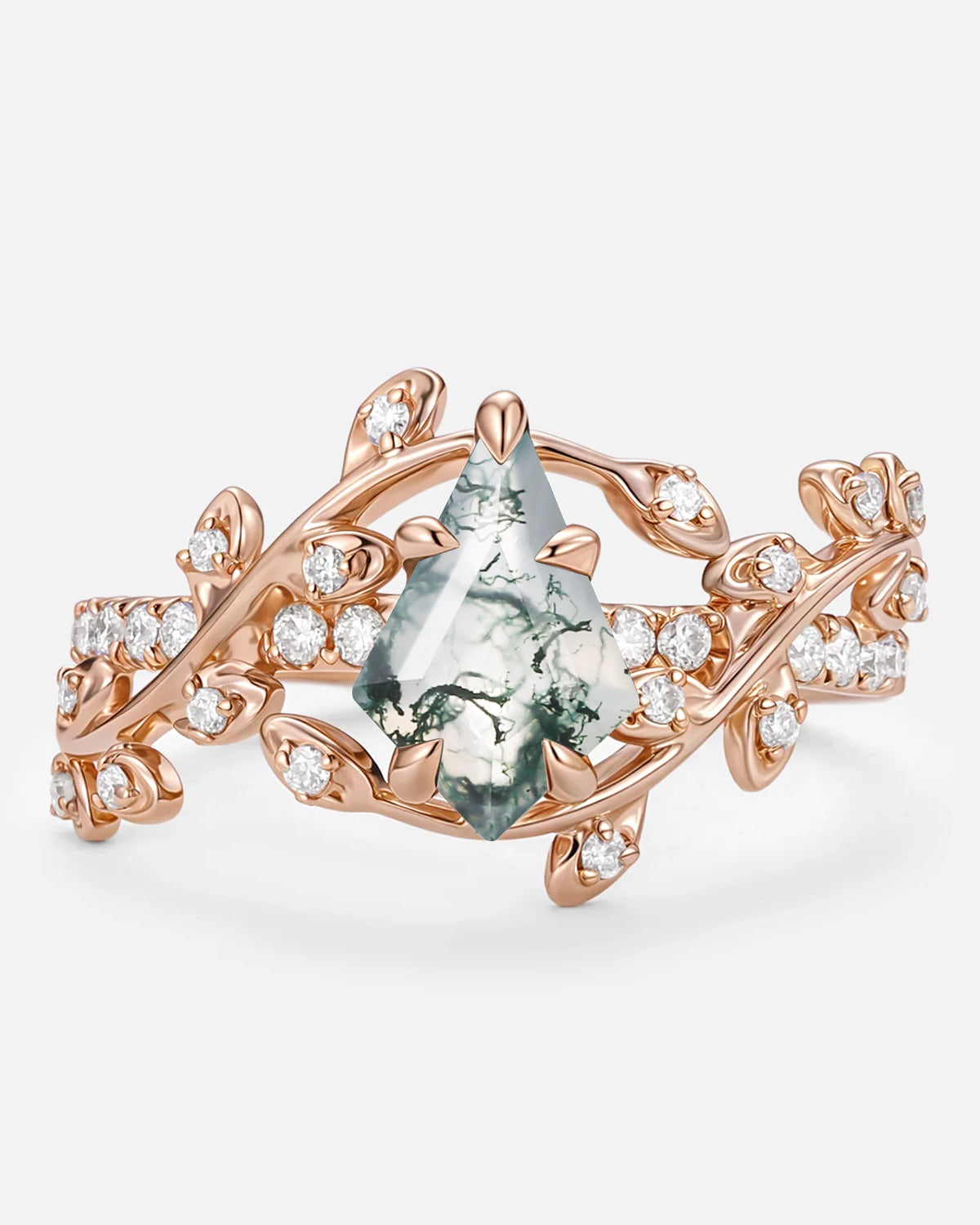 Spring green, summer transparency, autumn yellow, winter milky haze—our moss agate engagement rings fit each season’s hue. These precious chapters in these engagement rings tell your love story daily.