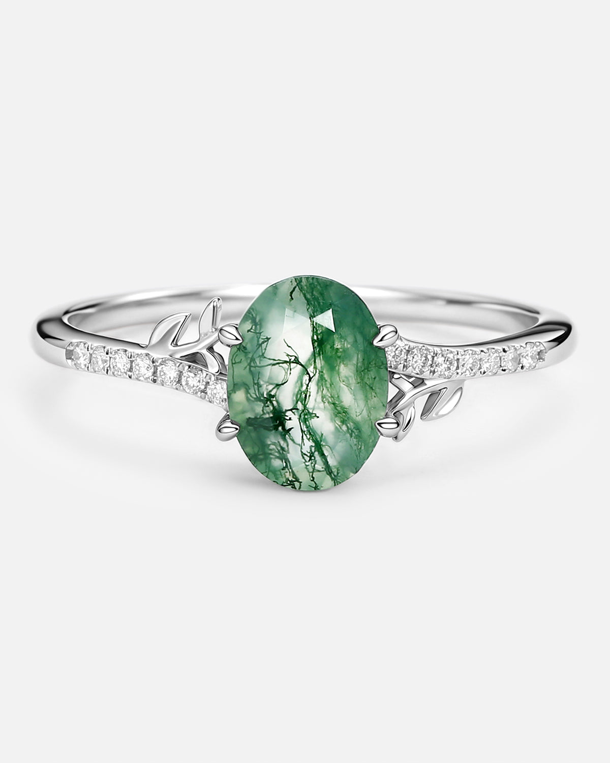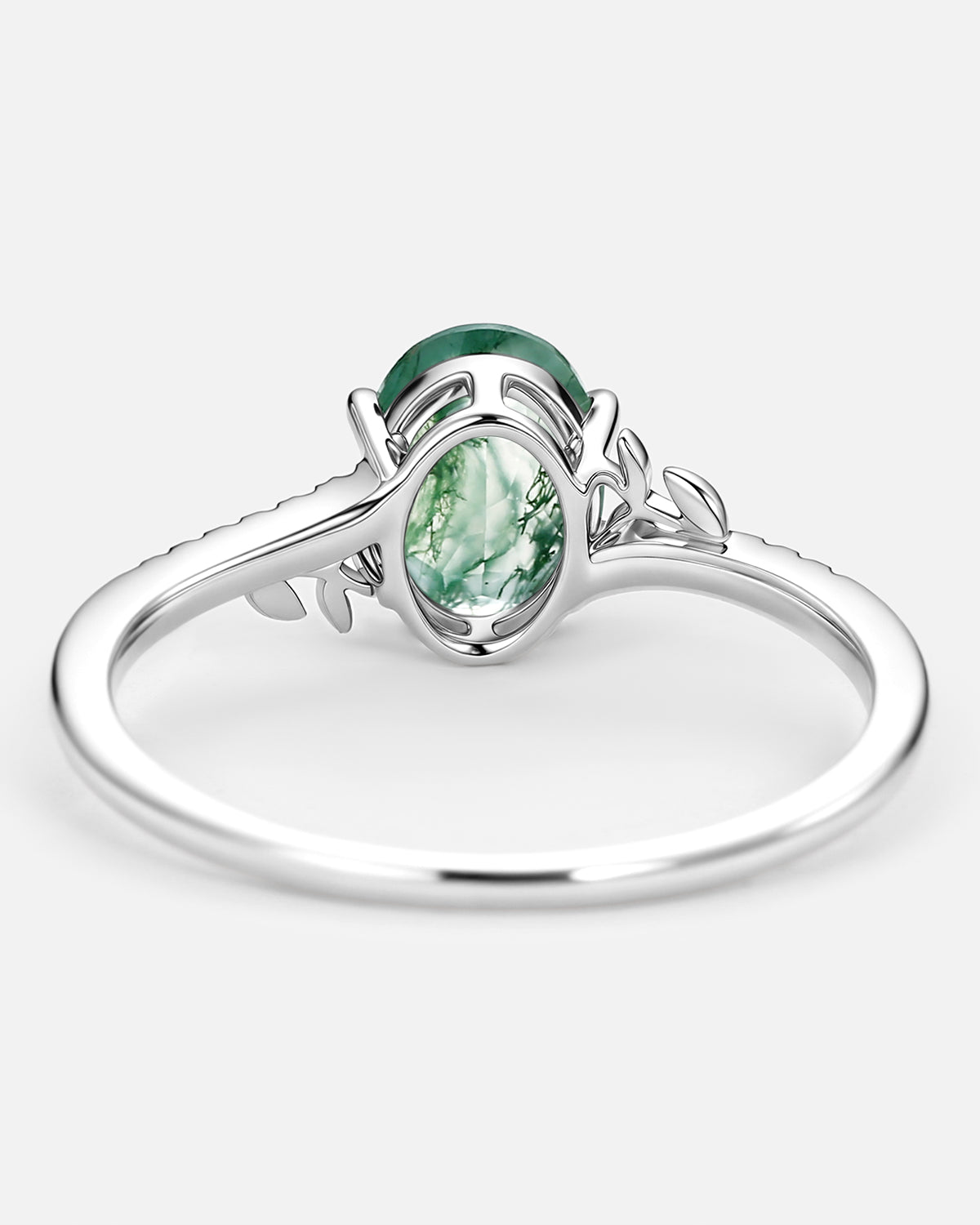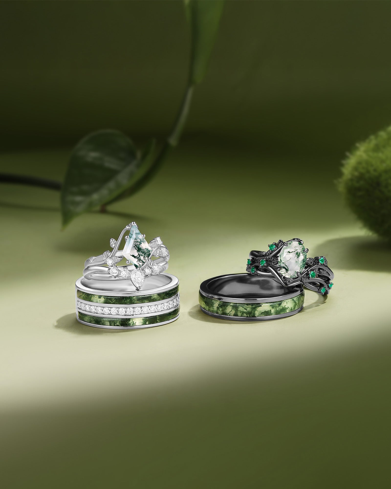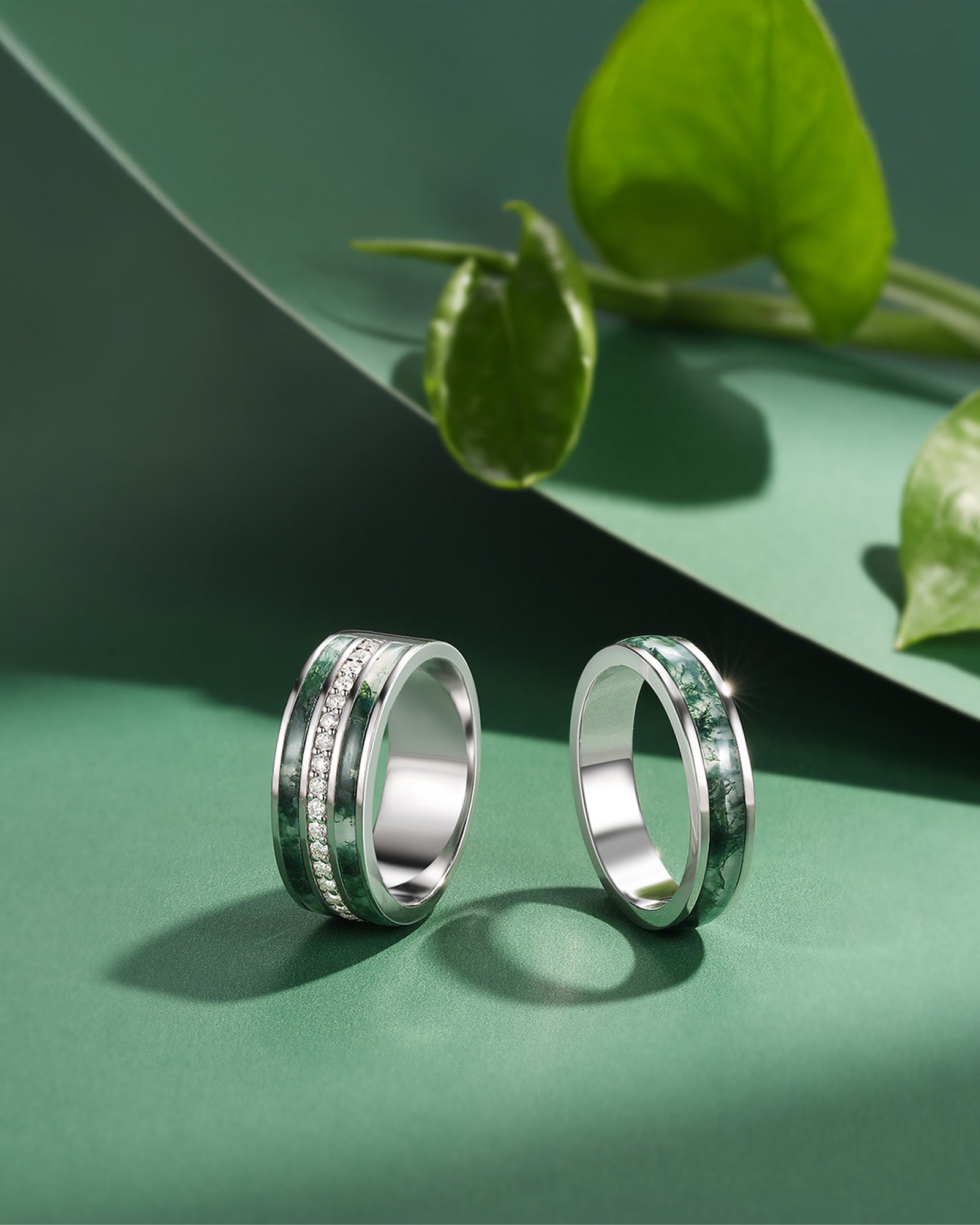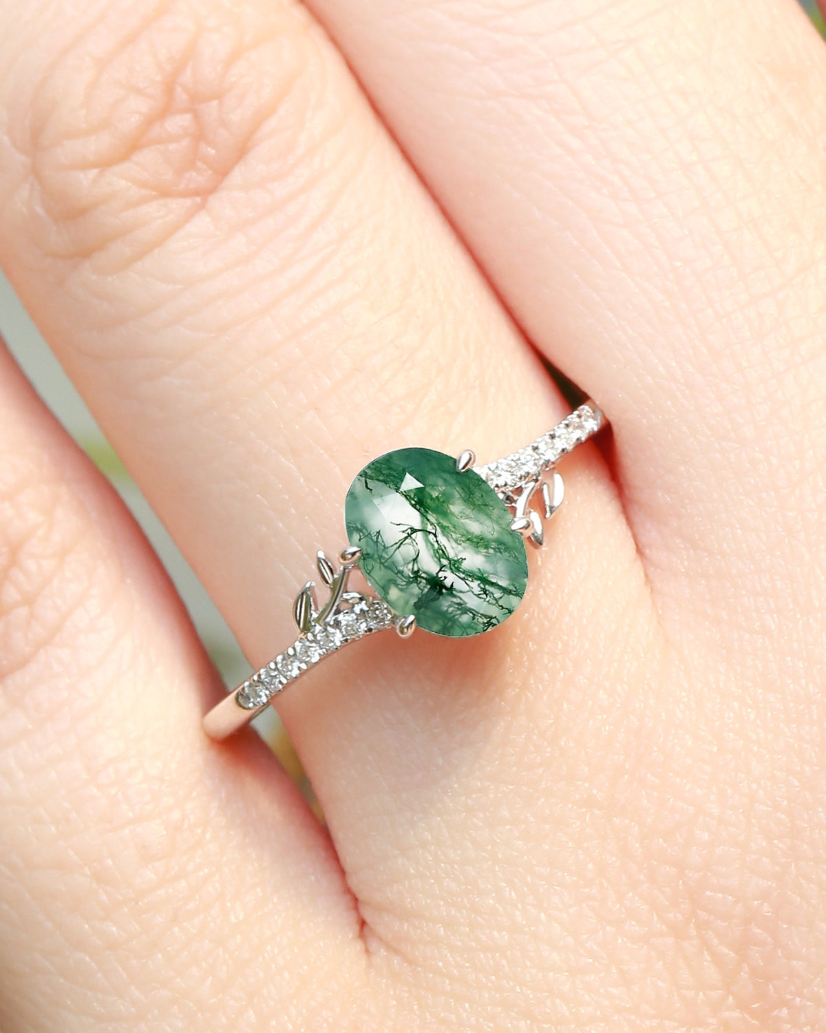 Grassy green moss glows like spring’s rain-kissed new leaves, carrying the vitality of budding blooms; vitality wraps around the finger as it rests on yours, a sweet echo of spring’s fresh energy in your love.