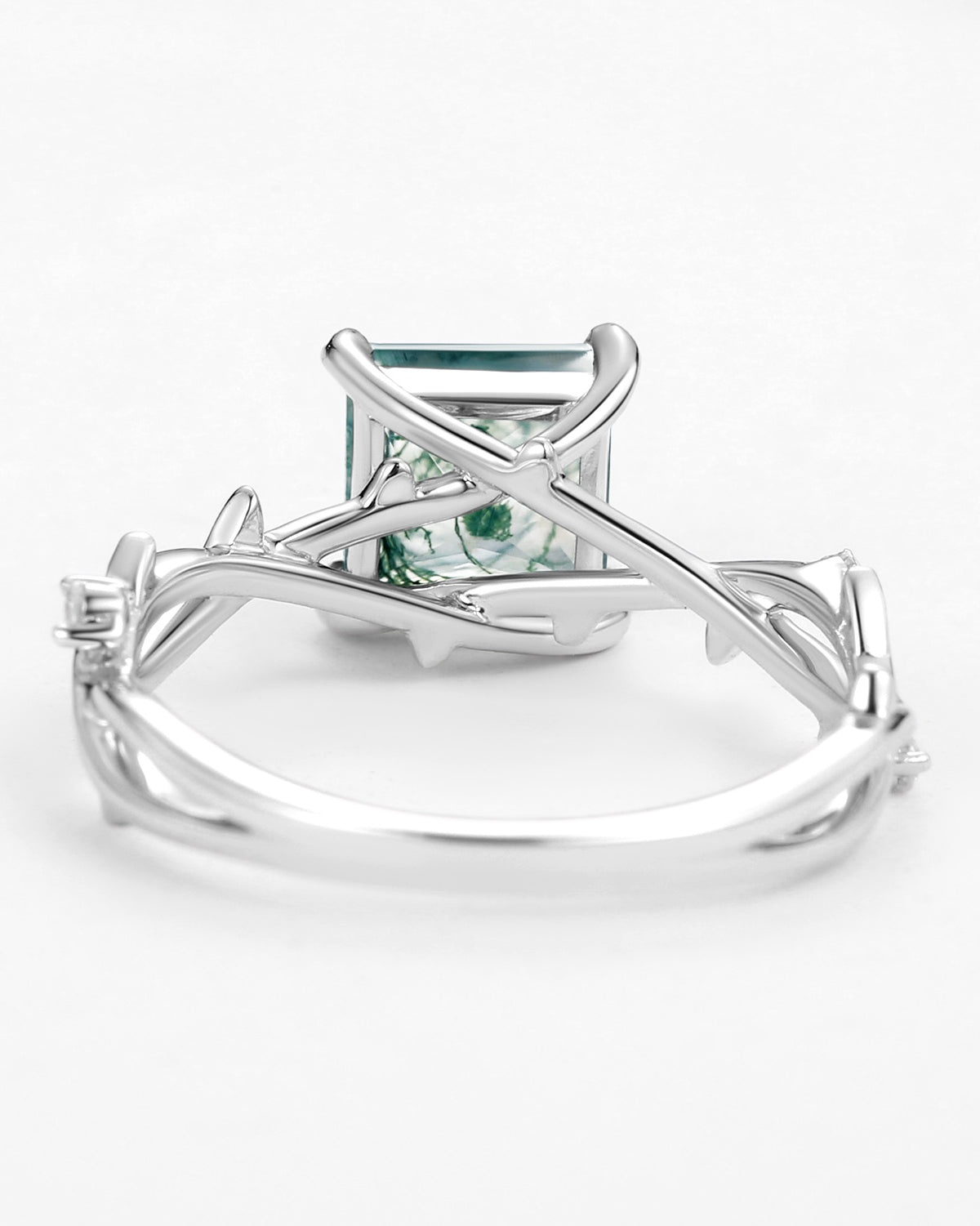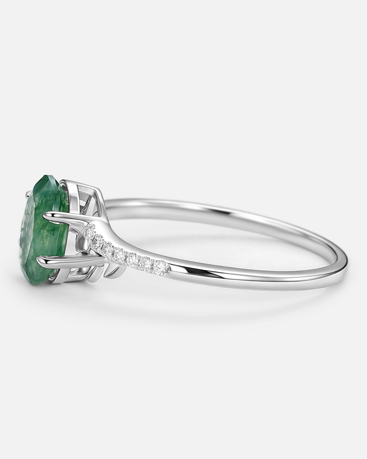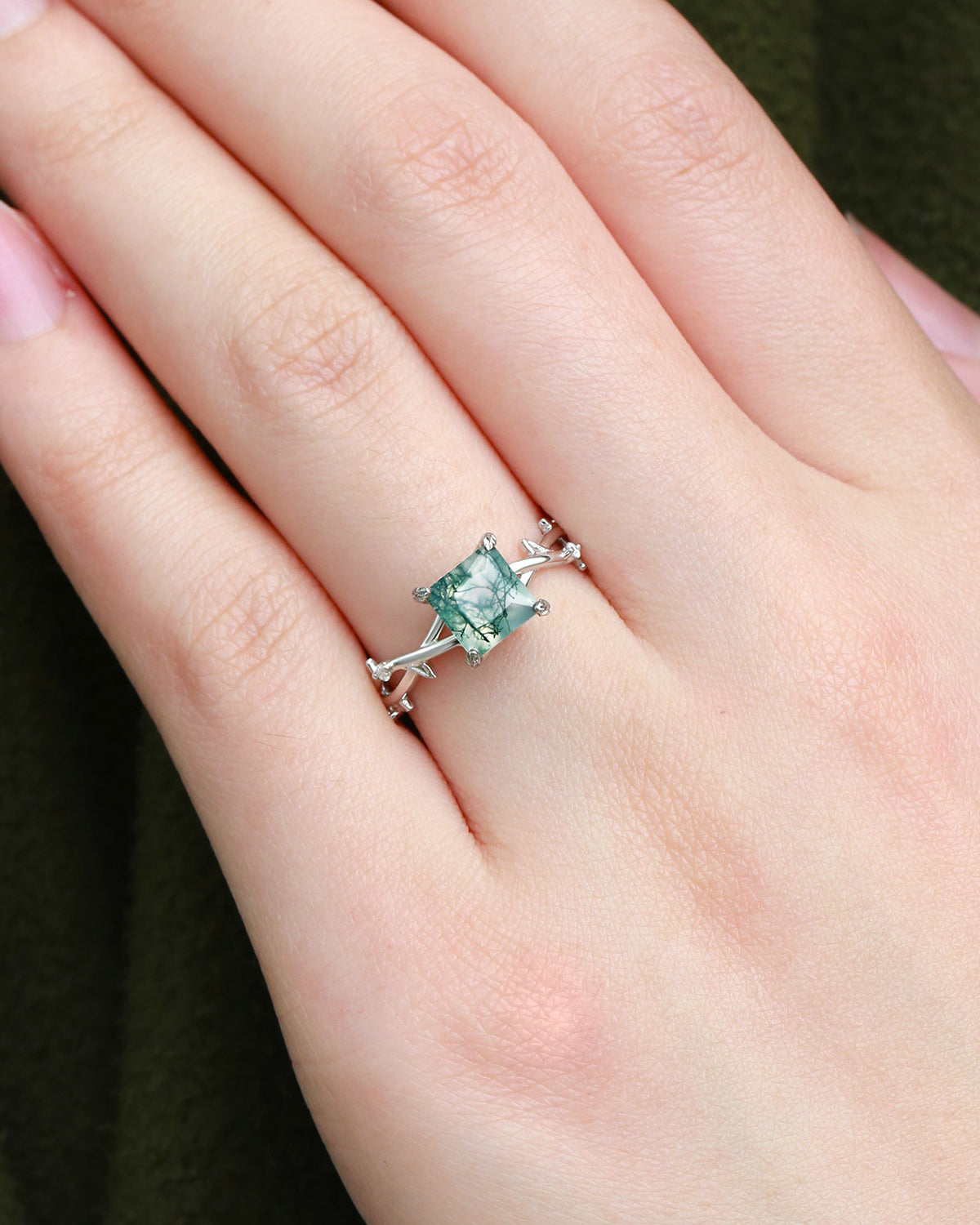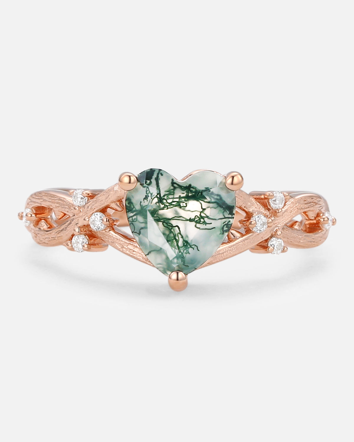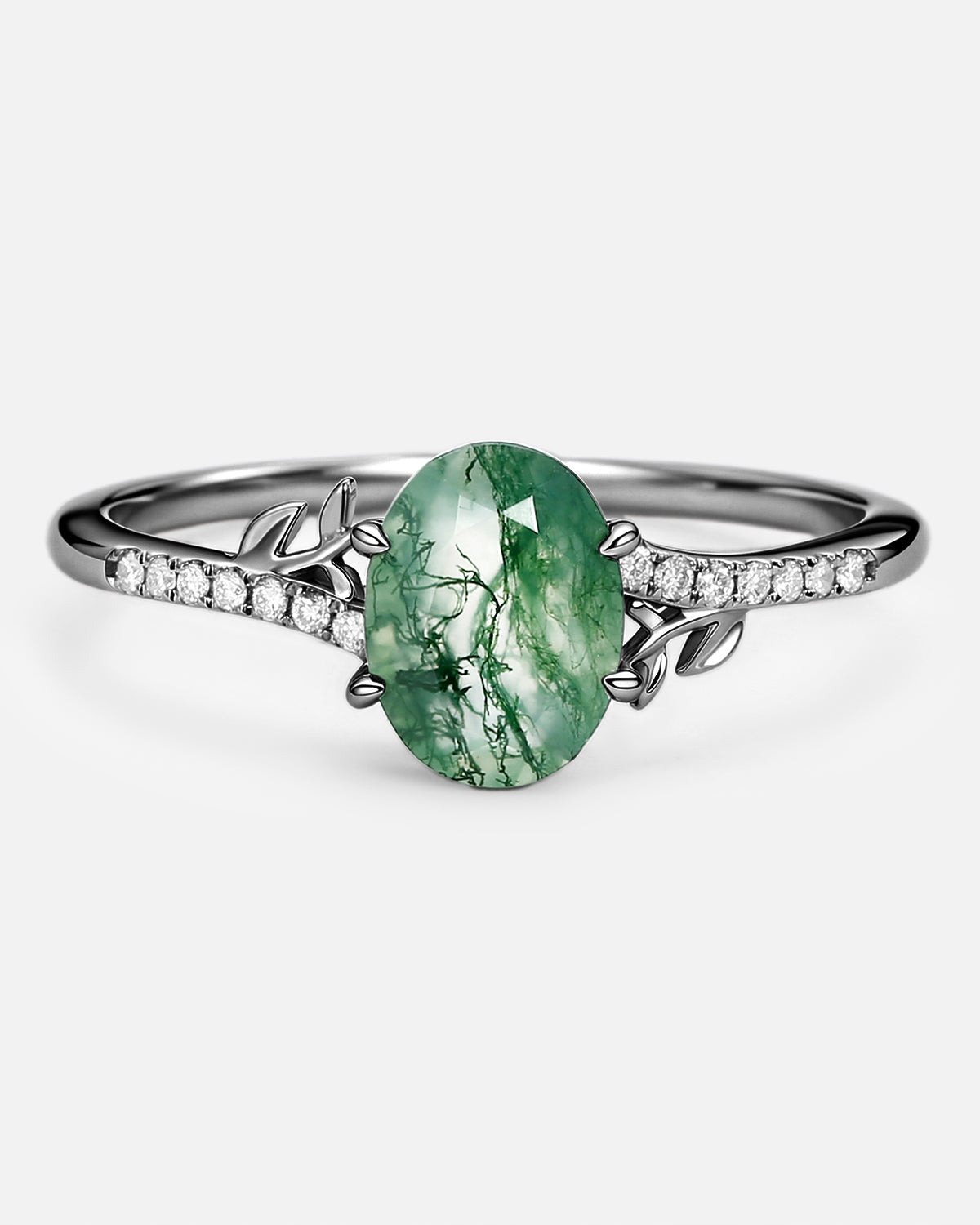 Grassy green moss glows like spring’s rain-kissed new leaves, carrying the vitality of budding blooms; vitality wraps around the finger as it rests on yours, a sweet echo of spring’s fresh energy in your love.