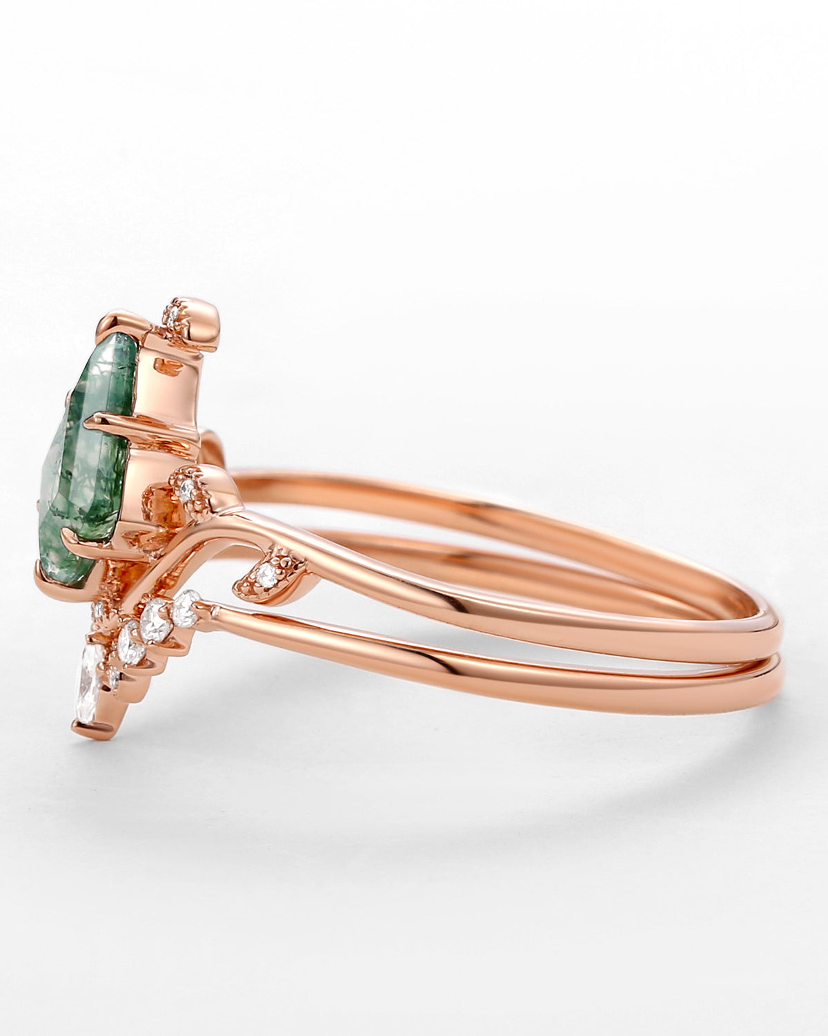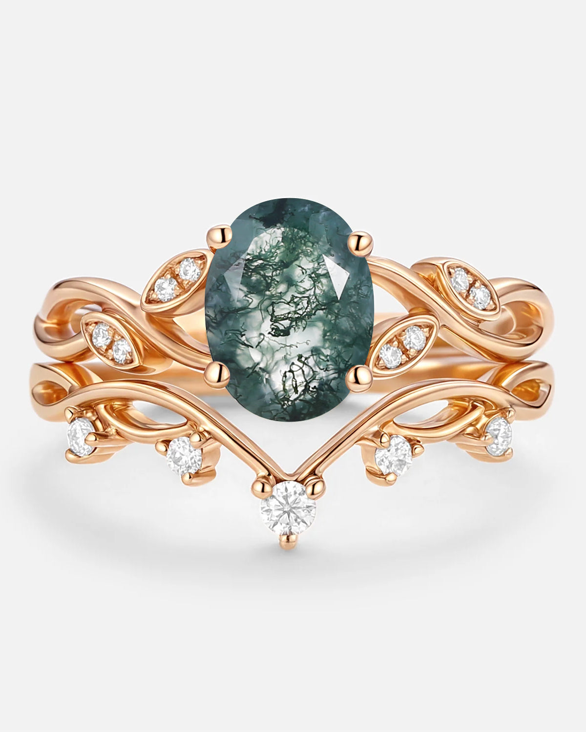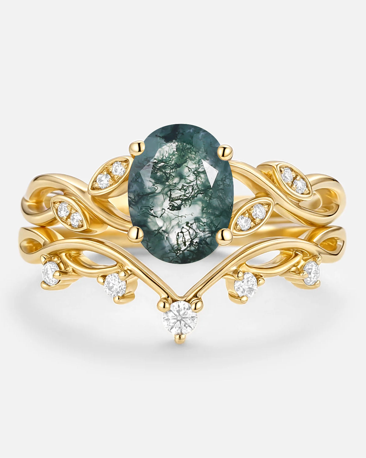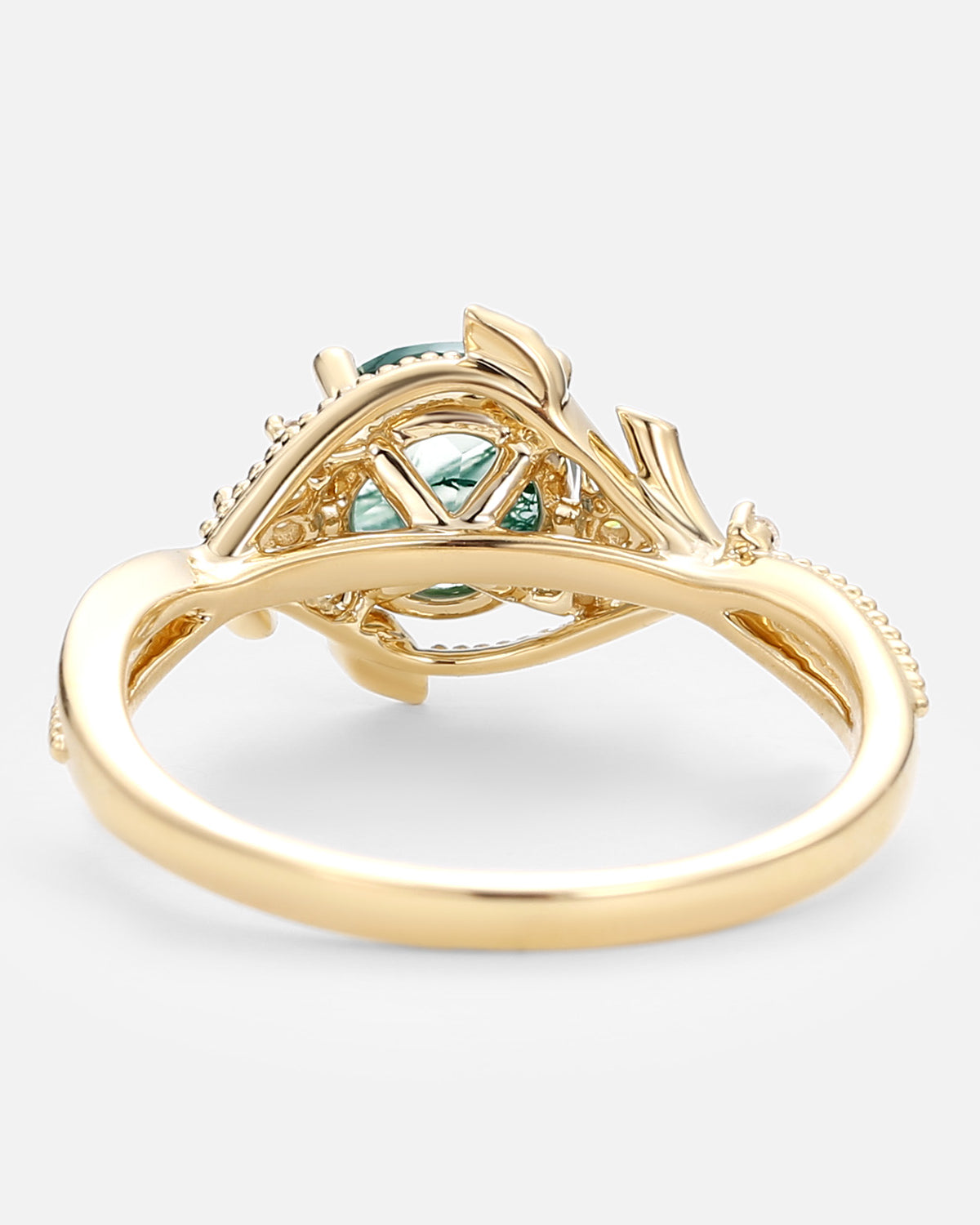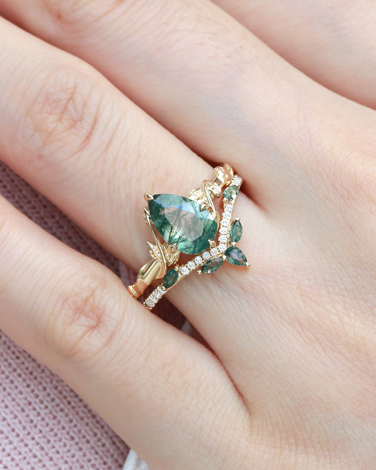 Grassy green moss glows like spring’s rain-kissed new leaves, carrying the vitality of budding blooms; vitality wraps around the finger as it rests on yours, a sweet echo of spring’s fresh energy in your love.