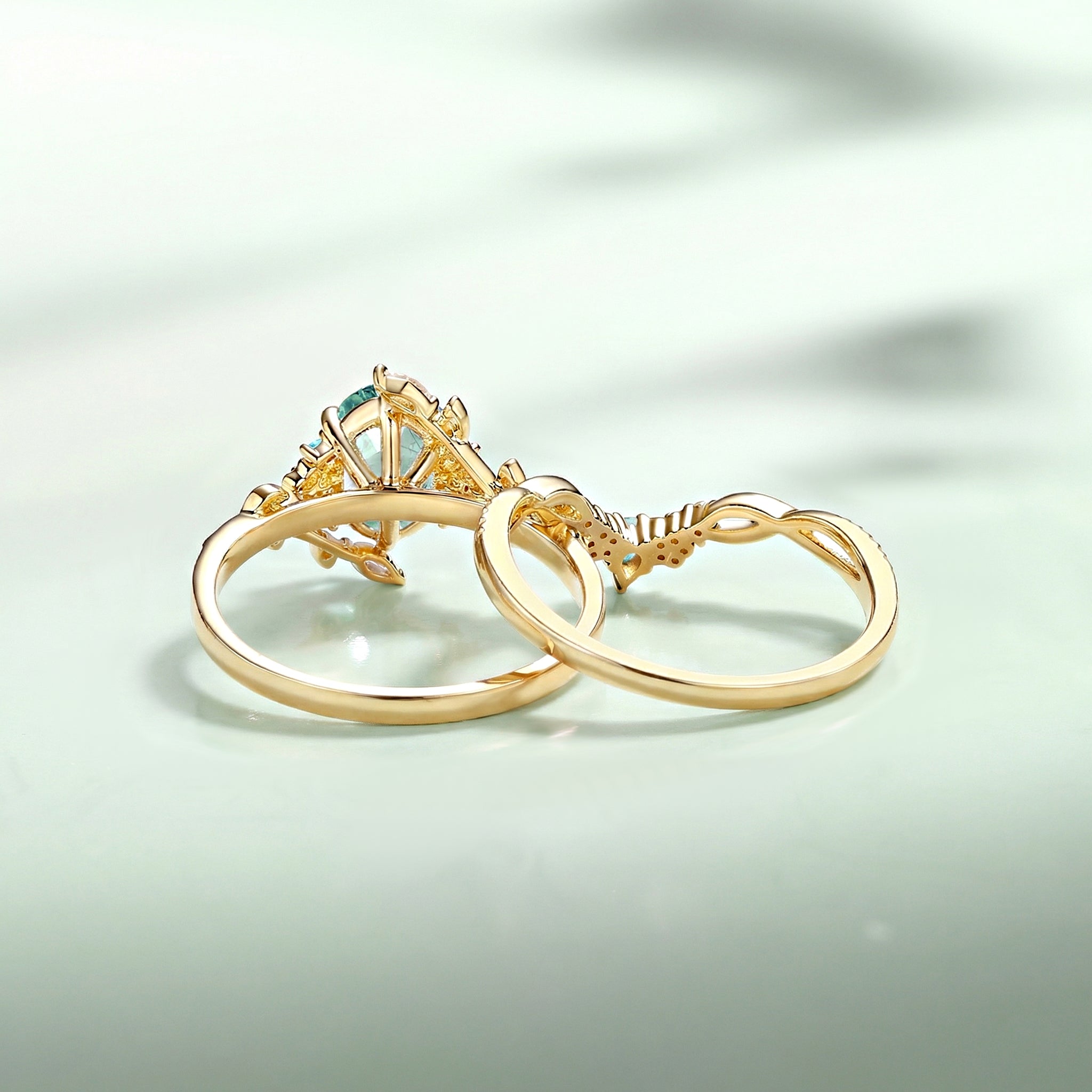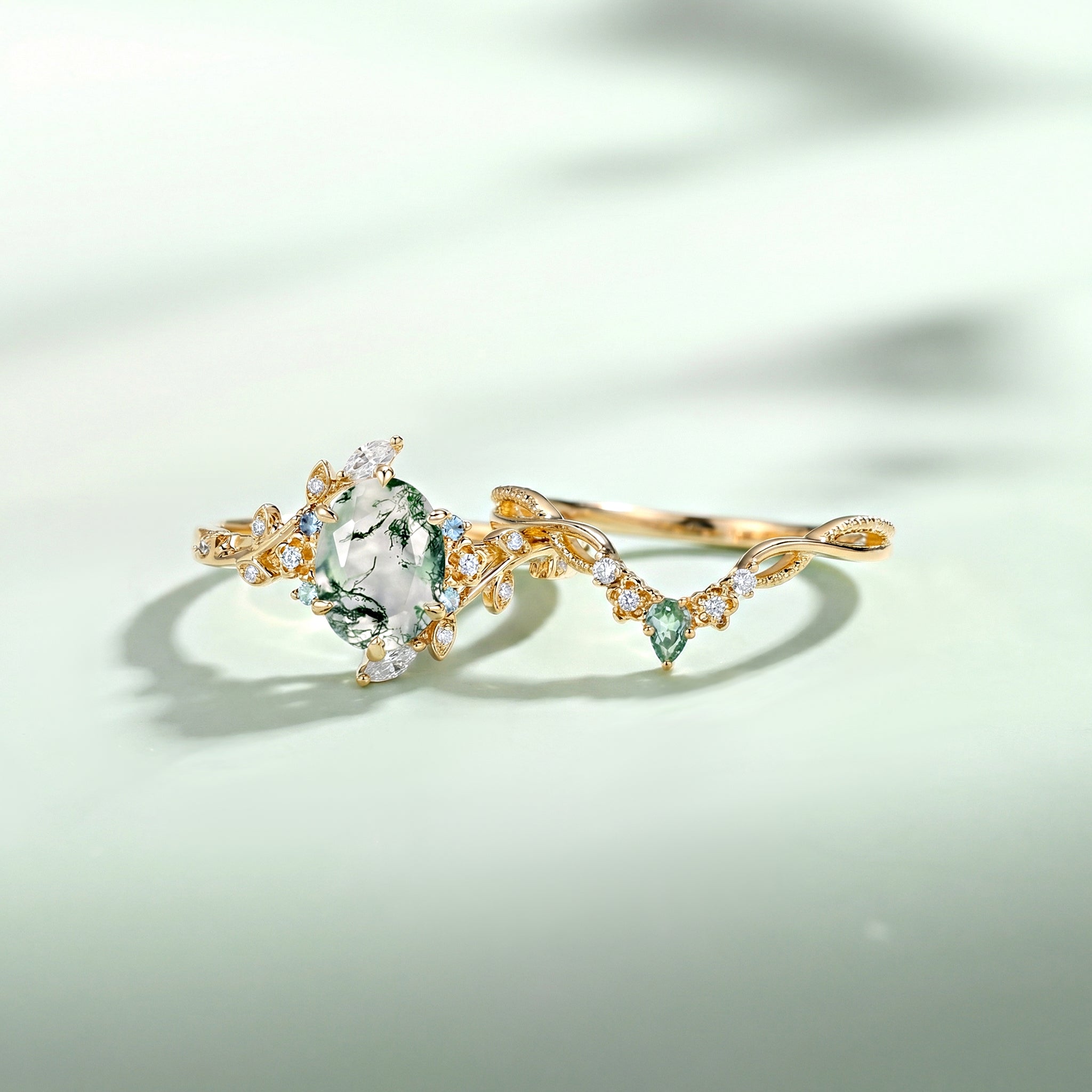 Moss Agate Oval Cut Leaf Ring Set 2pcs - Callista