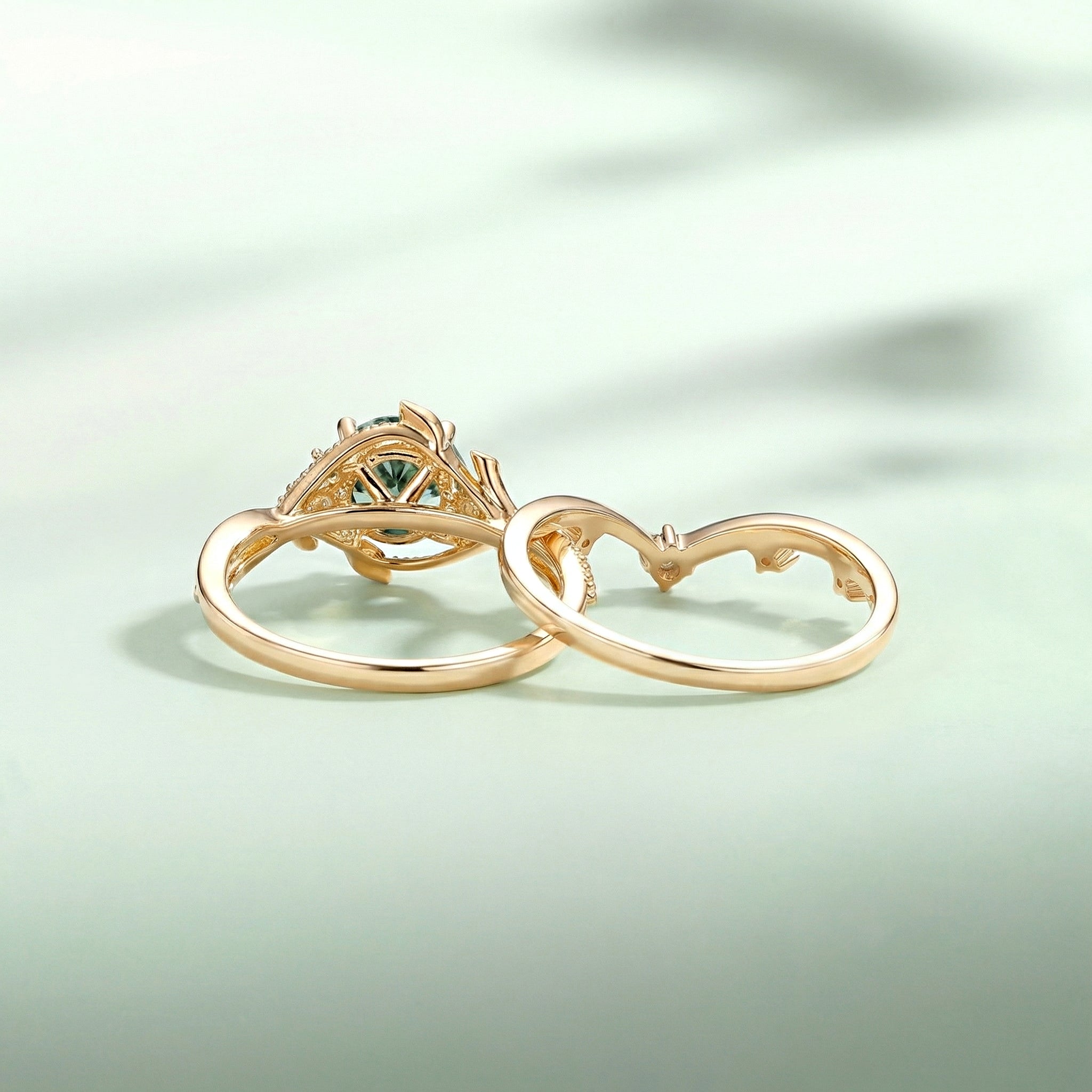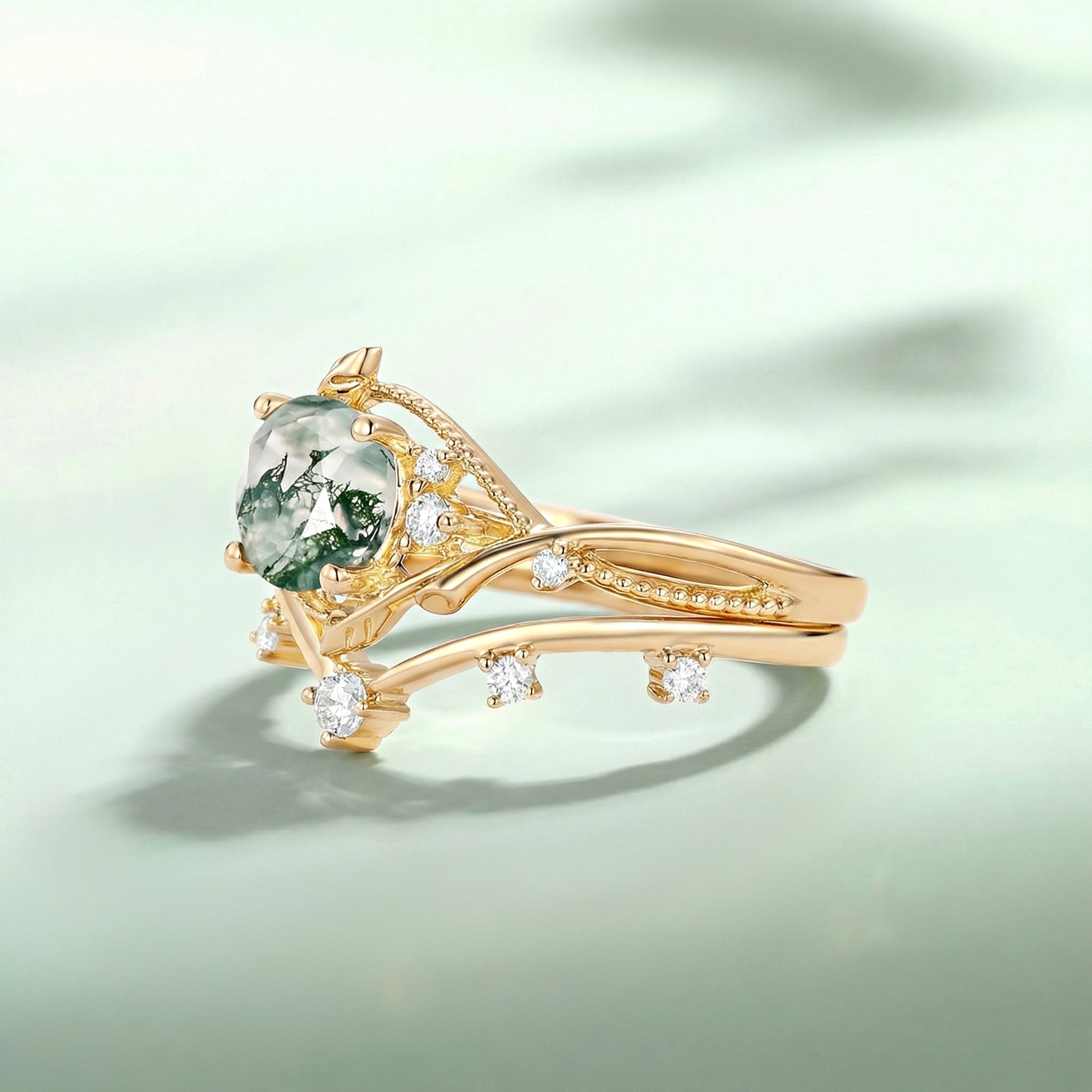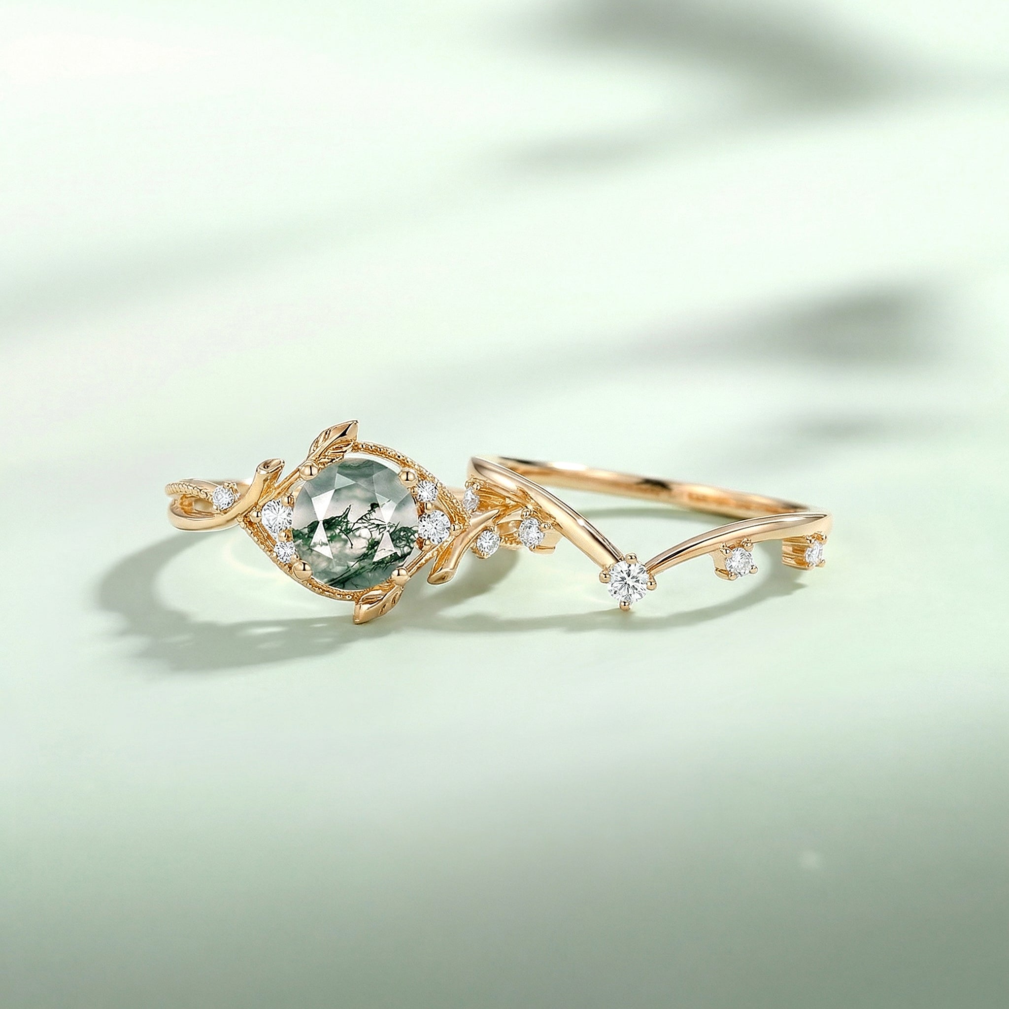 Round Cut Leafy Moss Agate Engagement Ring Set 2pcs- Vyrra