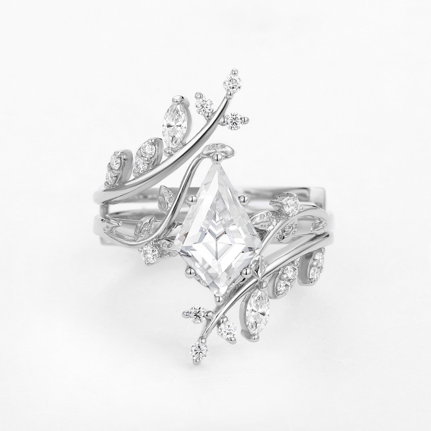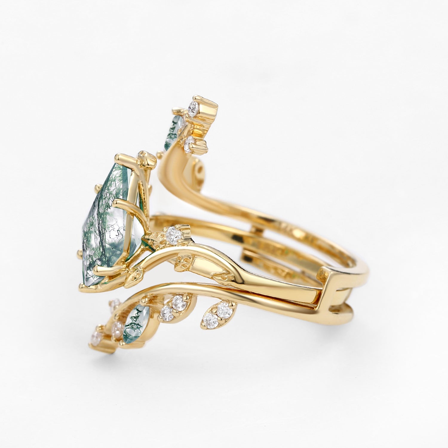 Featuring a kite-cut moss agate center stone surrounded by hand-engraved vines, the main ring structurally interlocks with its cage band. Like a vine that grows stronger as it climbs, true love embraces life’s twists with unwavering grace. This ring honors love not as a static gem, but as a living bond—rooted in commitment, yet ever-evolving.