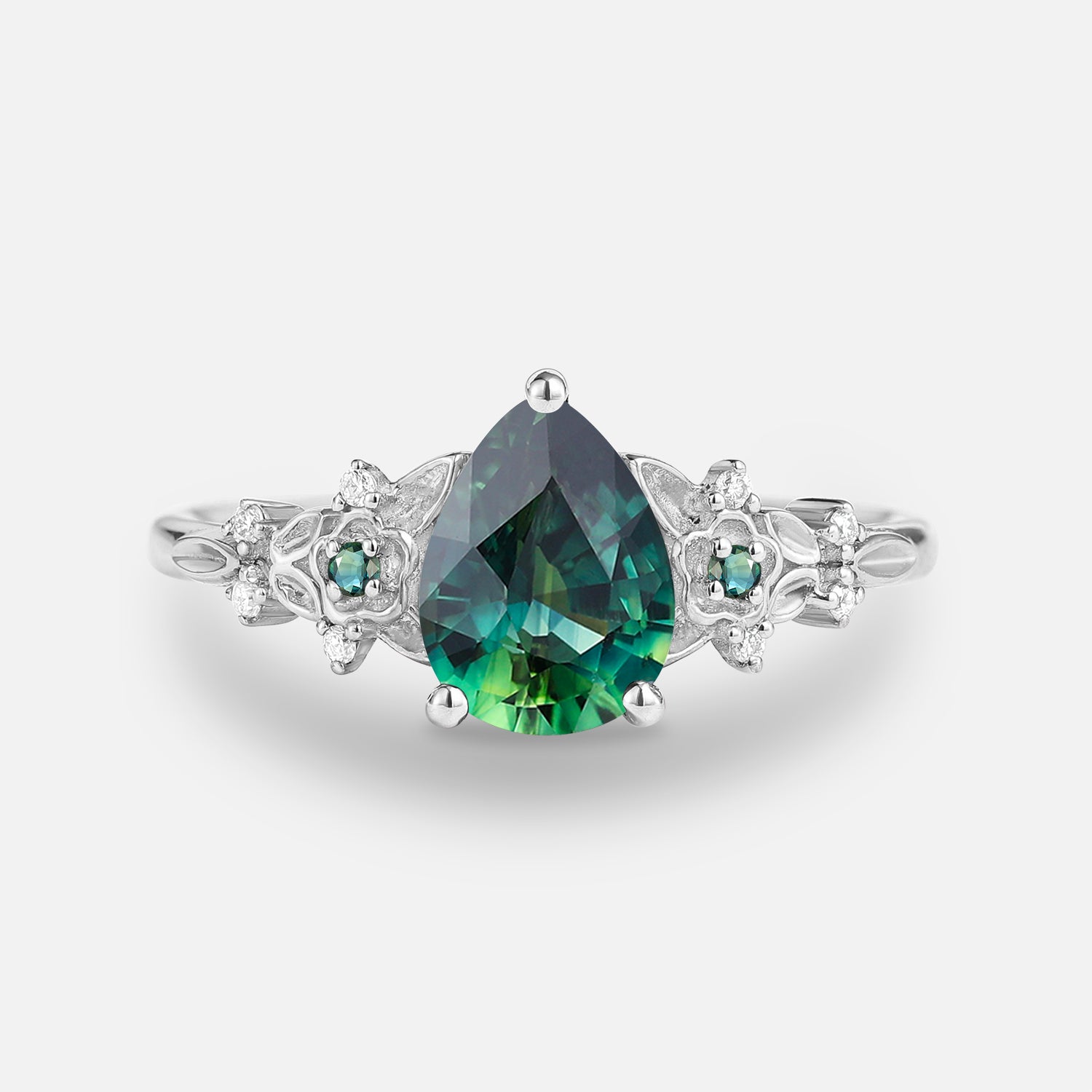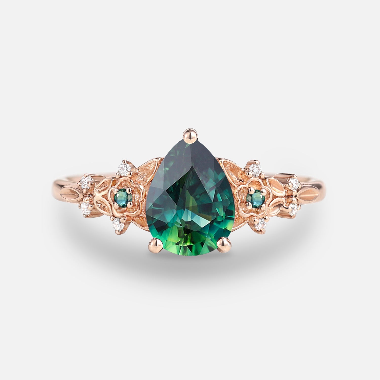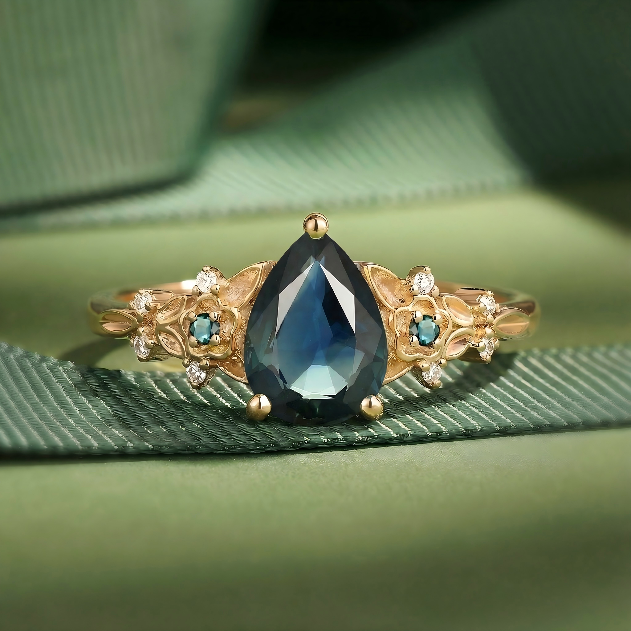 Black Gold Pear Shaped Teal Sapphire Flower Engagement Ring