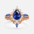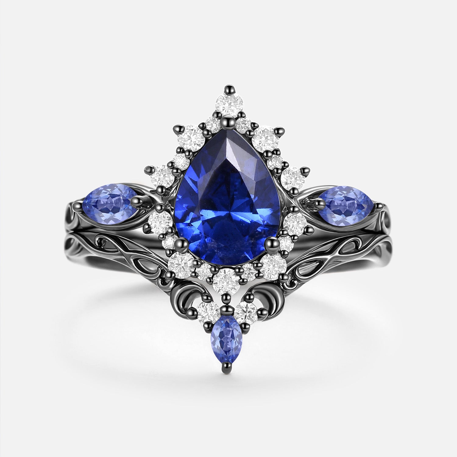 Pear Shaped Lab Sapphire Halo Ring Set 2pcs - Zenn