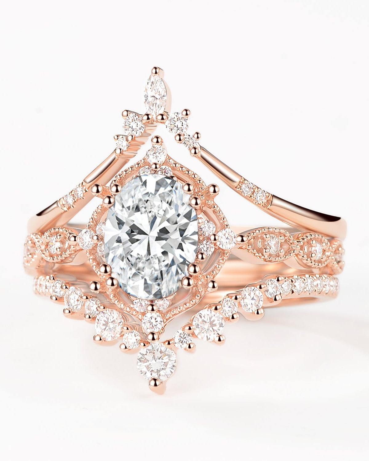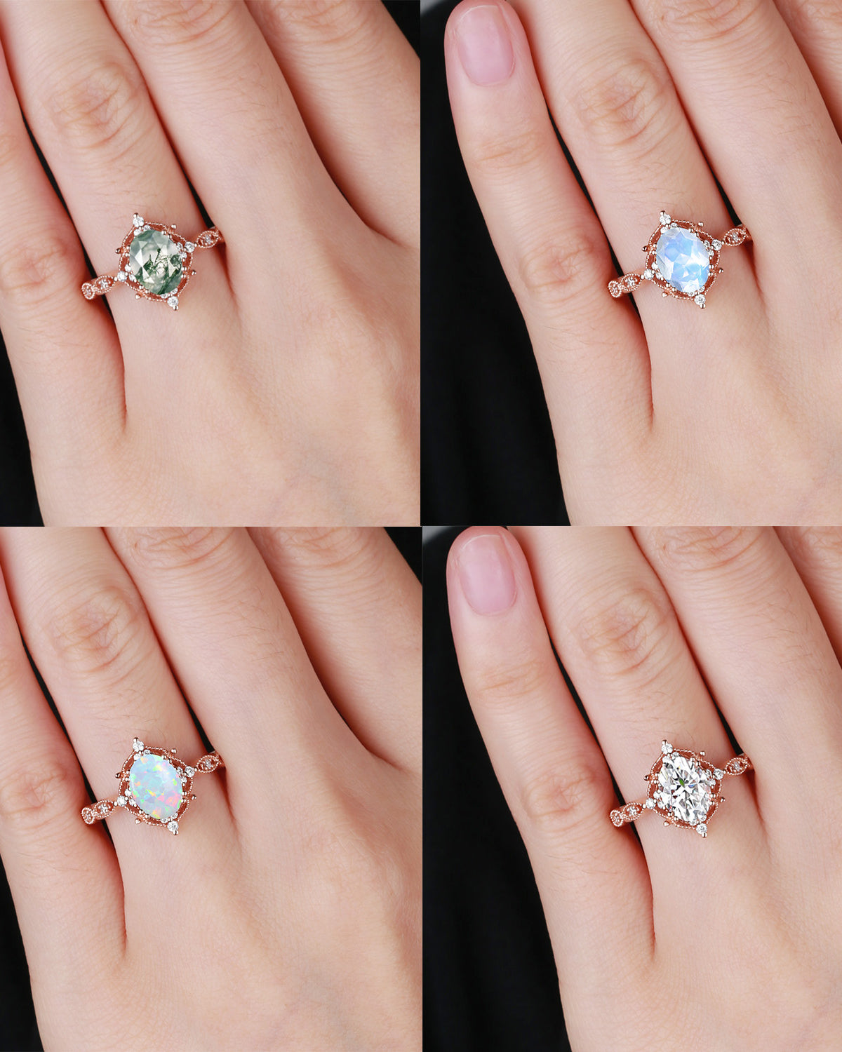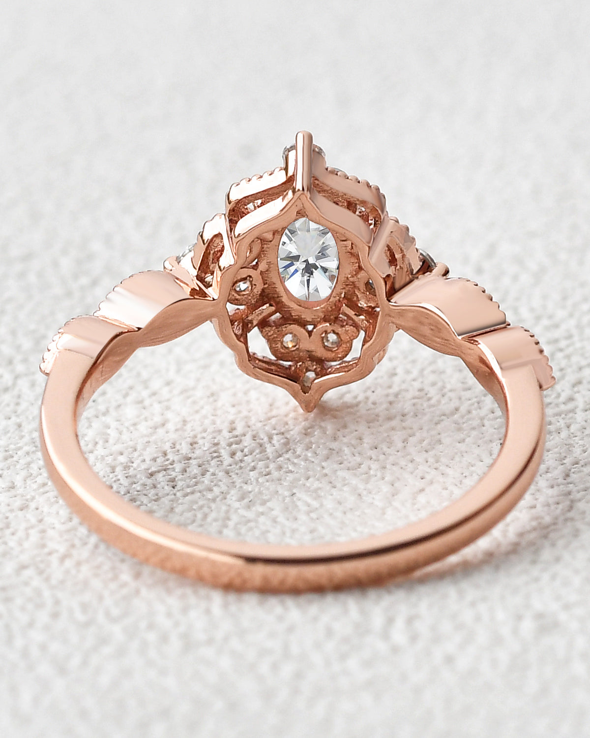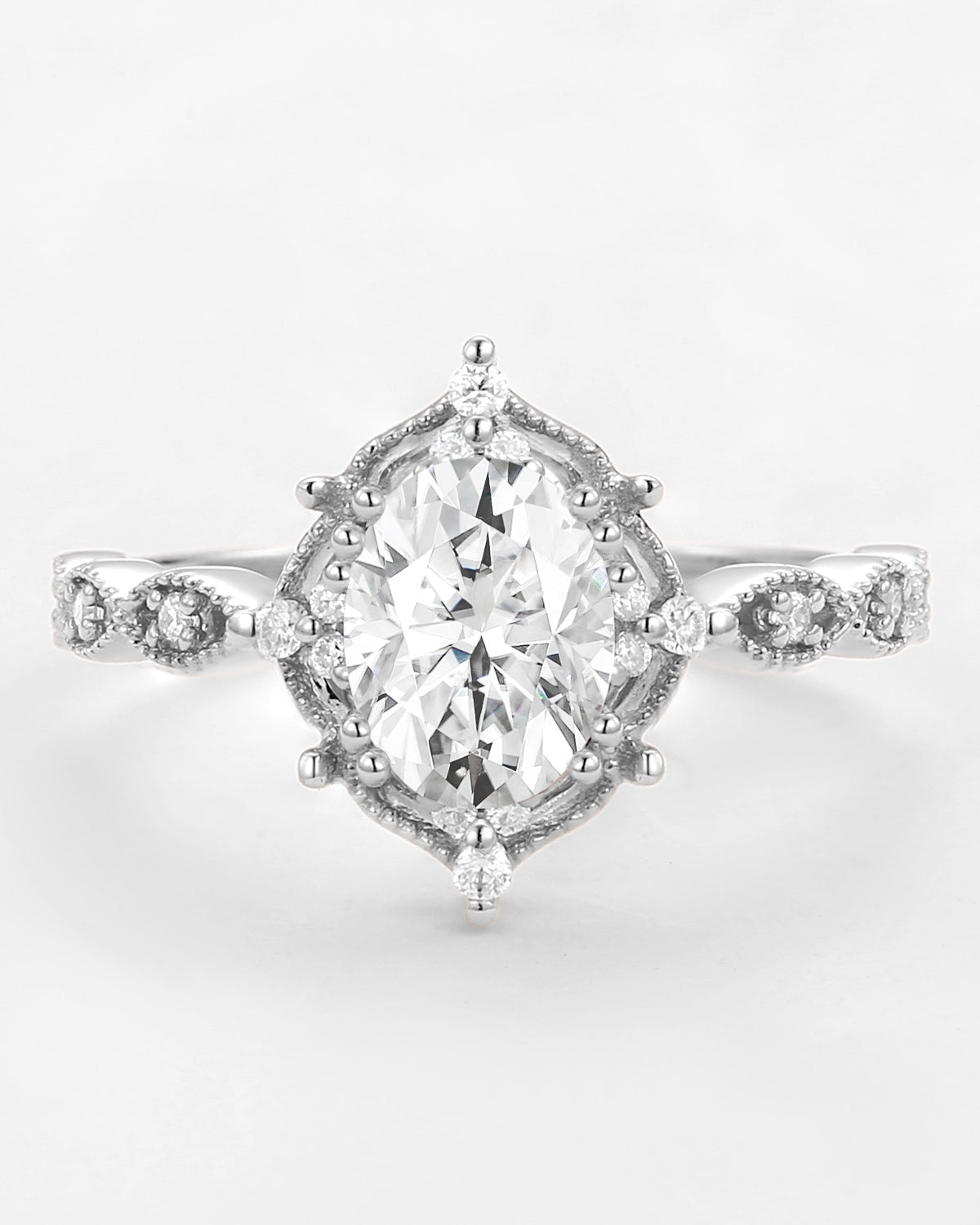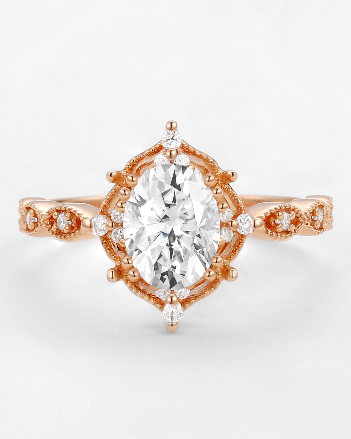 The Signature Vintage ring setting is surrounded by delicate milgrain band, making it visually soft and light. The oval engagement rings and the moissanite vintage wedding rings resembles lace, creating a dreamy and beautiful, lazy yet full of romantic atmosphere. Vintage moissanite engagement rings are luxurious and gorgeous, and it has a highly artistic touch, presenting a subtle and retro beauty.