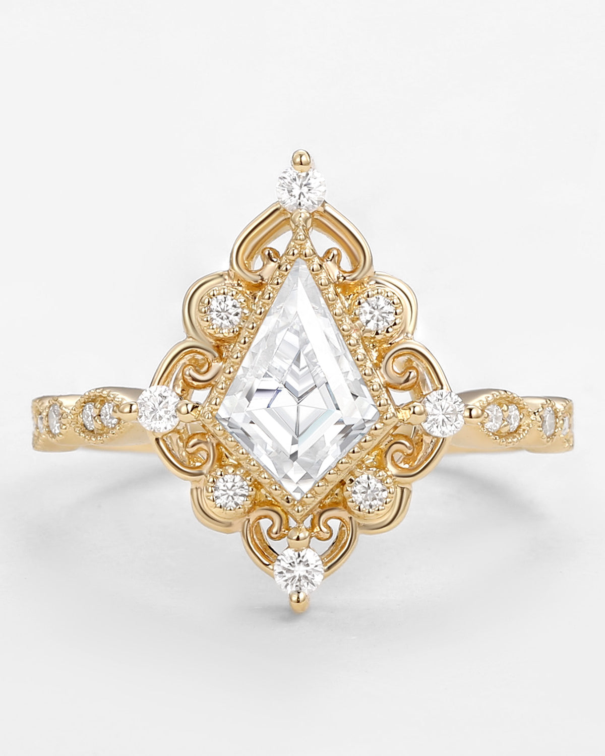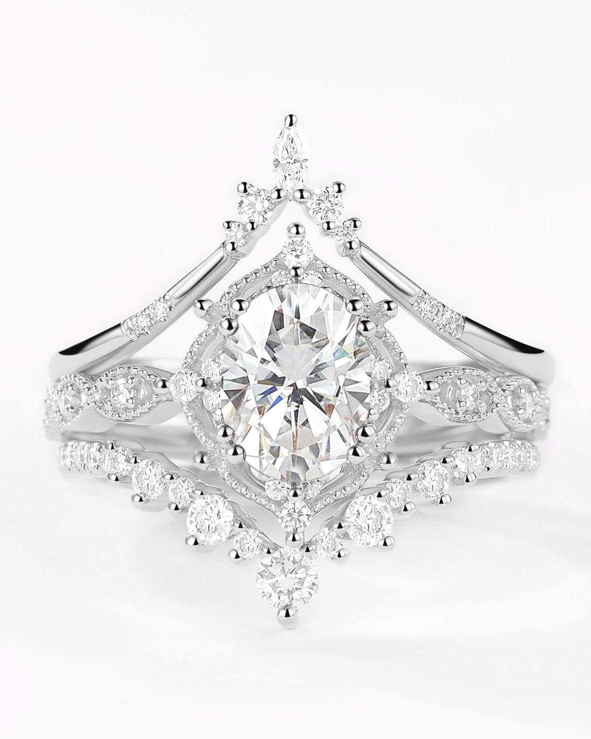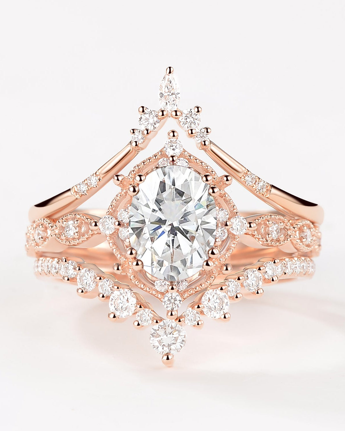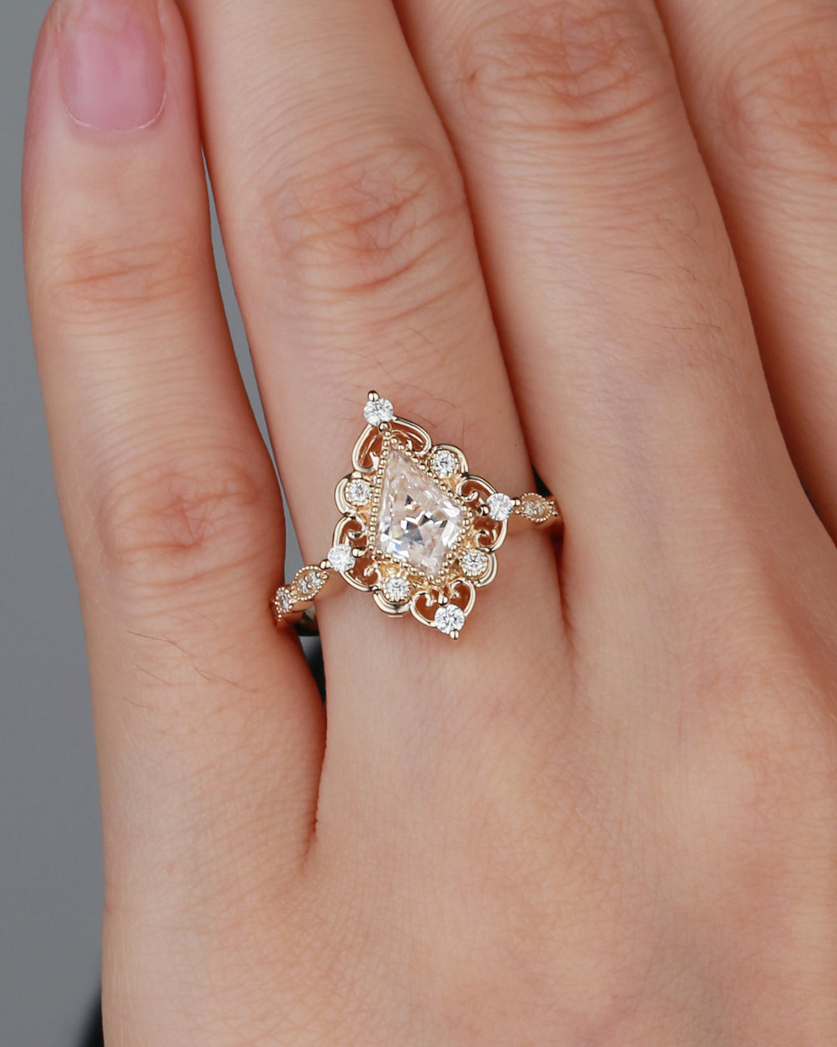 The Signature Vintage ring setting is surrounded by delicate milgrain band, making it visually soft and light. The oval engagement rings and the moissanite vintage wedding rings resembles lace, creating a dreamy and beautiful, lazy yet full of romantic atmosphere. Vintage moissanite engagement rings are luxurious and gorgeous, and it has a highly artistic touch, presenting a subtle and retro beauty.