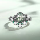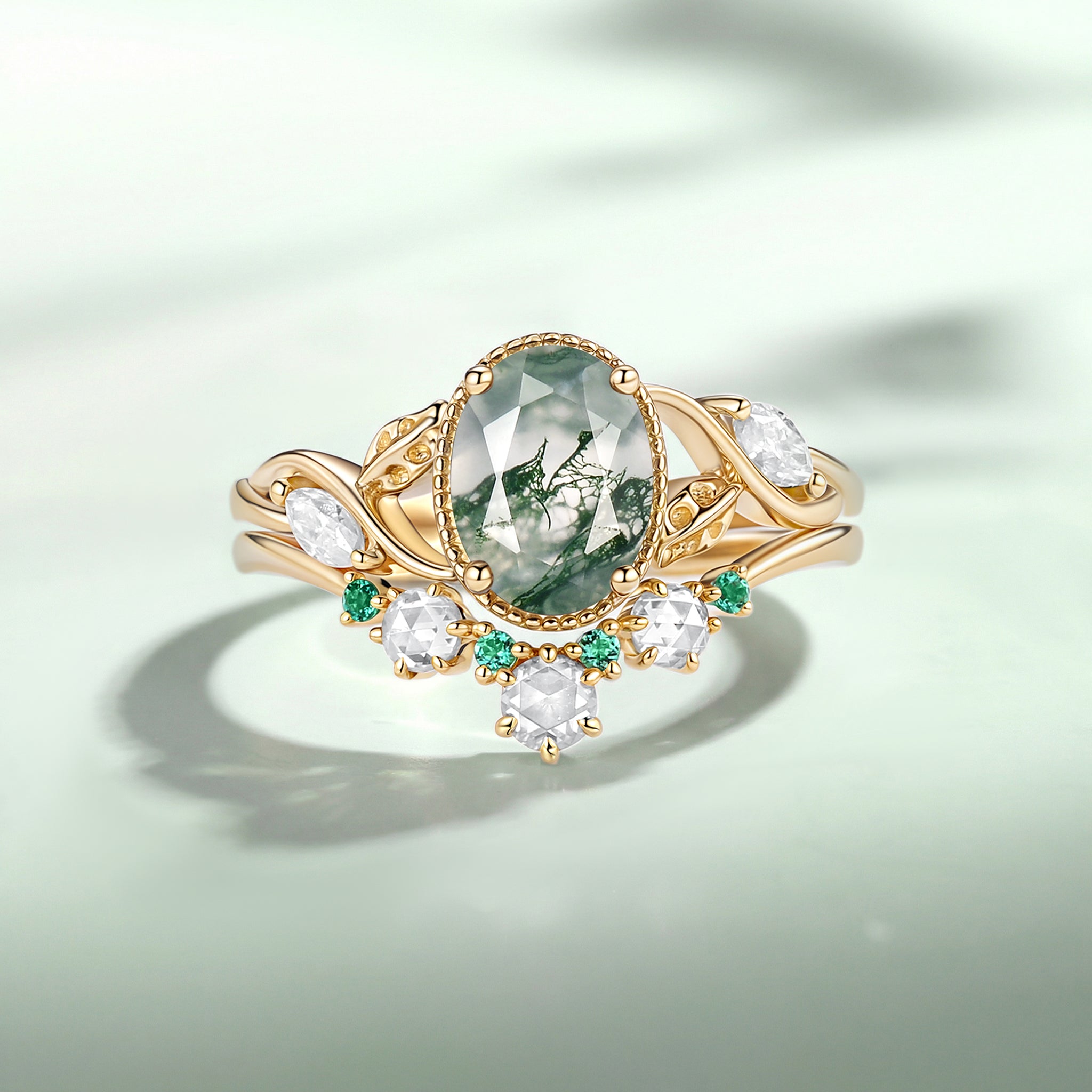 Moss Agate & Lab Emerald Oval Cut Leaf Ring Set 2pcs - Lora