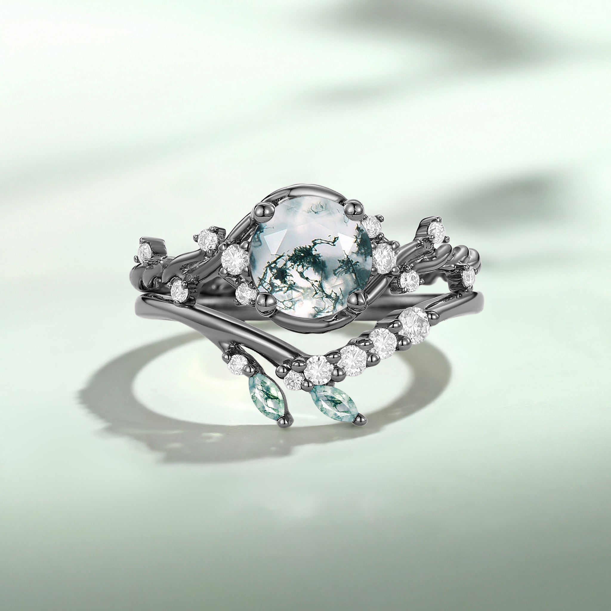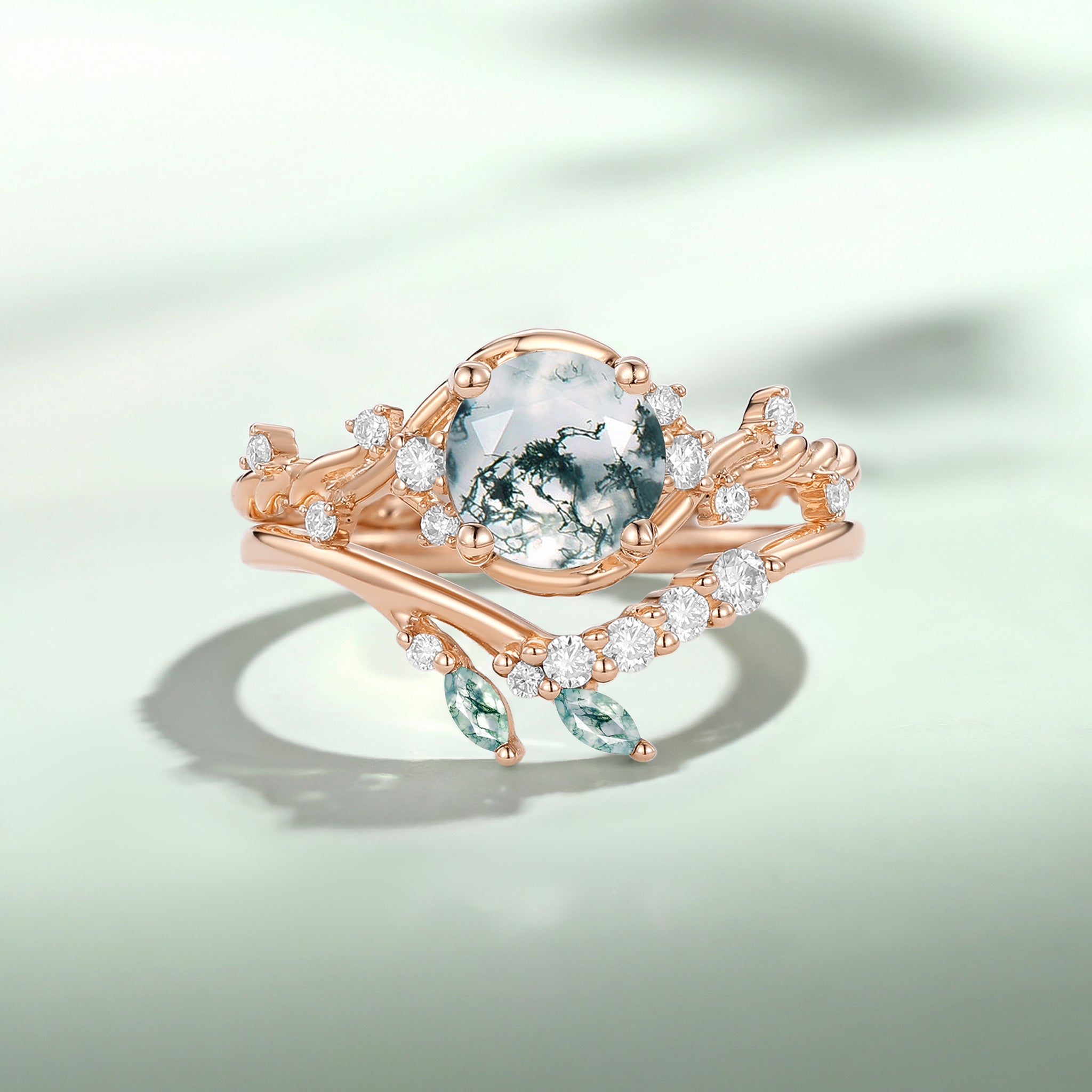 Round Cut Leafy Moss Agate Twist Engagement Ring Set 2pcs- Tess