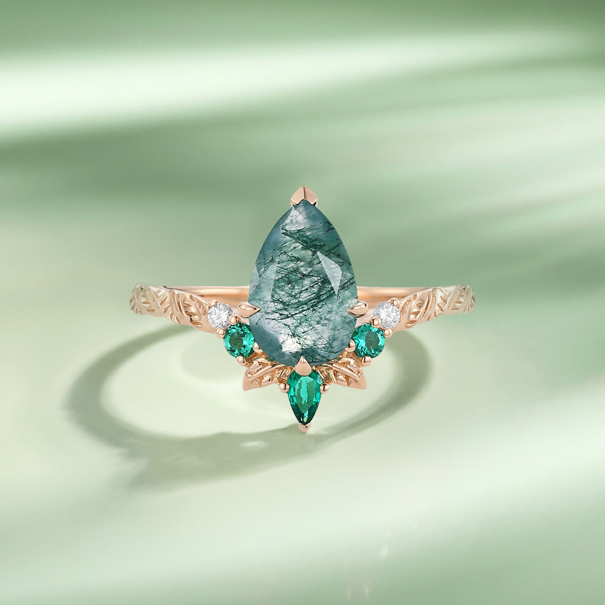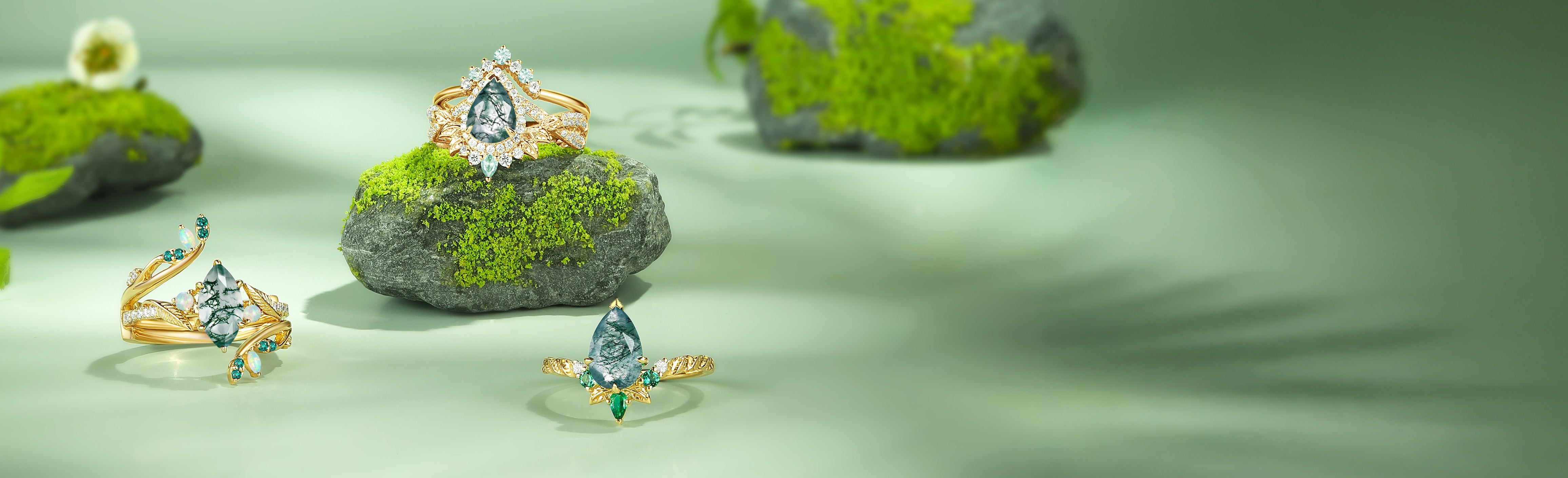 Drawn from the lush depth of summer, this series features rich green moss agate alive with nature’s energy. The band wraps like overlapping leaves, etched with fine veins—simple, spirited, and full of life. Wearing this ring is a shared promise. It’s that moment in the early sun when you choose to turn the page together, a gentle reminder that every start feels warmer when not faced alone.