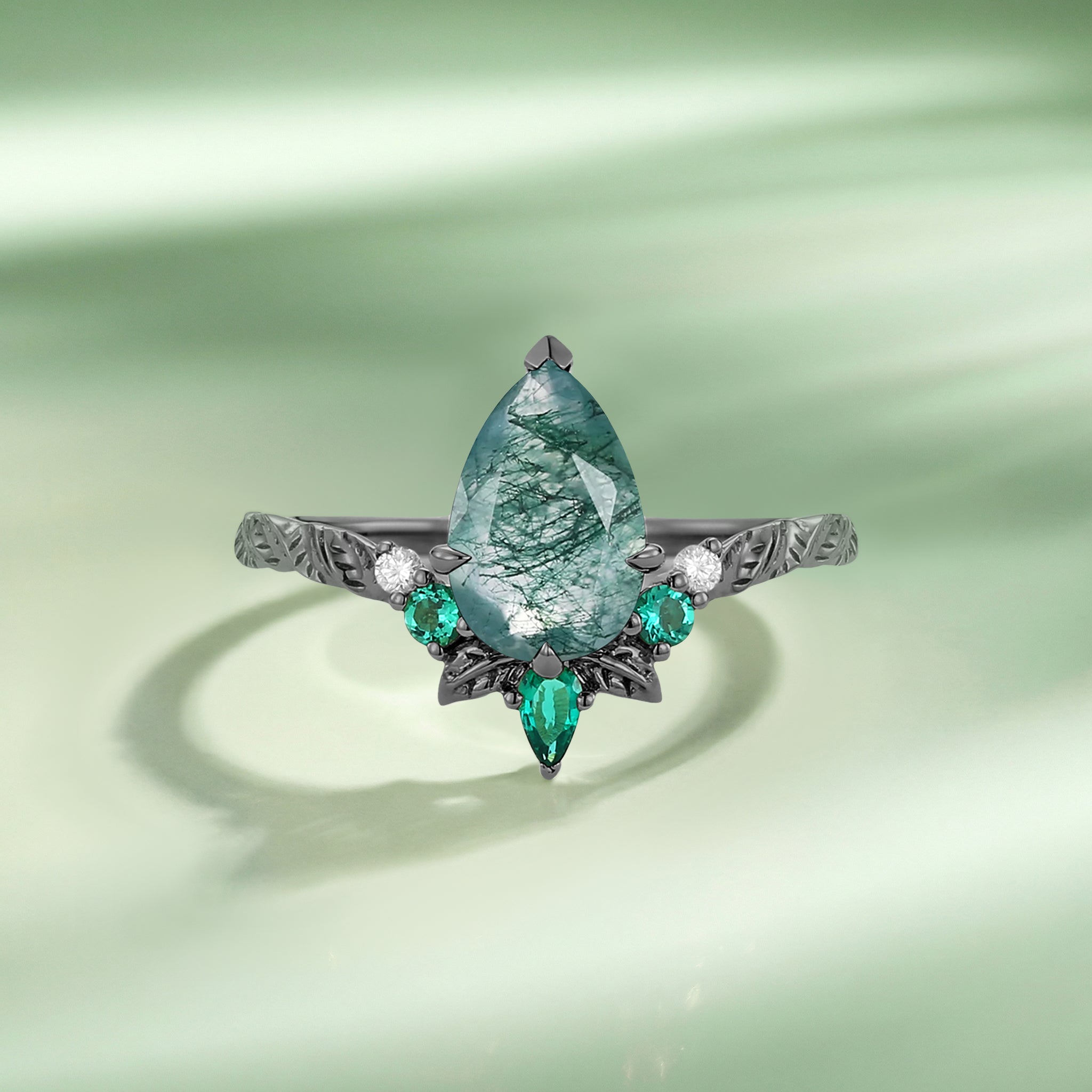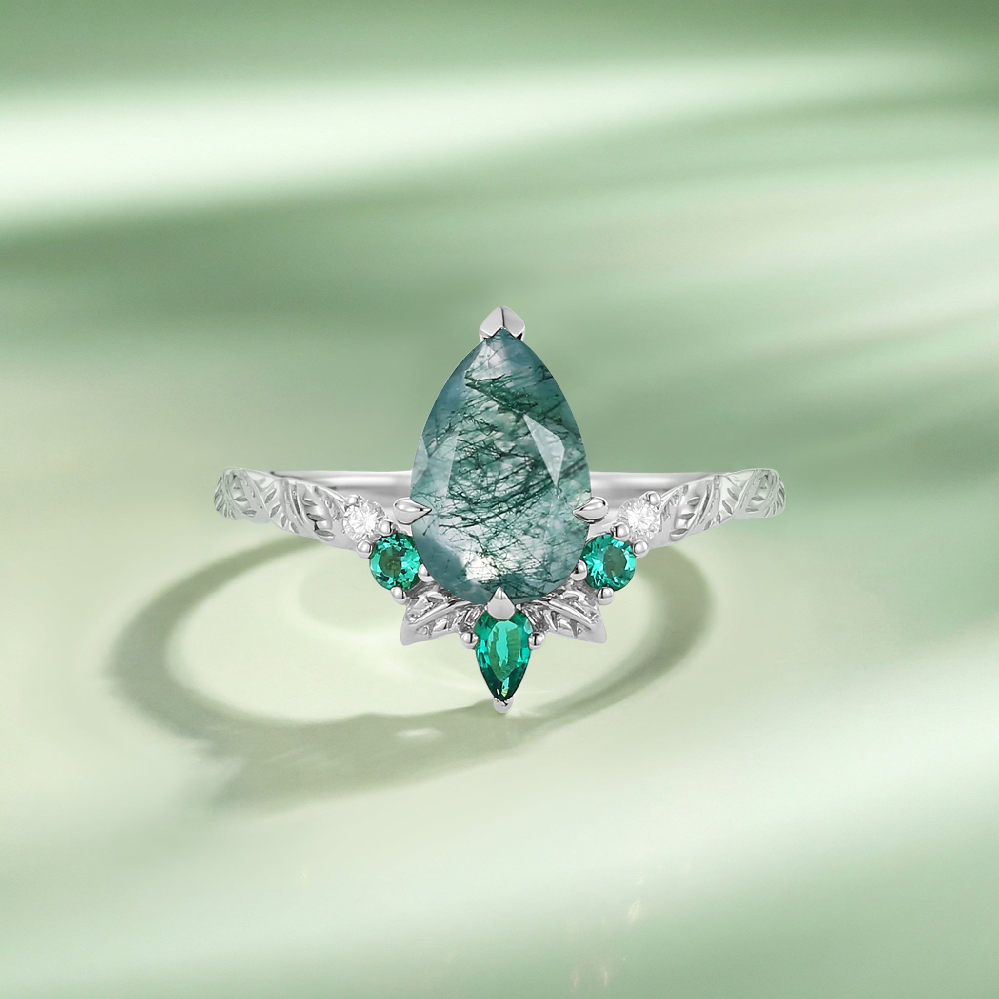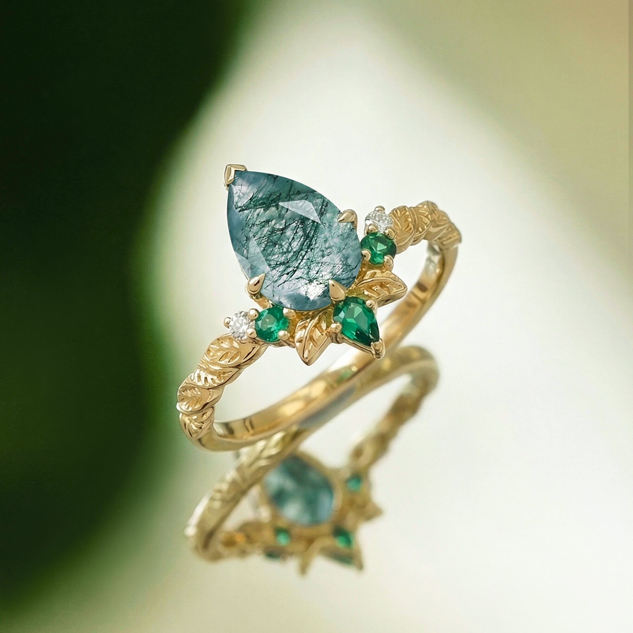 Pear Cut Moss Agate Leafy Engagement Ring - Sirael