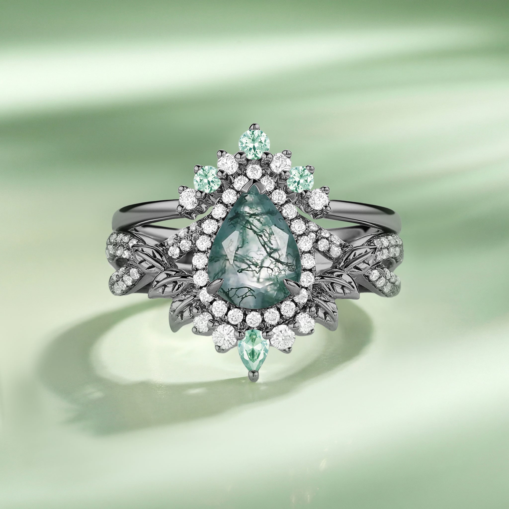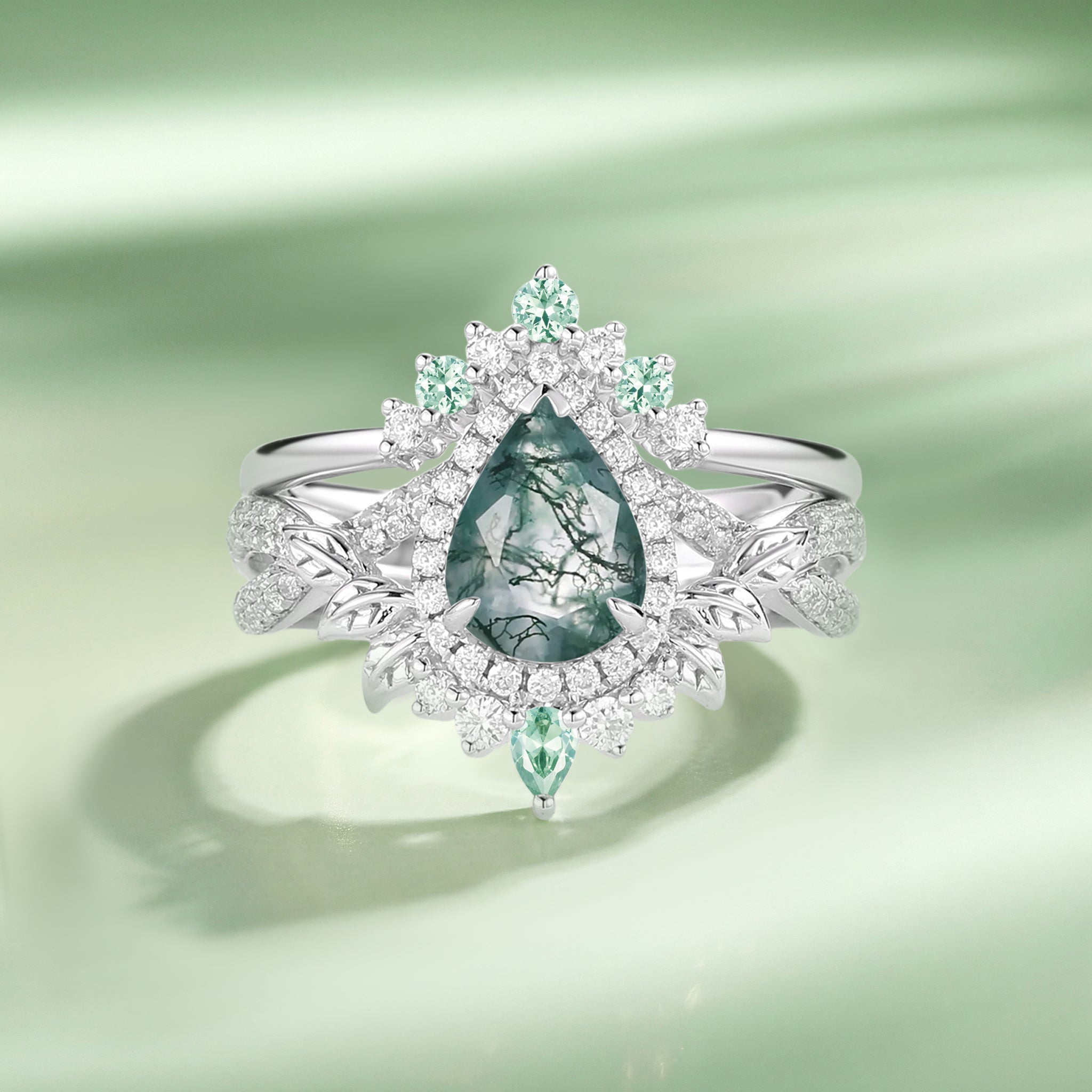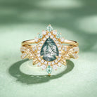 Pear Cut Moss Agate Leafy Engagement Ring Set 2pcs - Celia