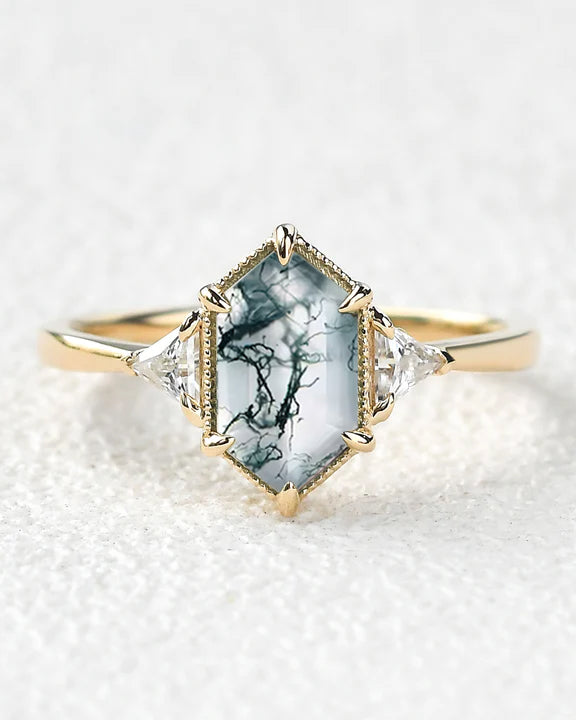 Each design centers on a one-of-a-kind moss agate, its swirled green inclusions and soft translucence resembling tiny frozen landscapes; no two stones are the same, just like your unique love. Flanking this focal gem are two complementary accents, turning the piece into a three-stone set that honors love’s past (shared memories), present (current joy), and future (the forever you promise).
