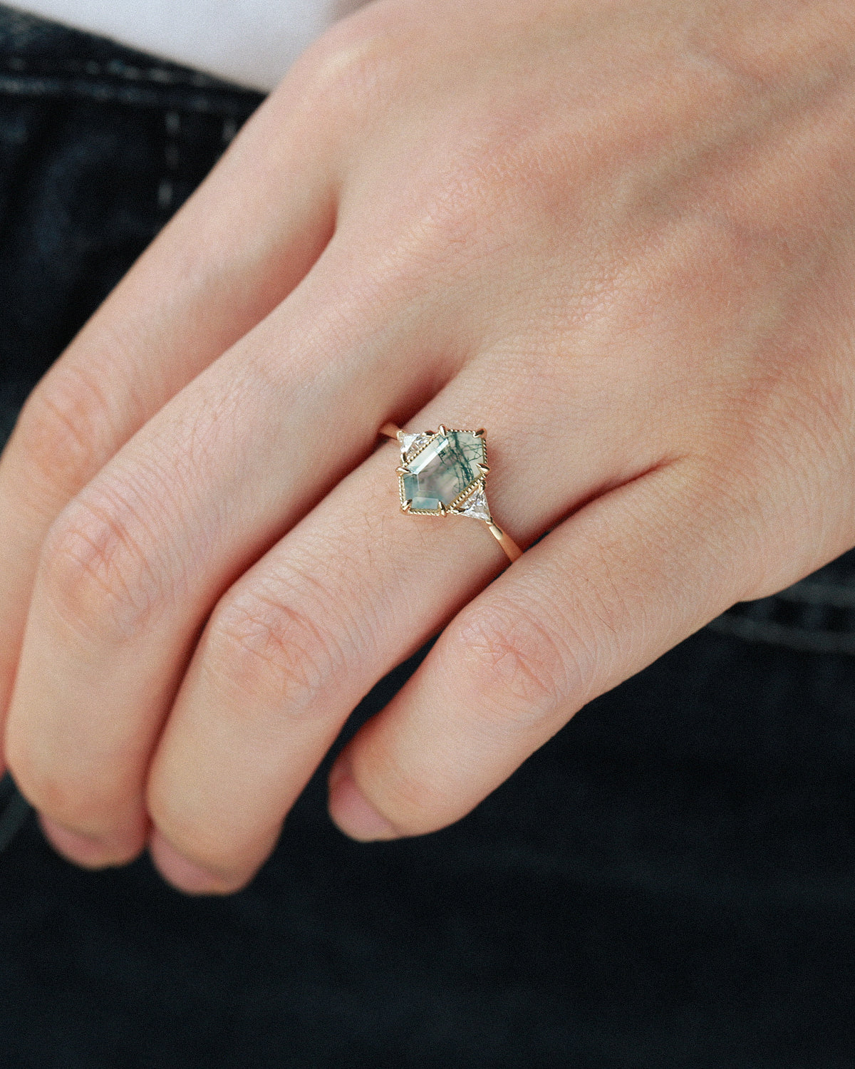 Three stone moss agate rings marry timeless symbolism with the organic beauty of nature—making them a heartfelt choice for an engagement ring.
