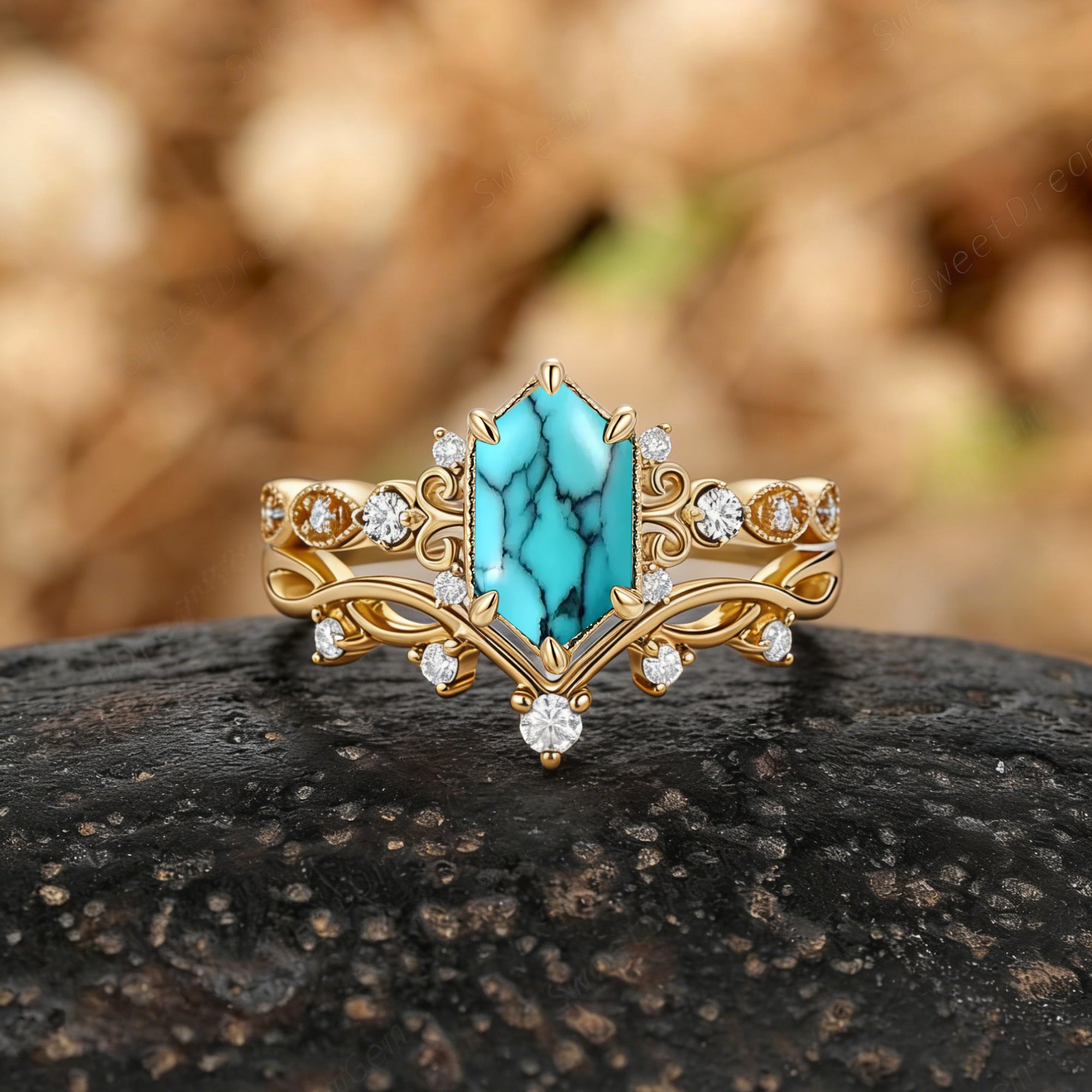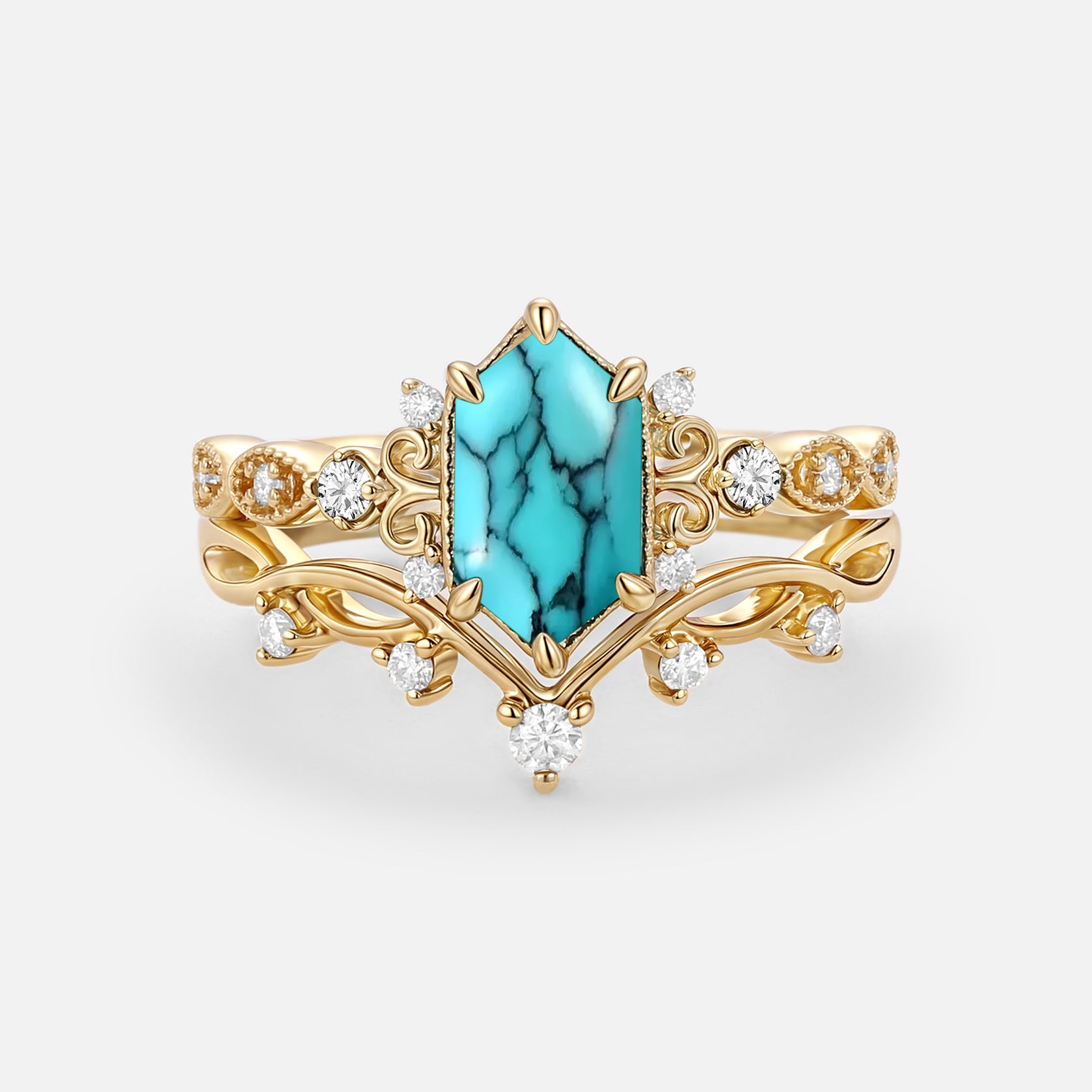 Long Hexagon Turquoise Engagement Ring Set 2pcs - Beryl
