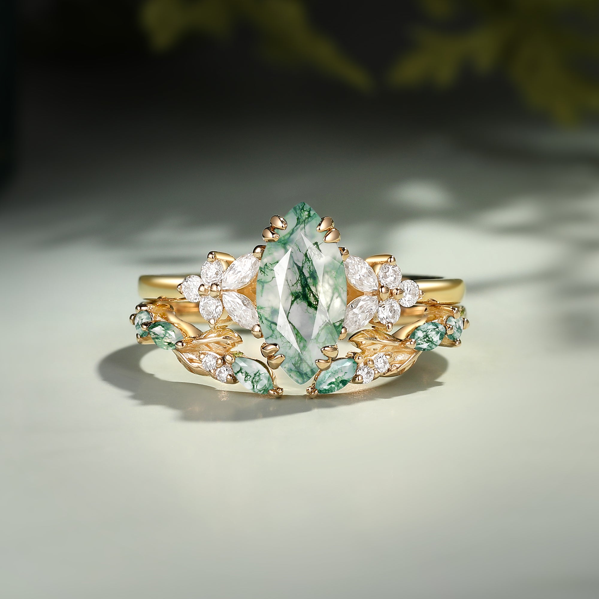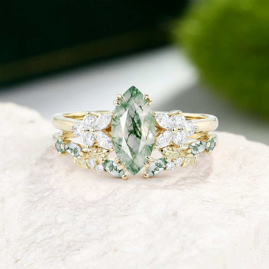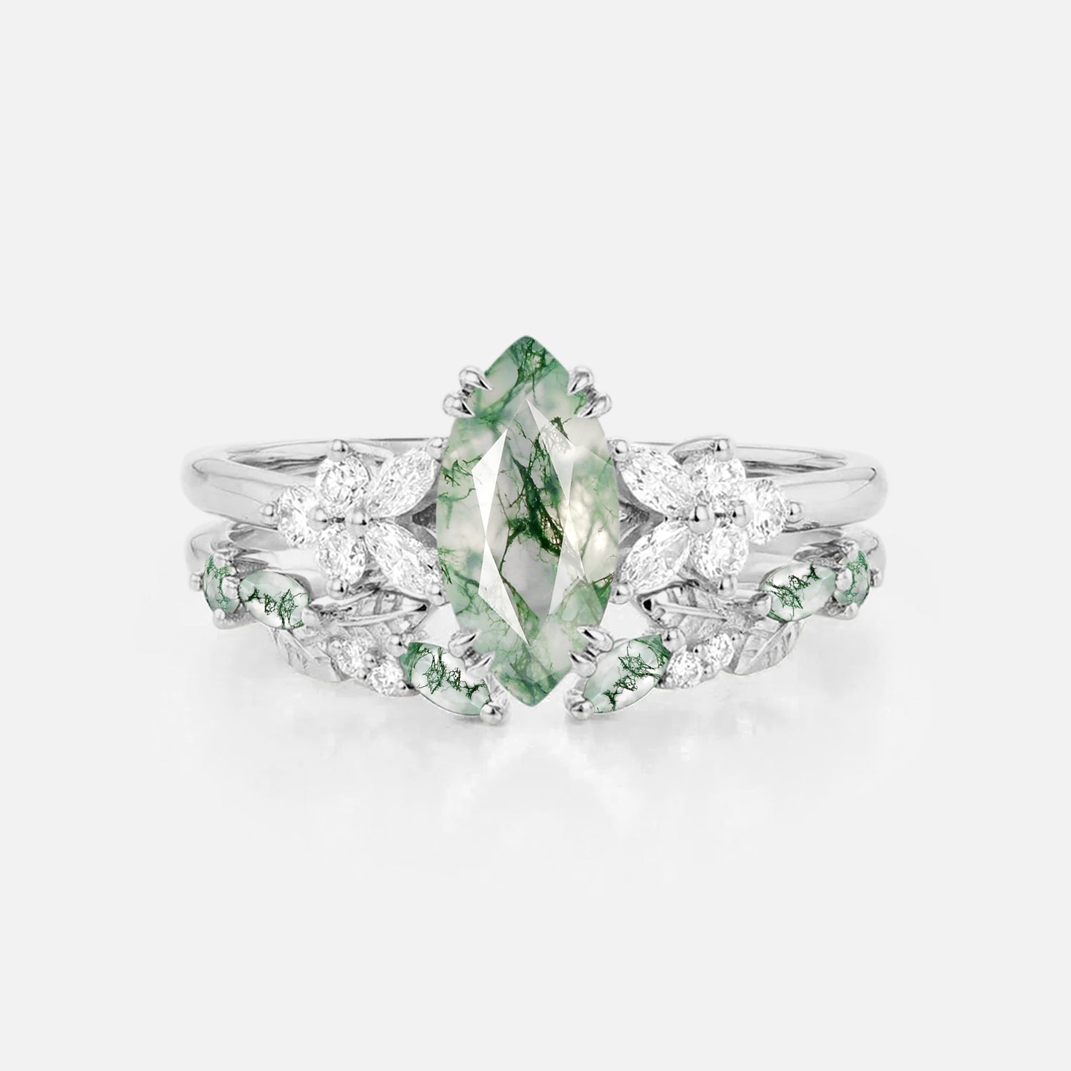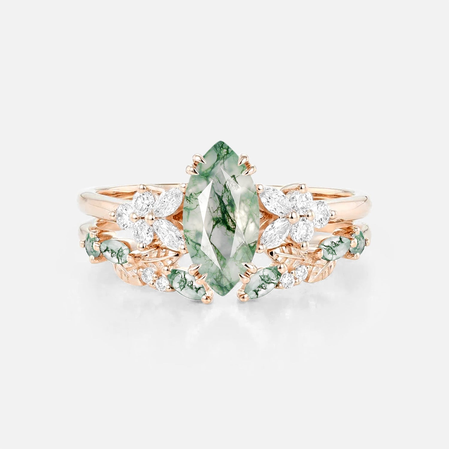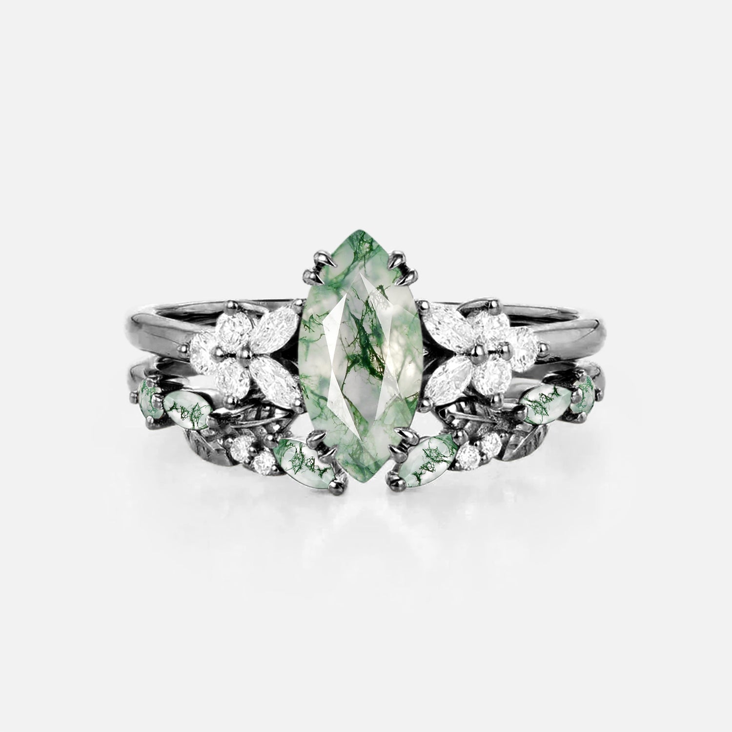 Marquise Moss Agate Leafy Engagement Ring Sets 2pcs - Arbor