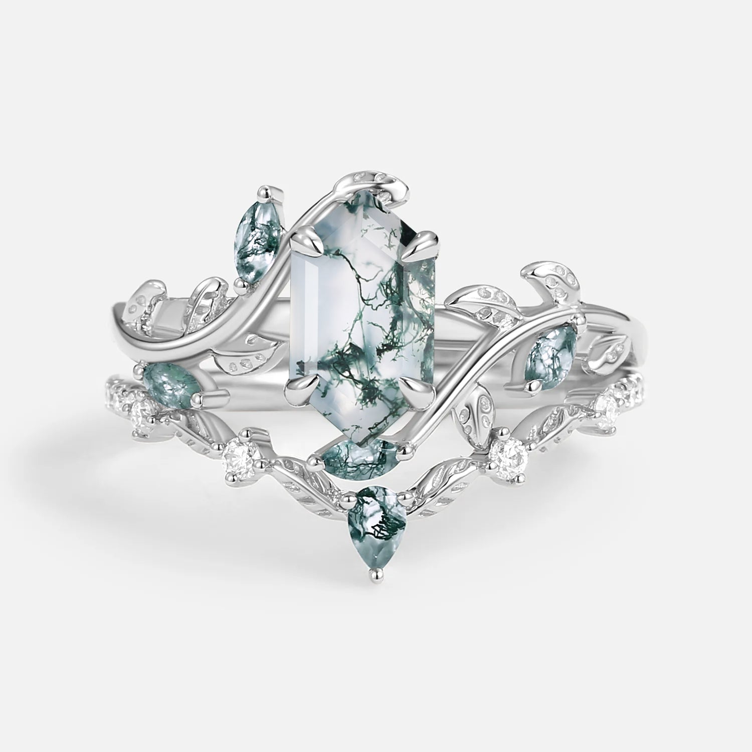 The One-of-a-Kind unique engagement rings features Kite shaped and hexagon stones. The Moss Agate engagement rings are one of these unique engagement rings for women, each with different textures, and you can find unique affordable engagement rings here in felicegals . Break the traditional matching rules and find a natural stone that represents your unique love, commemorating your one-of-a-kind love story.